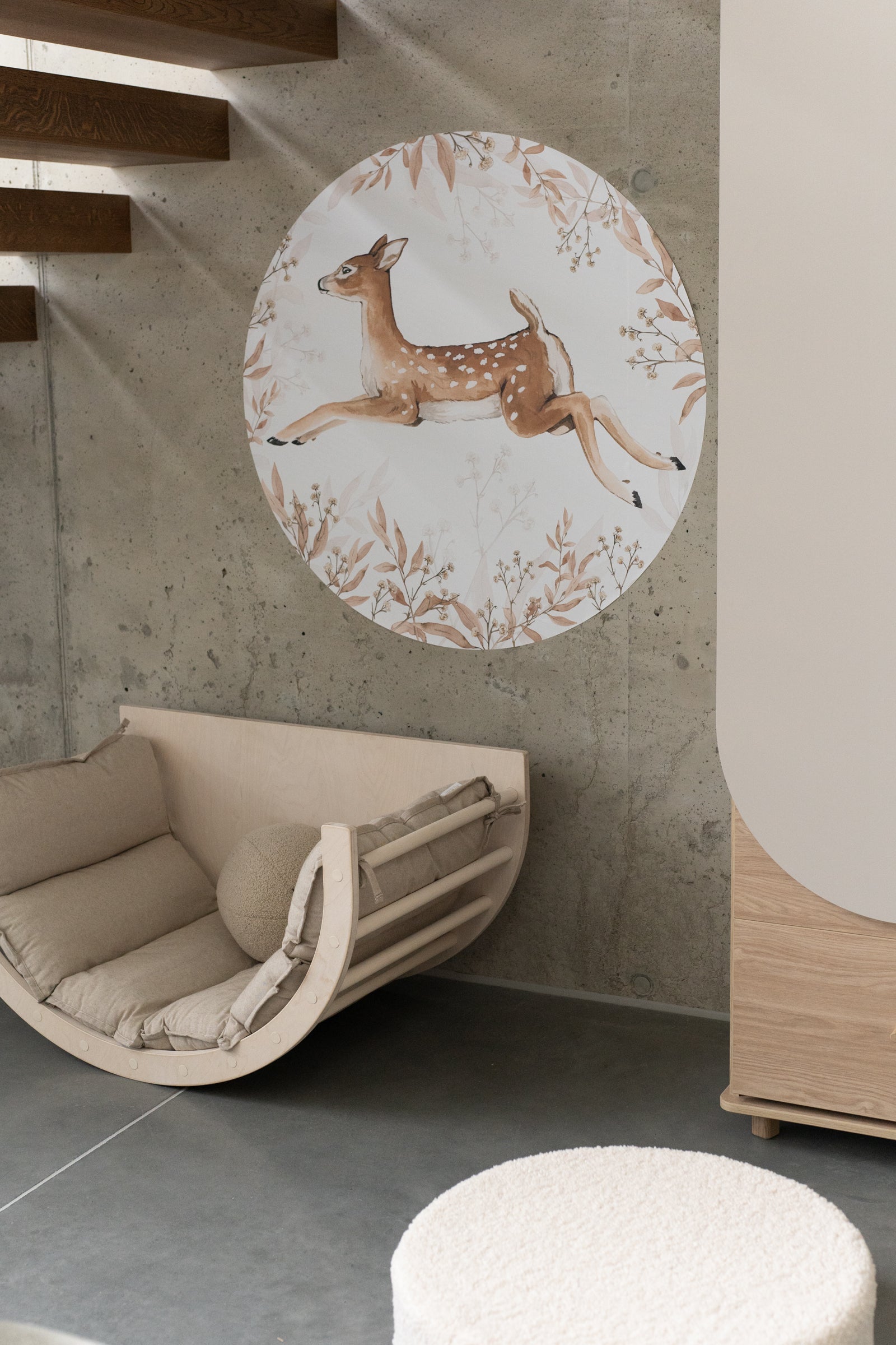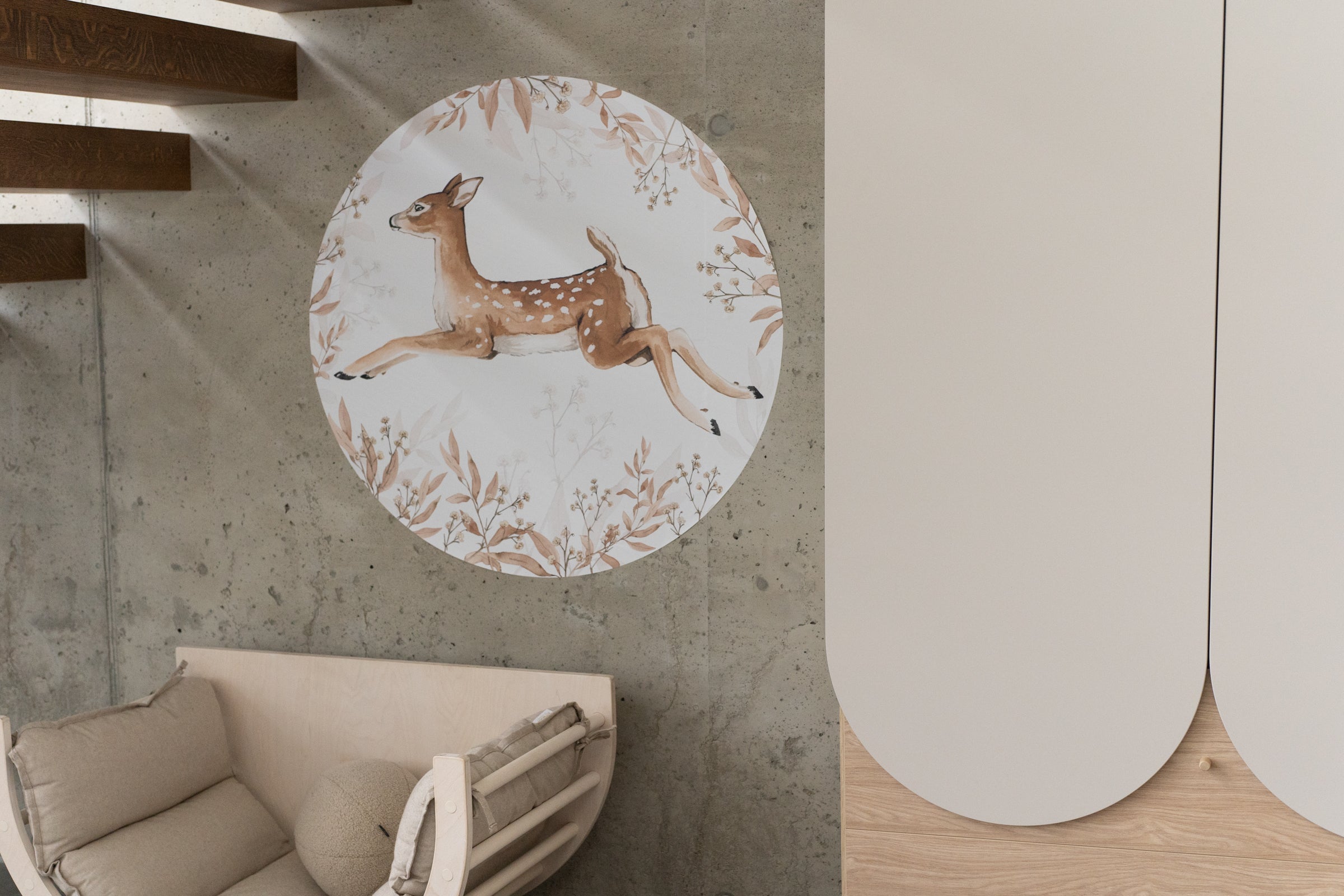 Bring gentle woodland charm to your child’s space with the Deer in the Forest wall sticker – a beautifully illustrated round decal featuring a bounding fawn surrounded by delicate, botanical elements. Soft, earthy tones create a peaceful and inviting atmosphere, perfect for nurseries and children’s rooms. This wall sticker is a perfect alternative to traditional wallpaper – it’s easy to apply, removable without damage, and made from high-quality, fire-safe materials. Transform your child’s room in just a few minutes with this magical and calming design. Material Matte, self-adhesive PVC (95 μm) Washable and fade-resistant EN 13501-1 B-s2-d0 fire safety certified Safe for children’s spaces Available sizes Round Ø 100 cm Round Ø 120 cm Application Peel & stick – no tools or glue needed For smooth, clean walls or furniture Full instructions: Processing time 5–10 business days * Please note: Our wall stickers are printed to order and are therefore non-returnable, unless there is a defect or a mistake in printing. If you experience any issue with your order, please contact us and we will be happy to help. Perfect for: Woodland-themed nurseries Nature-inspired kids’ rooms Gender-neutral baby interiors Calm and cozy nursery corners Scandinavian or boho-style spaces
