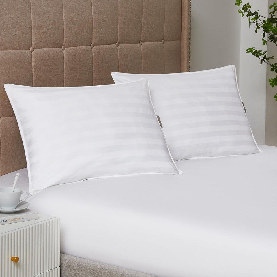 This rectangular sleeping pillow is a perfect addition for your bedroom. It features a white outer cover with subtle light – gray horizontal stripes and neat white – stitched edges. Filled with a lofty, extra – soft material, it’s crafted for stomach sleepers to provide unparalleled comfort and support during sleep.