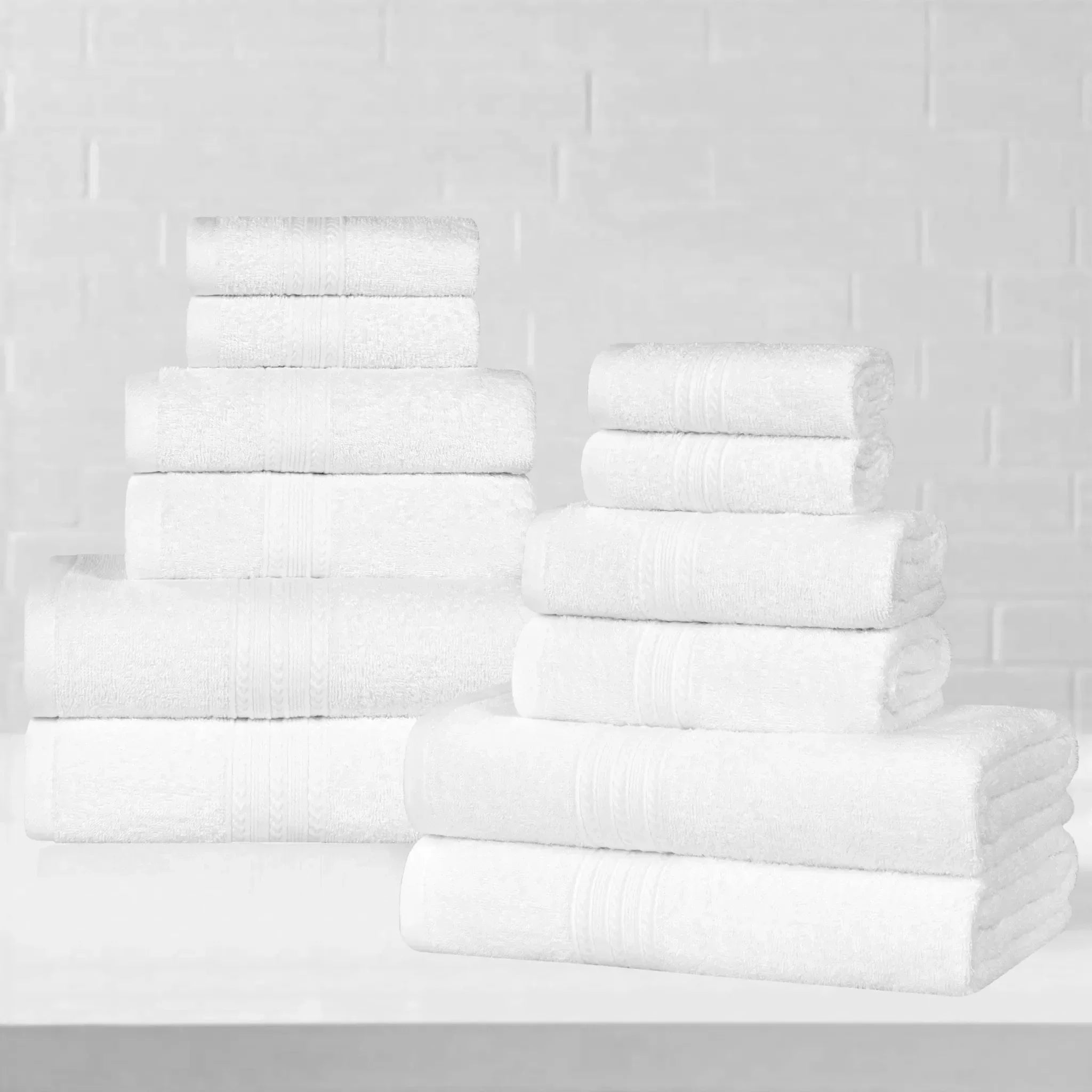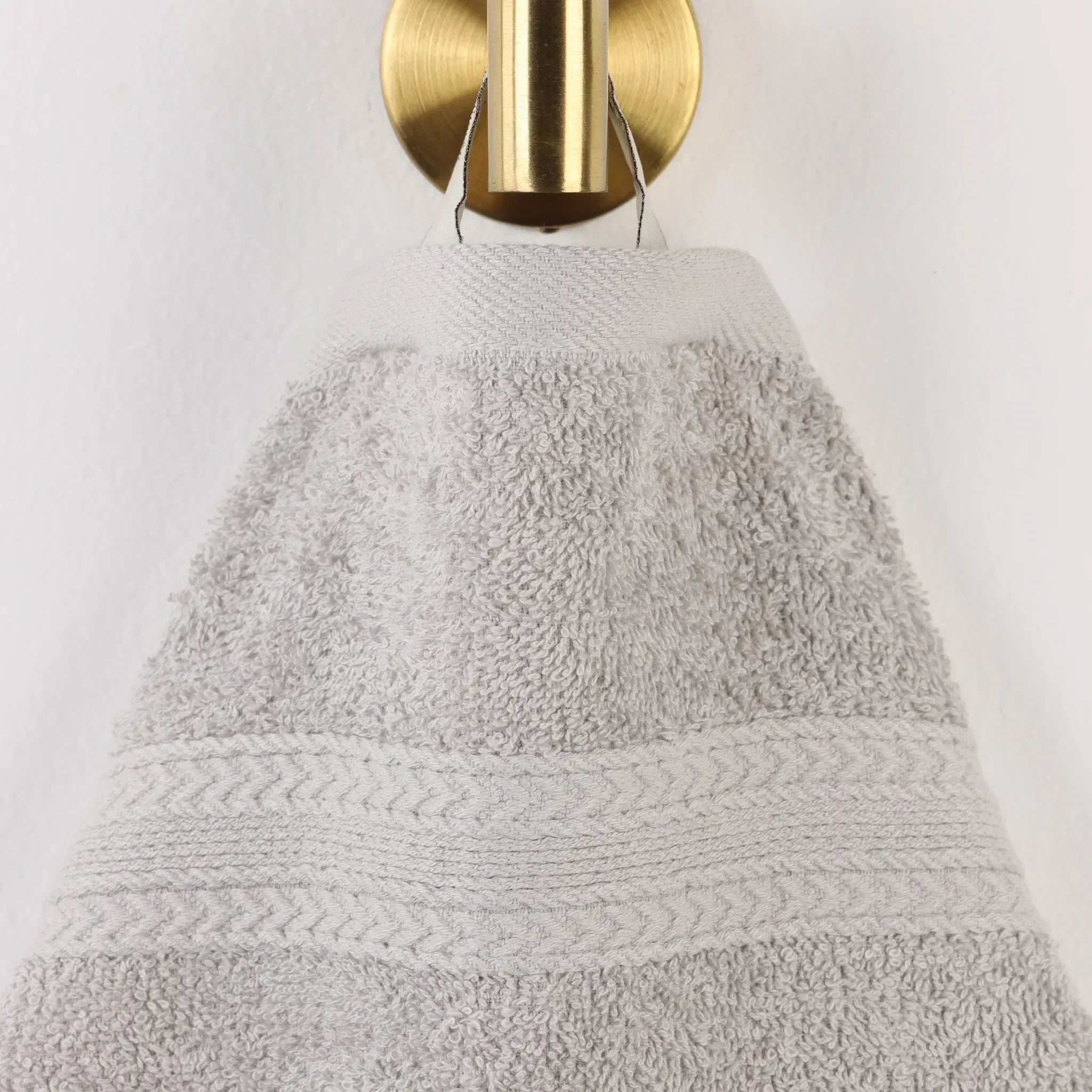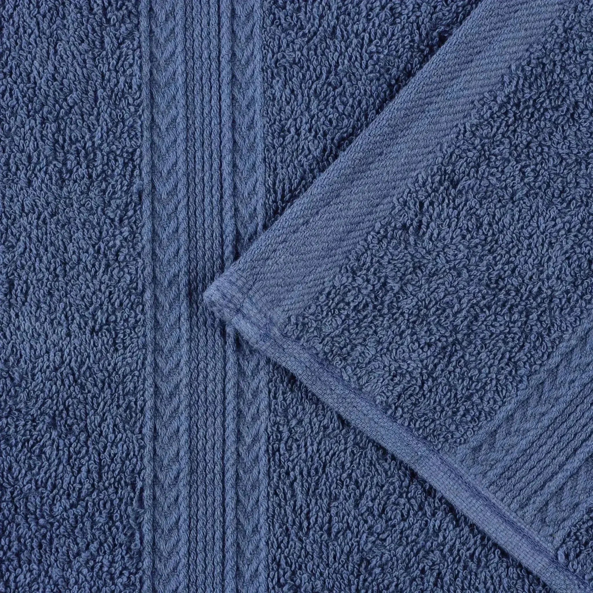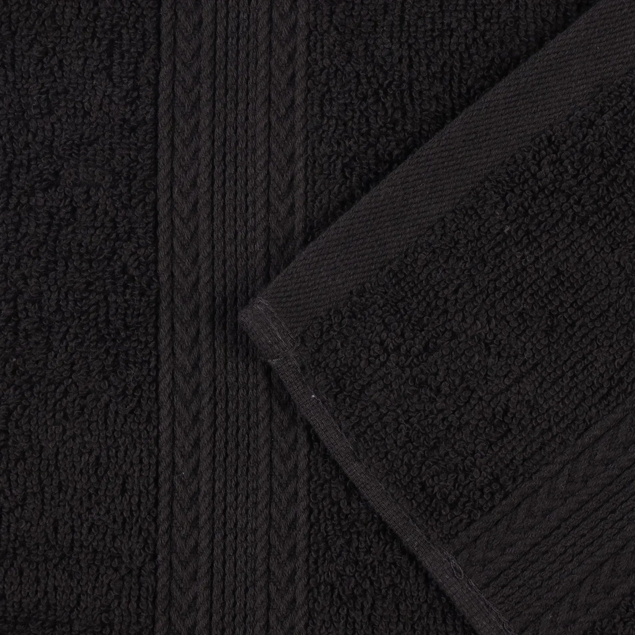 This is a set of bath towels made from 100% cotton. It comes in multiple sizes including large bath towels, medium hand towels, and small washcloths. The towels feature a decorative woven cable or herringbone pattern on the edges, adding both style and durability. They are available in a wide range of vibrant solid colors.