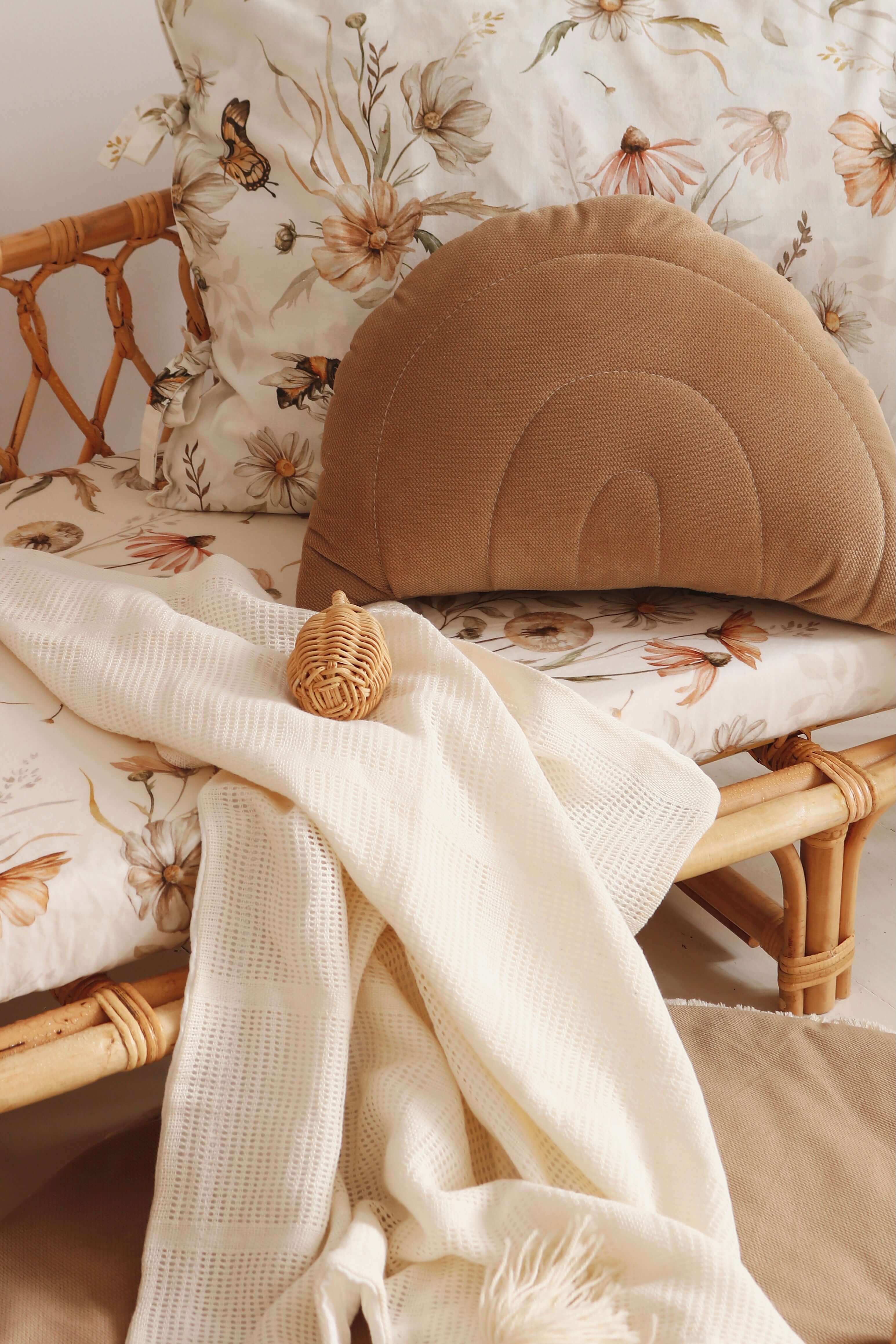 Wrap your little one in softness with our Lovely Ecru crib blanket. Handmade from two beautiful natural fabrics — openwork cotton on one side and soft muslin on the other — it combines texture, breathability, and timeless style. The calm ecru tone adds warmth and elegance to any nursery, perfect for creating a cozy, neutral space. Lightweight yet warm, this blanket is ideal for cribs, naps, or stroller walks during cooler days. Product Details • Material: 100% cotton (openwork cotton + cotton muslin) • Color: Ecru • Size: 80 × 100 cm (fits crib 70 × 100 cm) • Finishing: Double-sided, lightweight, breathable • Production time: 1–3 business days • Made in: The Netherlands — handmade by Matuu Care Instructions • Machine wash at 30°C (gentle cycle) • Do not tumble dry • Air dry flat • Do not bleach Perfect For • Cribs, naps, or stroller walks • Baby shower or newborn gift • Neutral and timeless nursery styling • Everyday use — soft, cozy, and breathable comfort