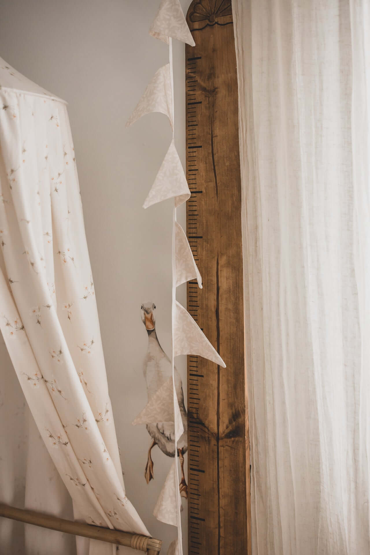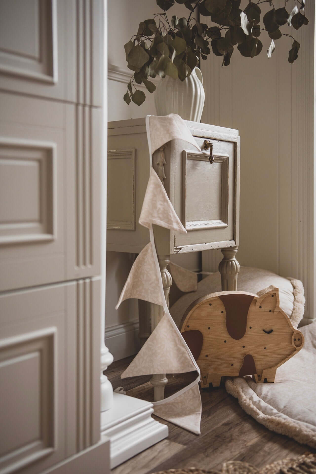 Add a gentle, natural accent to your child’s space with our Ecru Barberries garland. Made from 100% cotton fabric, it features a delicate barberry branch pattern in soft, earthy tones on an ecru background. This timeless design brings warmth and subtle charm to any nursery, kids’ room, or play area. Each flag is double-sided and measures 20.5 cm high, while the full garland includes 9 flags and is approximately 250 cm long. With cotton ribbons on both ends, it’s easy to hang on walls, canopies, or shelves. Perfect for nursery decoration, but also lovely for birthday parties, baby showers, or photoshoots. Product details Material: 100% cotton Pattern: Barberry branches in warm, neutral tones on ecru base Length: approx. 250 cm Flags: 9 double-sided flags, 20.5 cm each Trim: Cotton binding Care: Machine wash at 40°C Made in: The Netherlands Delivery time: 1–3 business days Perfect for Nursery, toddler or kids’ room decoration Neutral or nature-inspired interiors Baby showers, birthdays, and playrooms A beautiful handmade gift