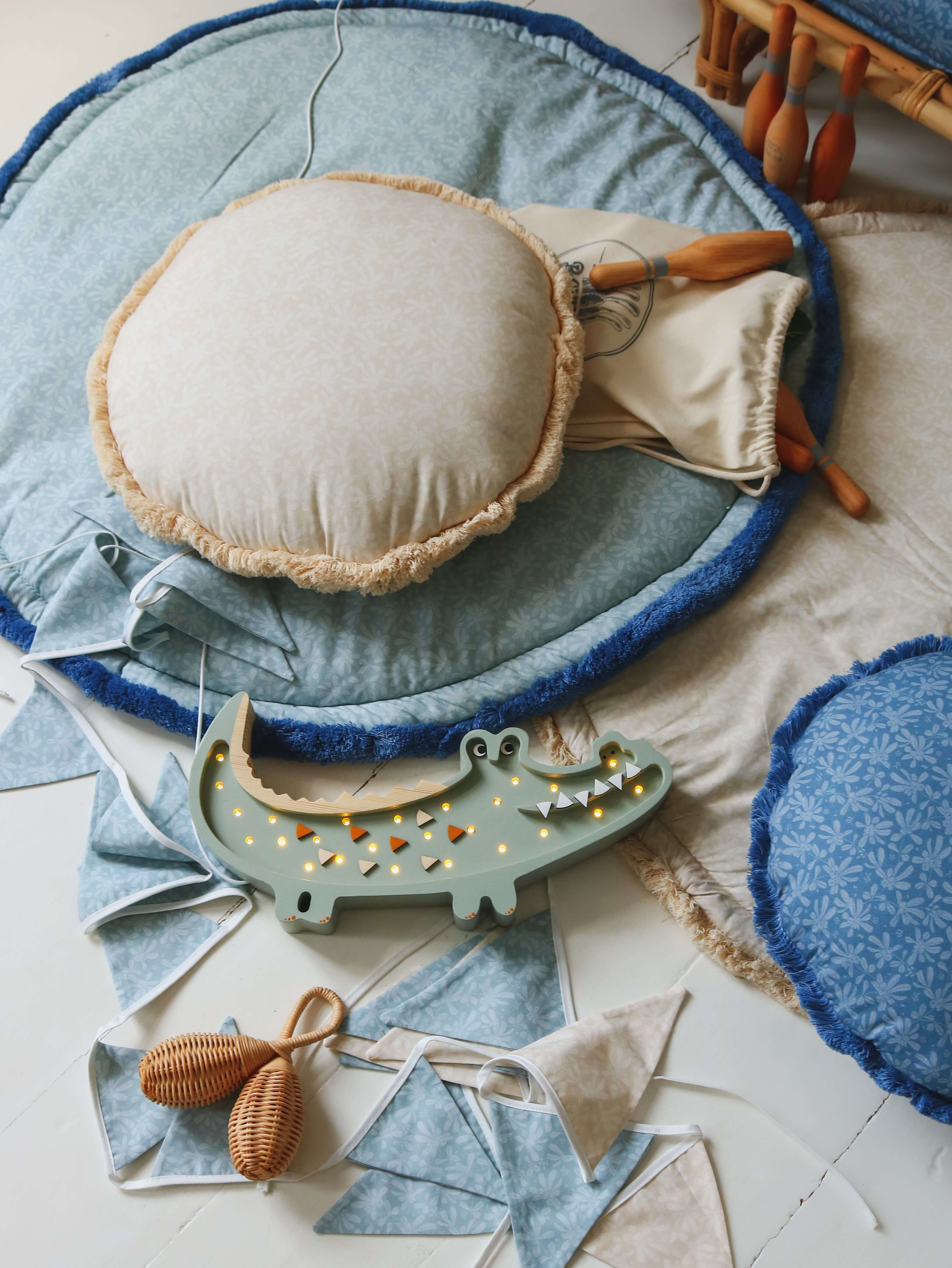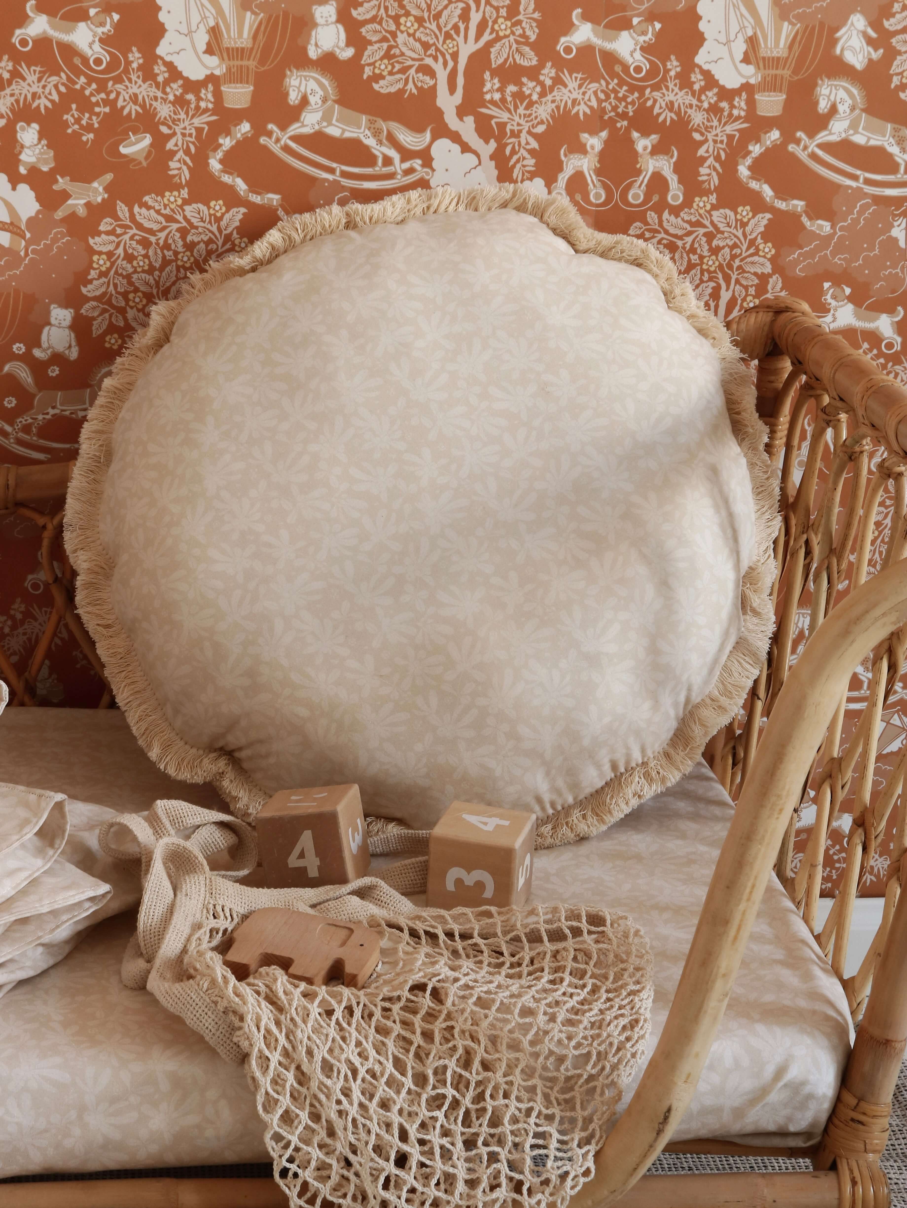 Gorgeous ecru floral pillow with ecru fringes. Size -diameter 40 cm You can combine different pillows to discover better results. Washing instruction:Machine wash in 40 degrees, dry flat Processing time: 1-3 work days