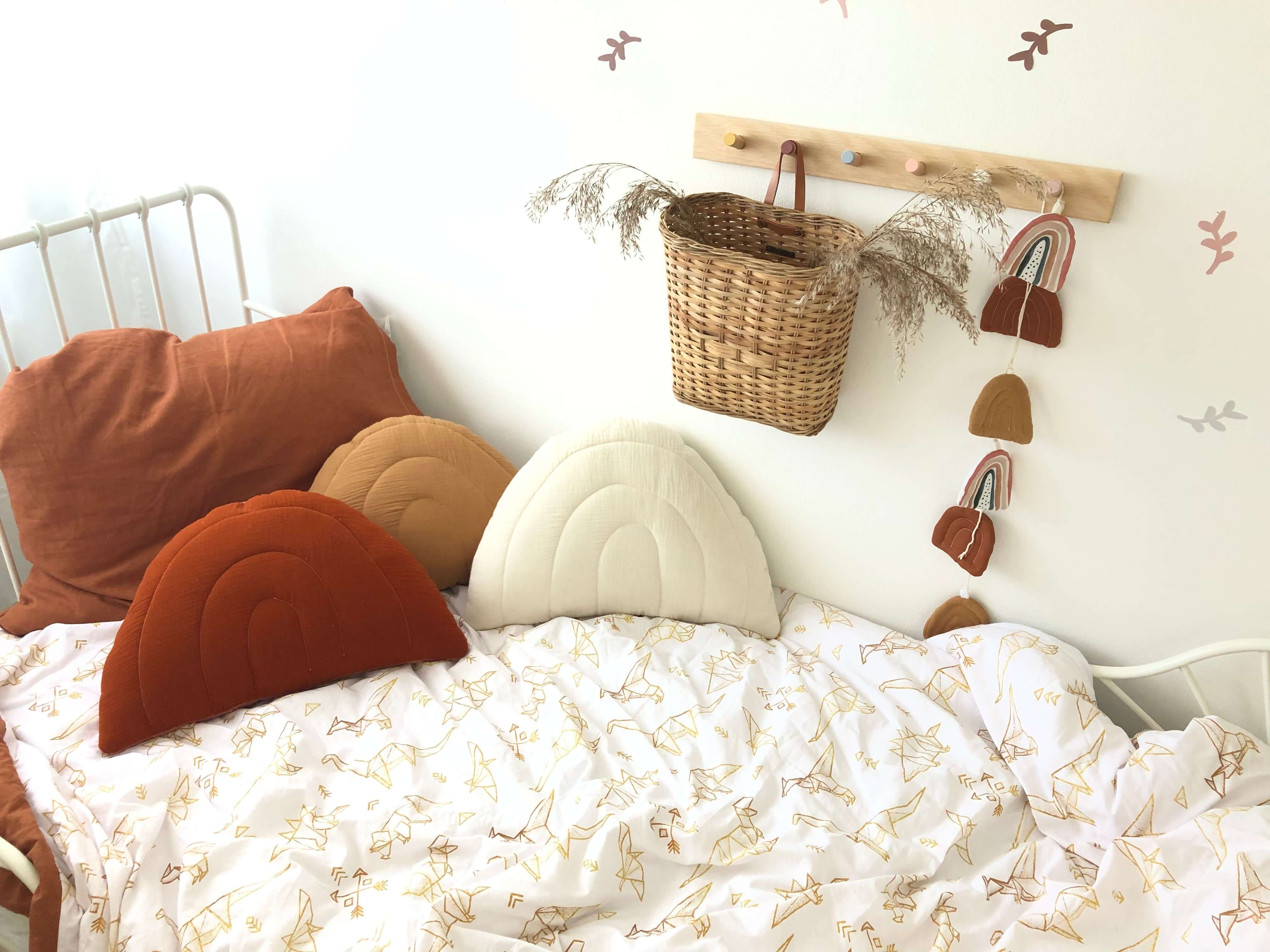 Lovely soft ecru pillow in the shape of a rainbow. Perfect decoration and toy for child’s room or play corner. Dimensions: height: 35 cm, width: 45 cm Fabric : cotton muslin fabric Filled with light and soft silicone balls Processing time: 1-3 work days Designed and made and quilted by hand, in Amsterdam, the Netherlands