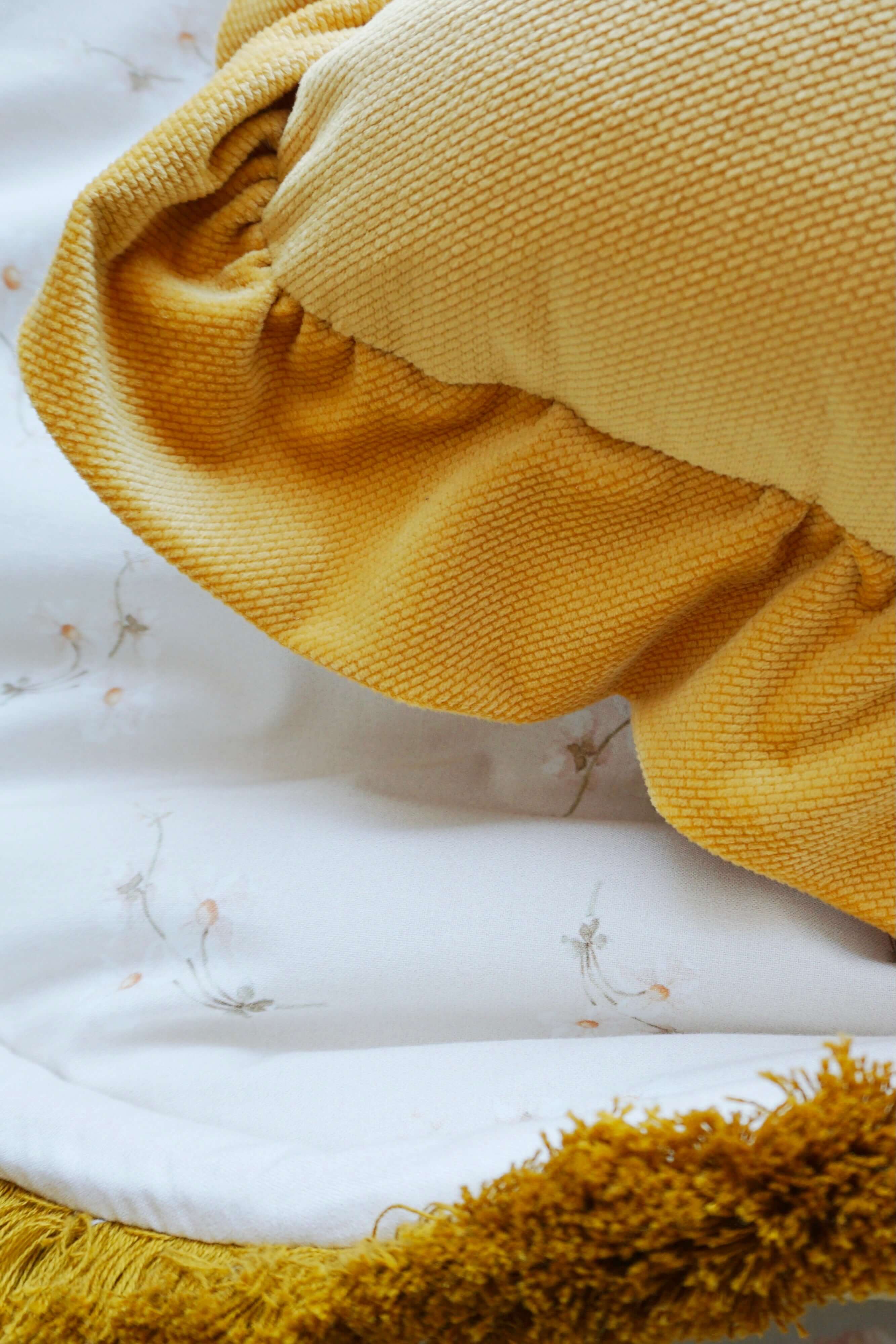 Designed and made in Amsterdam, the Netherlands. Double sided play mat, perfect for bedding your little one. Your child can use the play mat as a rug, a place to play, to learn to rest or a kick off for a journey into imagination. It works great a a floor for the tipi! Round play mat has become recently a must have in kids’ room interior design. Because it’s double sided, you can easily change the look of the room. It is soft and cosy, but above all it is SAFE for your child. The play mat has been carefully sewn using the high quality fabrics. I used the thick 100% cotton fabric with ecru small flowers (OEKO-TEX Standard 100 Class 1 certified) on one side and mustard velvet fabric, on the other. Velvet is a polyester fabric, soft and nice in touch. It’s called velvet for a reason 😉 . To give an extraordinary look, it is finished with a mustard fringe(97% cotton, 3%pp). The mat is filled with with fibre fill with a thickness of around 2 cm. Chosen filling is also lightweight and has anti allergic properties – it is odourless and chemical free, does not absorb moisture. Washing instructions: We recommend washing in max 30°C, using a special gentle cycle. Spin at 1200 rpm. Ideally with a washing detergent that does not contain phosphates. Iron onlyu the cotton side, at max 100°C (one dot setting) with a huge amount of steam. Don’t bleach or use other strong bleaching detergents. Don’t wring after washing. There is a possibility to make a mat in other size, let me know if you are interested 😉 The price above is including TAX(21%).