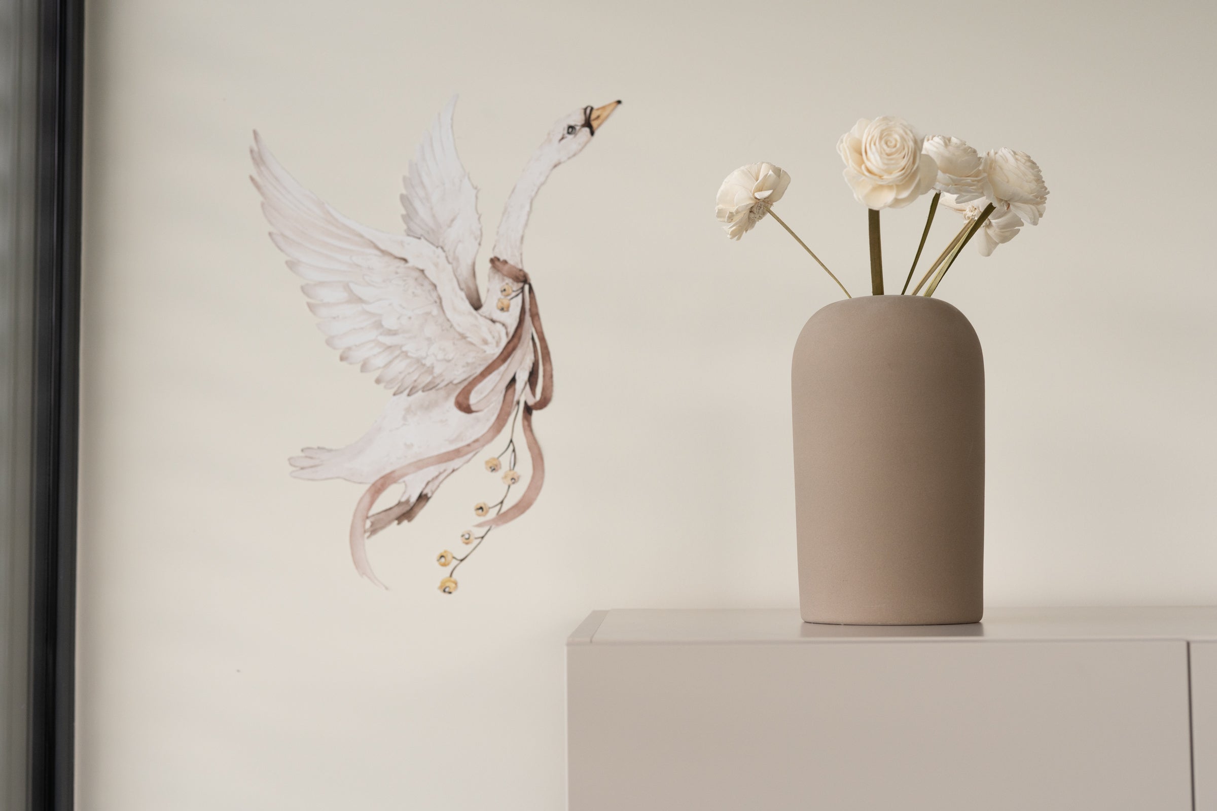 Let your childβs imagination take flight with this graceful swan soaring across their wall. The Flying Swan Wall Sticker by Matuu brings softness, movement, and a magical mood to any nursery or toddler room. Featuring a white swan in mid-flight with delicate feathers and a calm expression, this decal adds lightness and charm to the space. Perfect for creating dreamy, fairytale-style interiors above a crib, bed, or reading nook. Printed on high-quality, eco-friendly matte vinyl β removable, PVC-free, and safe for children. No need for wallpaper β just peel and stick for an instant transformation. Material Matte, self-adhesive PVC (95 ΞΌm) Washable and fade-resistant EN 13501-1 B-s2-d0 fire safety certified Safe for childrenβs spaces Available sizes 30 x 50 cm Application Peel & stick β no tools or glue needed For smooth, clean walls or furniture Full instructions: Processing time 5β10 business days * Please note: Our wall stickers are printed to order and are therefore non-returnable, unless there is a defect or a mistake in printing. If you experience any issue with your order, please contact us and we will be happy to help. Perfect for: Dreamy or romantic nurseries Fairytale-themed girlsβ rooms Calm Scandinavian baby interiors Wall decor above cribs or beds Baby showers or birthdays