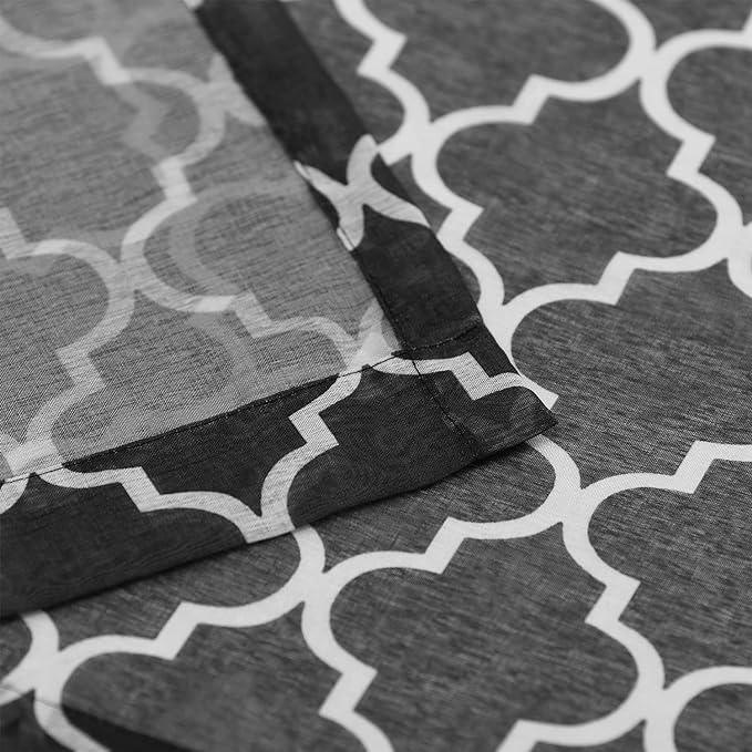 These curtain panels offer a touch of Moroccan charm to your home. They feature a geometric quatrefoil/lattice pattern printed on a woven textile fabric. Available in both opaque and sheer options, they come in various base colors with a consistent white pattern, making them suitable for different window sizes and room styles.