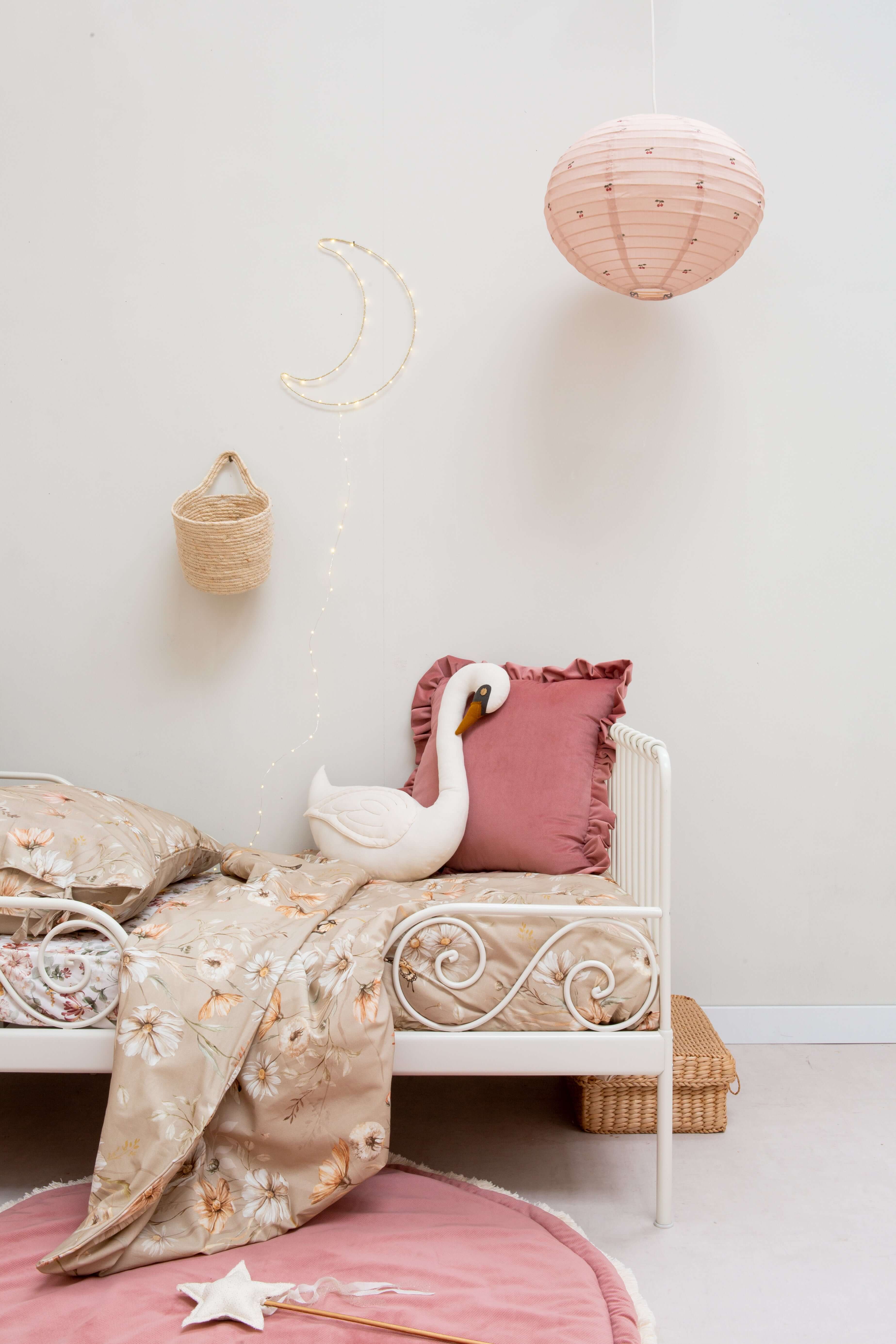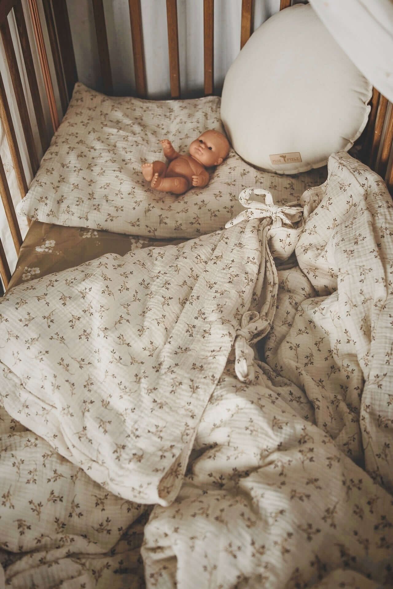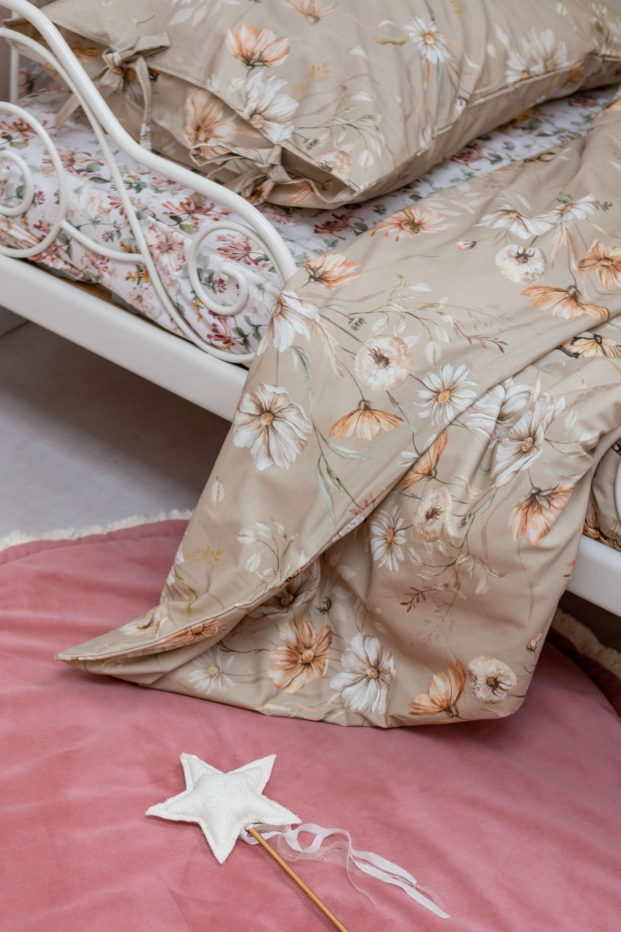 Bring warmth and natural charm into your child’s room with the Gold Meadow on Caramel bedding set. Made from soft, breathable enzyme-washed cotton, this bedding has a naturally softened texture that feels gentle on the skin and offers long-lasting comfort. The design features a warm caramel background adorned with hand-drawn meadow flowers in golden, white, and earthy tones, creating a calming yet elegant atmosphere. Perfect for boho, vintage, or nature-inspired nurseries, kids’ rooms, or adult bedrooms, it adds a timeless touch to any interior. Each set includes a duvet cover and pillowcase, finished with cotton tie closures for a handcrafted, minimal look. Lightweight, safe, and OEKO-TEX® certified, it combines natural comfort with artisanal quality. Lovingly handmade in the Netherlands, it brings cozy elegance to every space. Product Details Material: 100% enzyme-washed cotton – OEKO-TEX® certified Design: Caramel base with floral meadow motif in golden, white, and earthy accents Closure: Cotton ties (no zippers or buttons) Set includes: 1 duvet cover + 1 pillowcase (all sizes) Sizes: Crib, toddler, junior, and single bed Care: Machine wash at 40 °C, gentle cycle; do not tumble dry; iron on low if needed Preparation time: 2–3 business days Handmade in the Netherlands by Matuu Perfect For Boho and vintage nurseries Nature-inspired interiors with warm tones Cozy toddler or kids’ rooms Neutral bedrooms for both children and adults A thoughtful baby shower, birthday, or housewarming gift