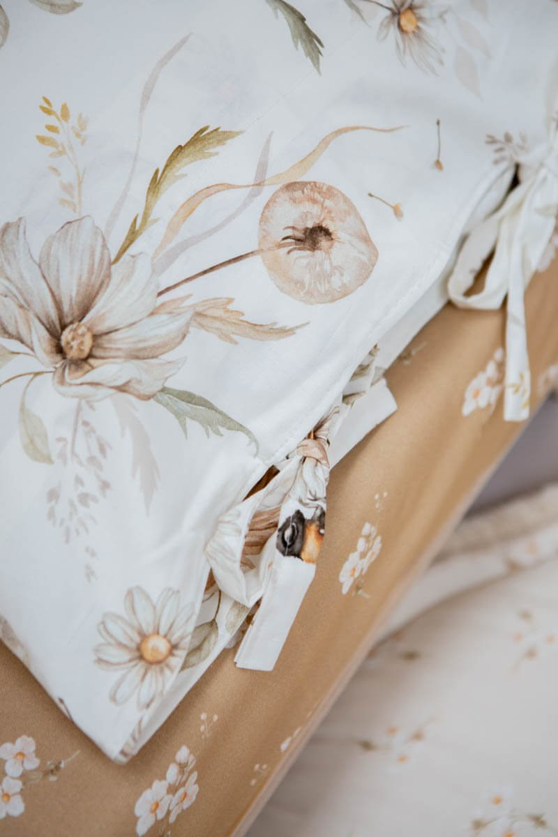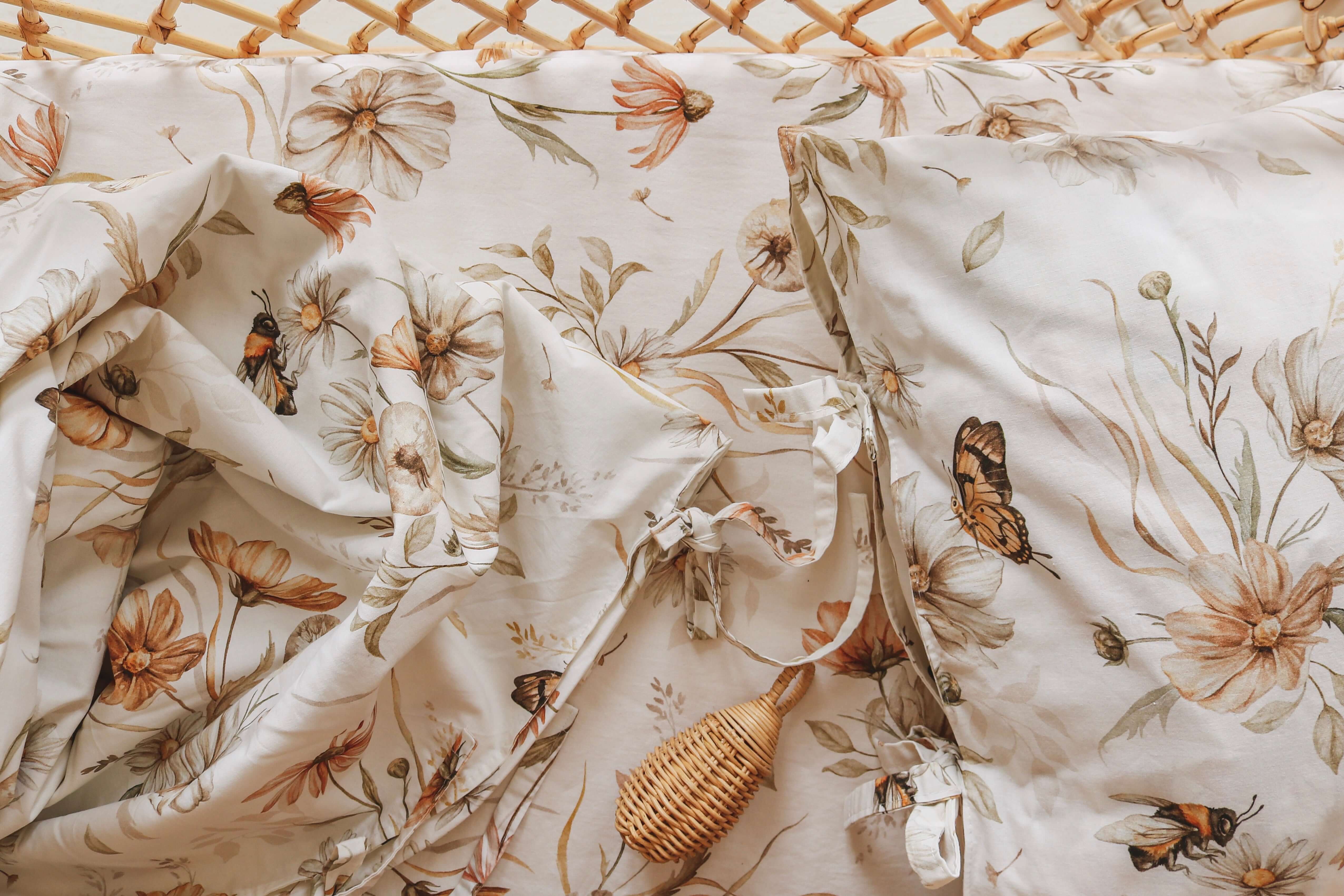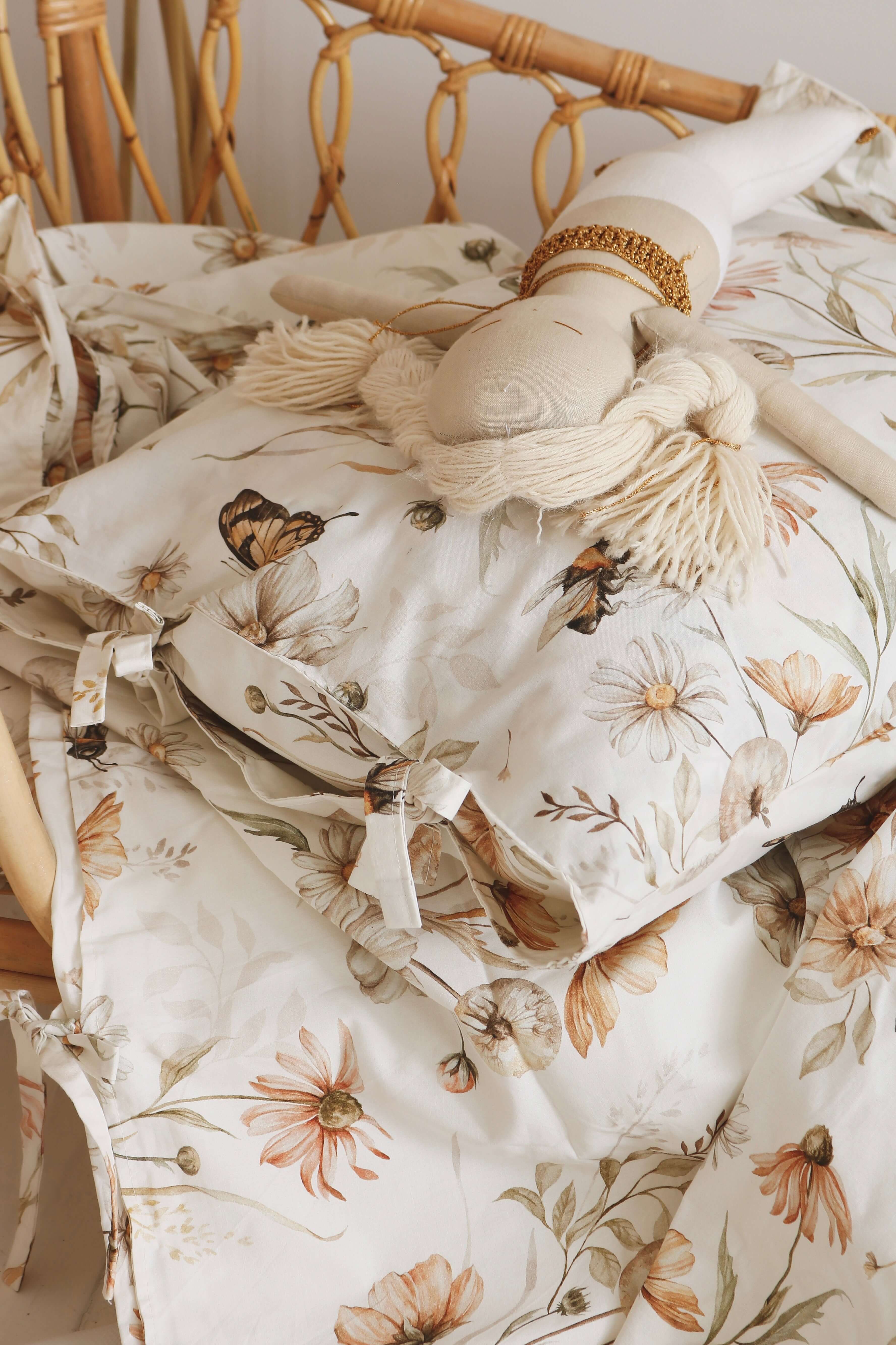 Add timeless elegance and gentle charm to your child’s room with the Gold Meadow on White bedding set. Made from soft, breathable enzyme-washed cotton, this bedding feels naturally softened, offering extra comfort for sensitive skin while staying durable and easy to care for. The design features a crisp white background decorated with hand-drawn golden meadow flowers and delicate earthy accents, creating a fresh and calming atmosphere. Perfect for boho, vintage, or nature-inspired nurseries, kids’ rooms, and adult bedrooms, it brings a soft touch of nature indoors. Each set includes a duvet cover and pillowcase, finished with cotton tie closures for a minimal, handcrafted detail. Lightweight, safe, and OEKO-TEX® certified, it is lovingly handmade in the Netherlands, blending artisanal quality with everyday practicality. Product Details Material: 100% enzyme-washed cotton – OEKO-TEX® certified Design: White base with golden meadow floral motif and earthy details Closure: Cotton ties (no zippers or buttons) Set includes: 1 duvet cover + 1 pillowcase (all sizes) Sizes: Crib, toddler, junior, and single bed Care: Machine wash at 40 °C, gentle cycle; do not tumble dry; iron on low if needed Preparation time: 2–3 business days Handmade in the Netherlands by Matuu Perfect For Boho and nature-inspired nurseries Cozy toddler and kids’ rooms Vintage or neutral interiors Parents who love light, airy colors with a floral touch A thoughtful baby shower, birthday, or holiday gift