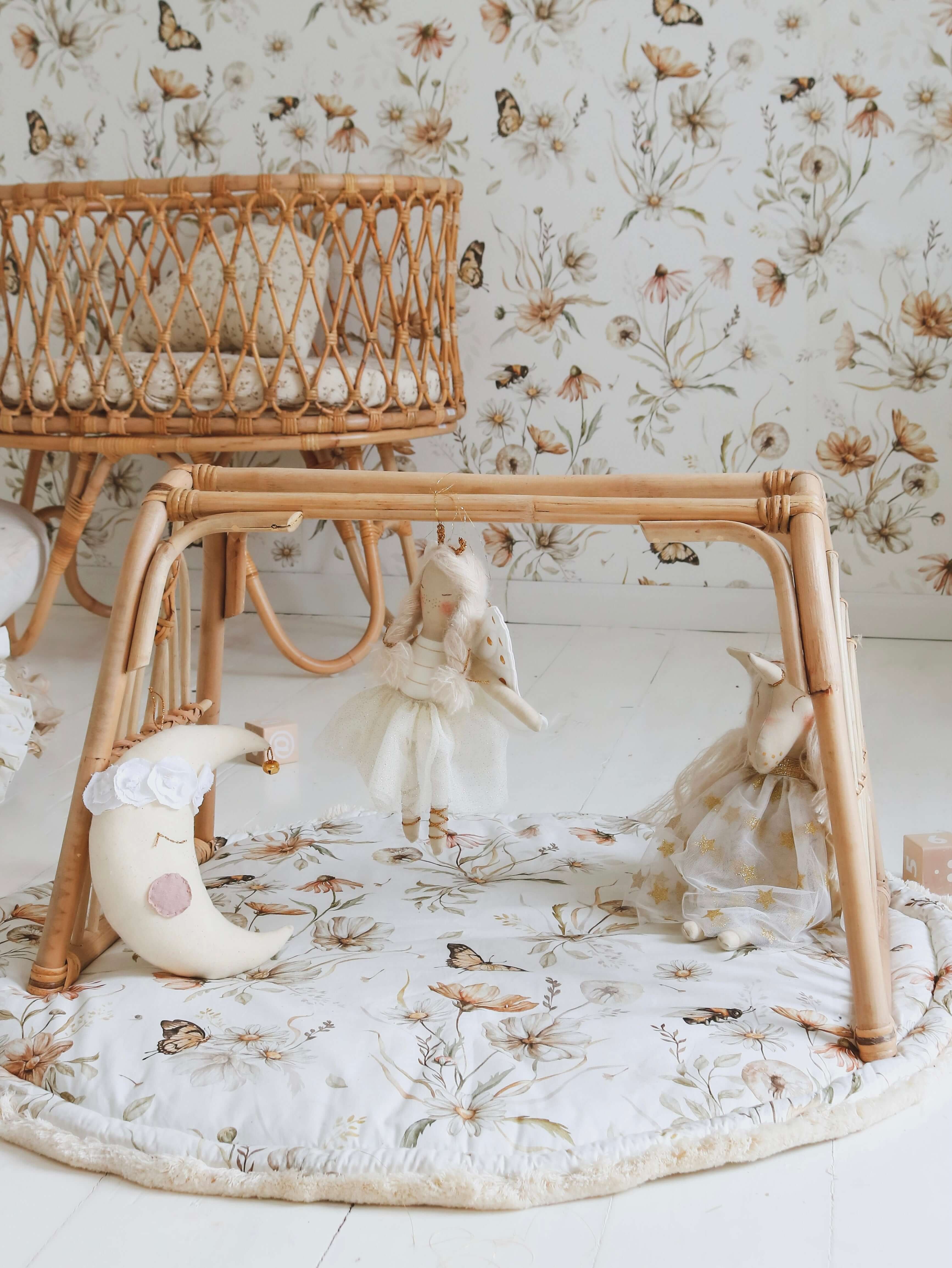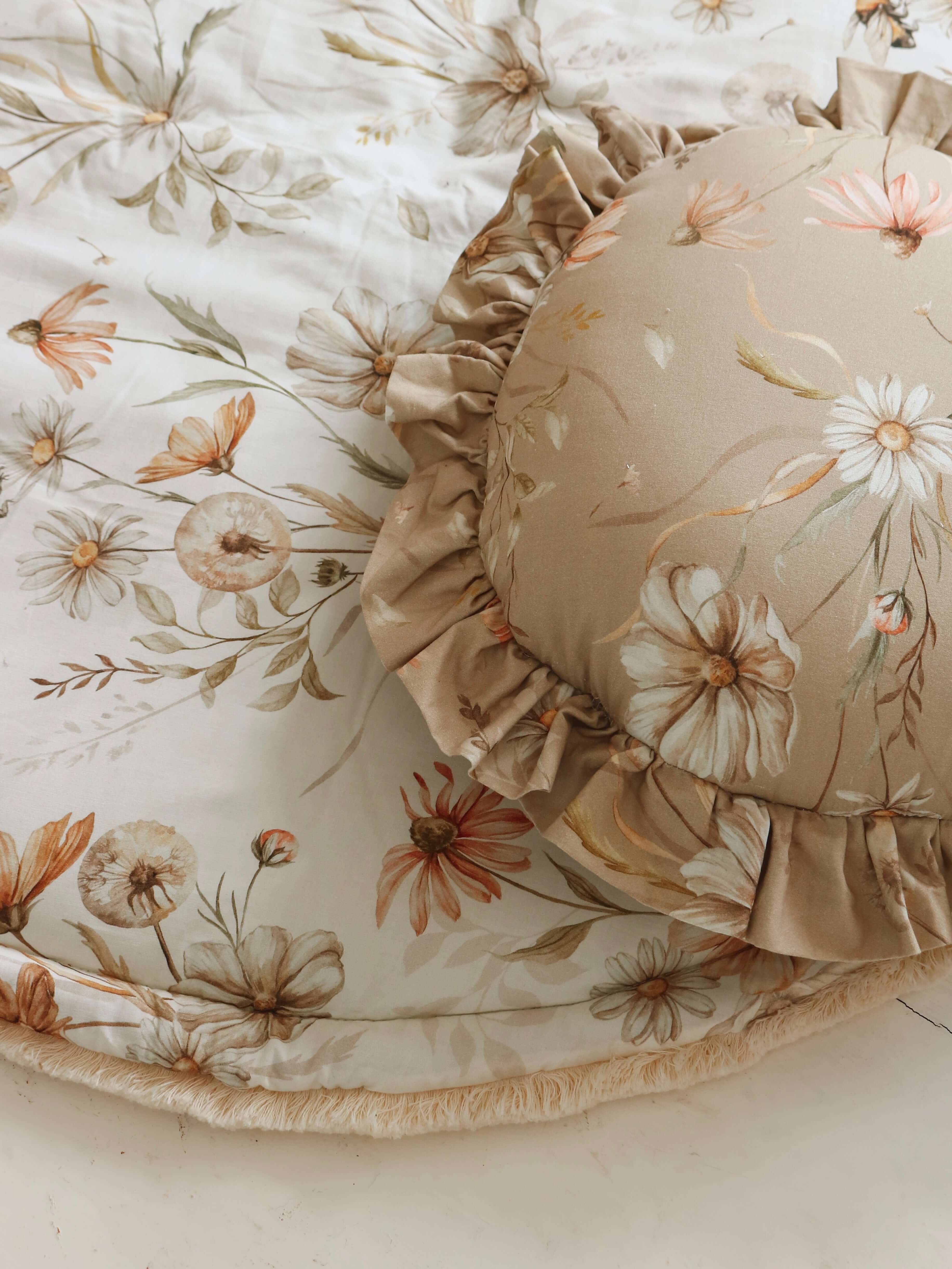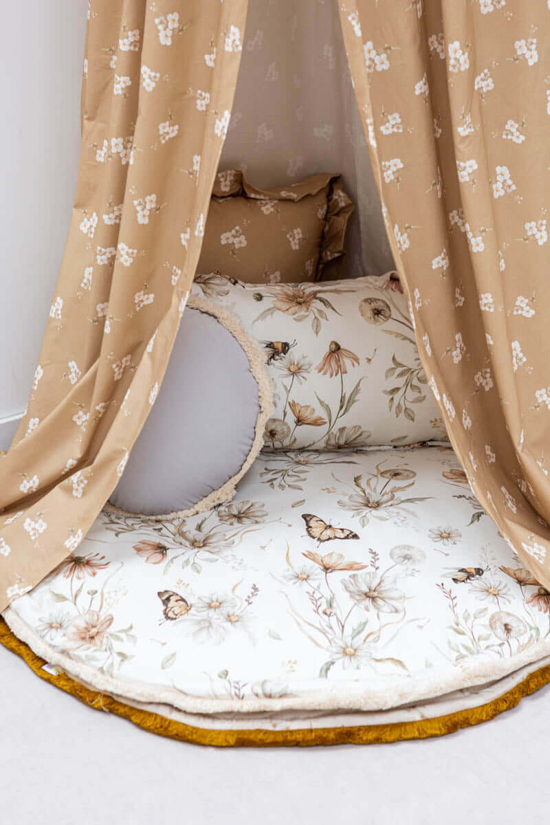 Designed and made in Amsterdam, the Netherlands. Double sided play mat, perfect for bedding your little one. Your child can use the play mat as a rug, a place to play, to learn to rest or a kick off for a journey into imagination. It works great a a floor for the tipi! Round play mat has become recently a must have in kids’ room interior design. Because it’s double sided, you can easily change the look of the room. It is soft and cosy, but above all it is SAFE for your child. The play mat has been carefully sewn using the high quality fabrics. I used the thick 100% cotton fabric with gold meadow (OEKO-TEX Standard 100 Class 1 certified) on one side and grey velvet fabric, quilted in diamonds, on the other. Velvet is a polyester fabric, soft and nice in touch. It’s called velvet for a reason 😉 . To give an extraordinary look, it is finished with a ecru fringe(97% cotton, 3%pp). The mat is filled with with fibre fill with a thickness of around 2 cm. Chosen filling is also lightweight and has anti allergic properties – it is odourless and chemical free, does not absorb moisture. Washing instructions: We recommend washing in max 30°C, using a special gentle cycle. Spin at 1200 rpm. Ideally with a washing detergent that does not contain phosphates. Iron onlyu the cotton side, at max 100°C (one dot setting) with a huge amount of steam. Don’t bleach or use other strong bleaching detergents. Don’t wring after washing. There is a possibility to make a mat in other size, let me know if you are interested 😉 The price above is including TAX(21%).