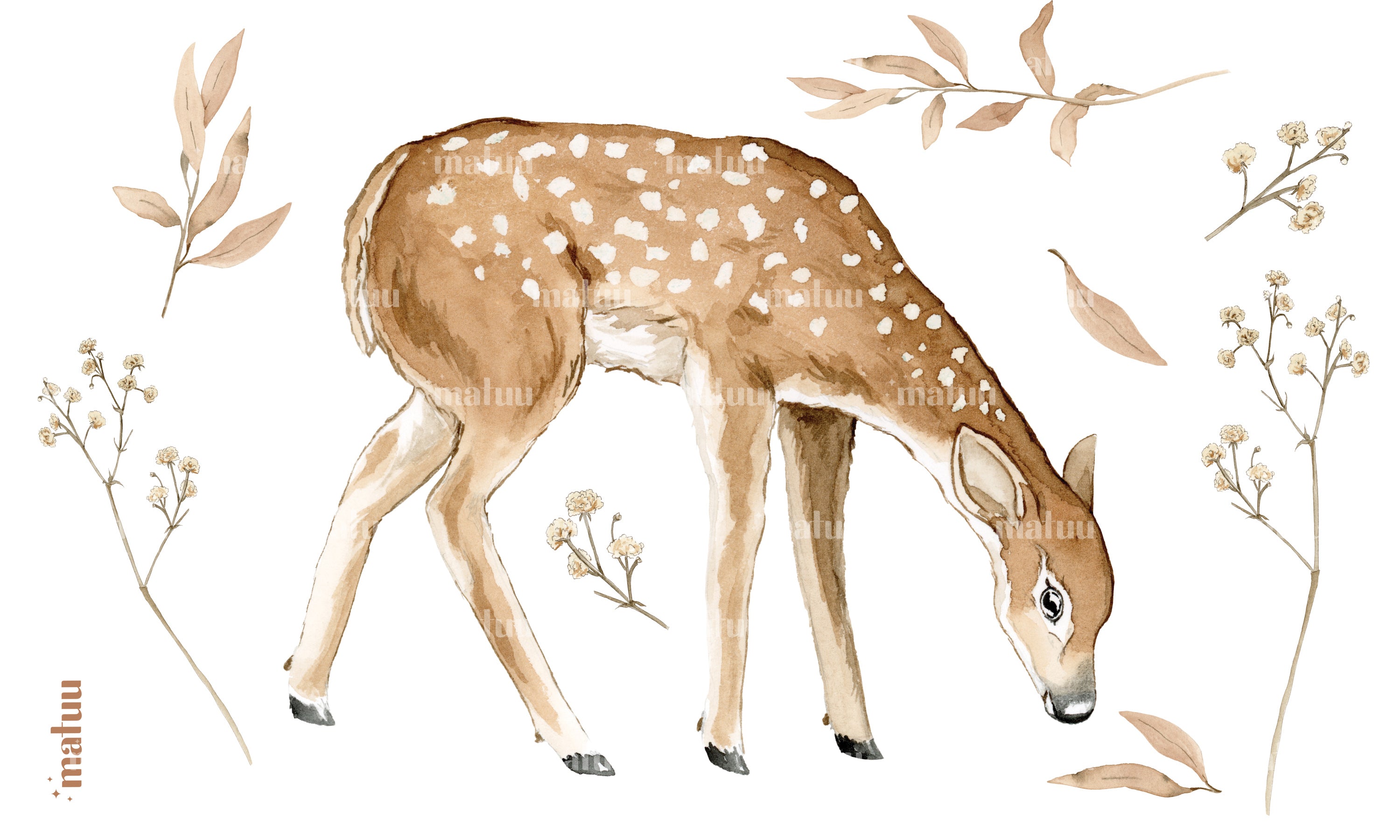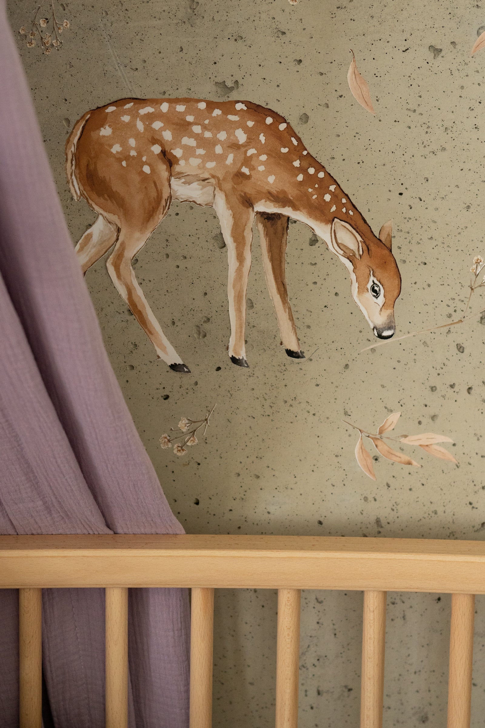 Bring the serenity of the forest into your child’s room with the Grazing Fawn wall sticker – a delicate and calming design perfect for nurseries and nature-themed spaces. This charming decal features a young deer grazing among botanical elements in soft, earthy tones. It’s easy to apply and remove without damaging the surface, making it a perfect, stress-free upgrade for any child’s room. Material Matte, self-adhesive PVC (95 μm) Washable and fade-resistant EN 13501-1 B-s2-d0 fire safety certified Safe for children’s spaces Available sizes 30 x 50 cm Application Peel & stick – no tools or glue needed For smooth, clean walls or furniture Full instructions: Processing time 5–10 business days * Please note: Our wall stickers are printed to order and are therefore non-returnable, unless there is a defect or a mistake in printing. If you experience any issue with your order, please contact us and we will be happy to help. Perfect for: Woodland-themed nurseries Nature-inspired kids’ rooms Gender-neutral baby interiors Calm and cozy nursery corners Scandinavian or boho-style spaces