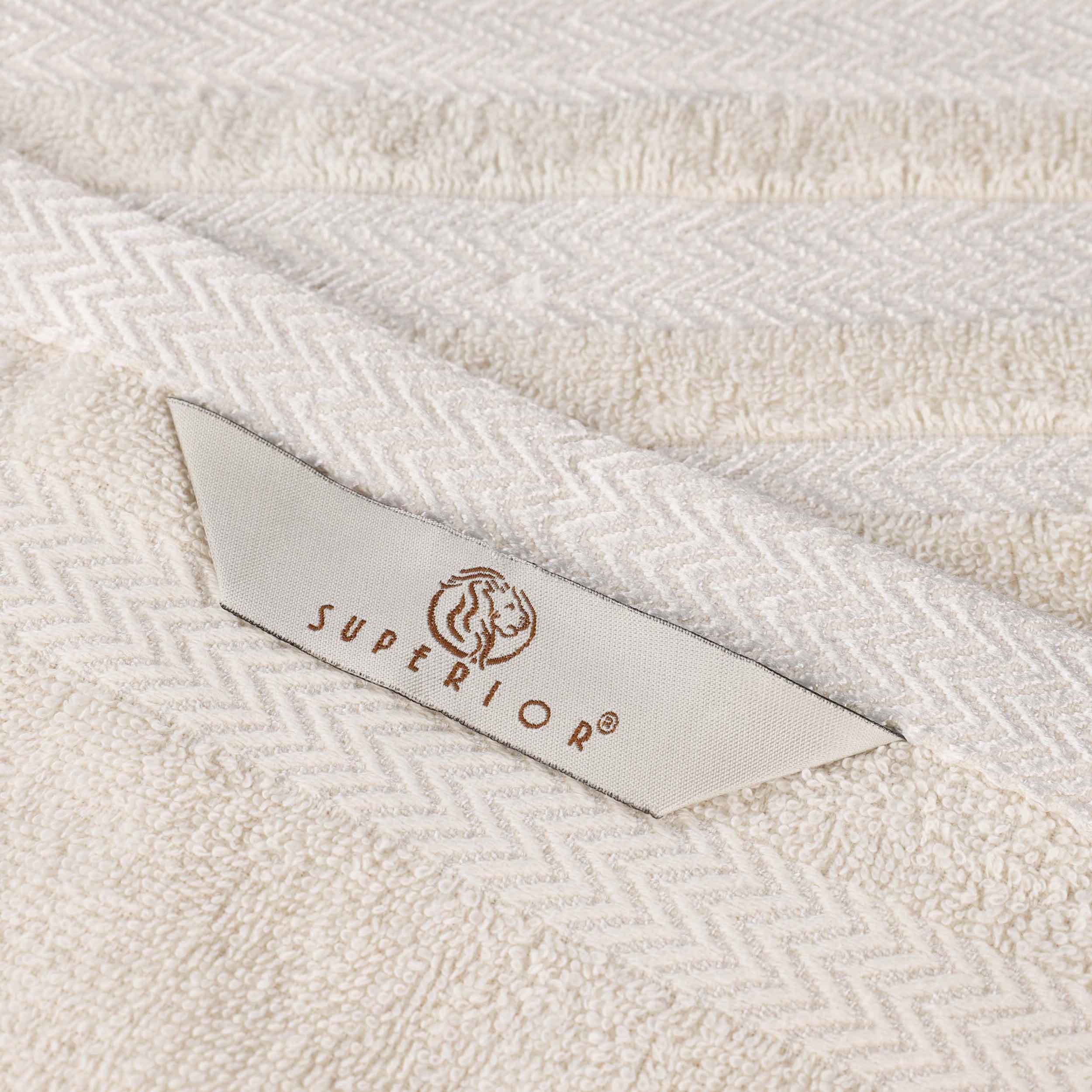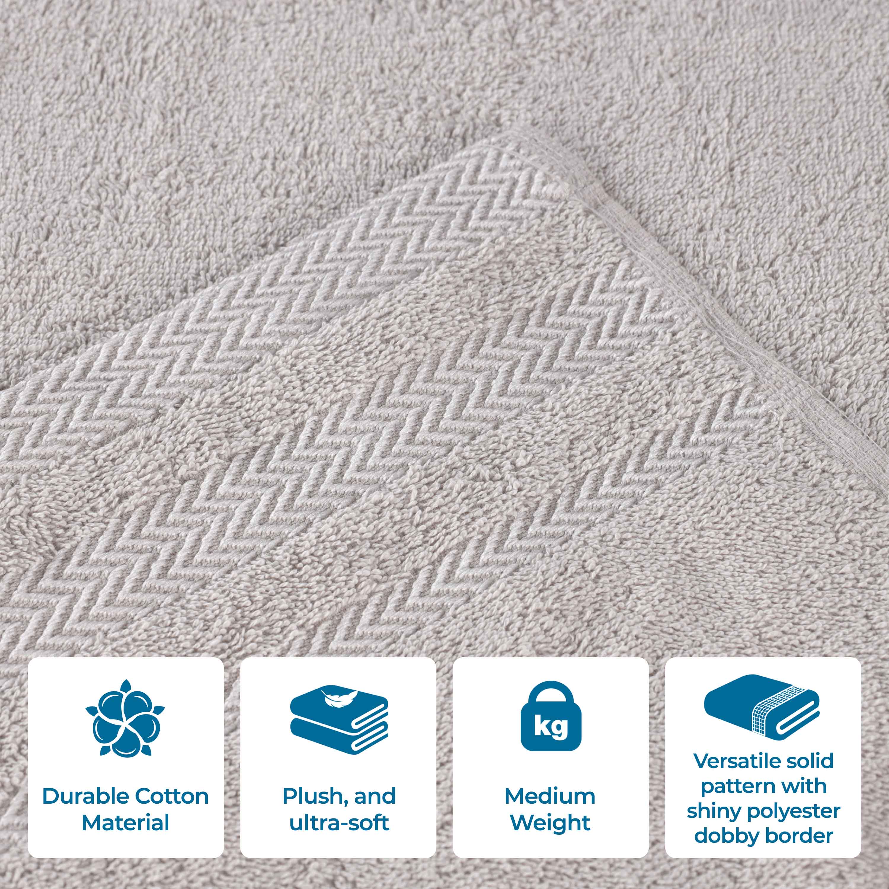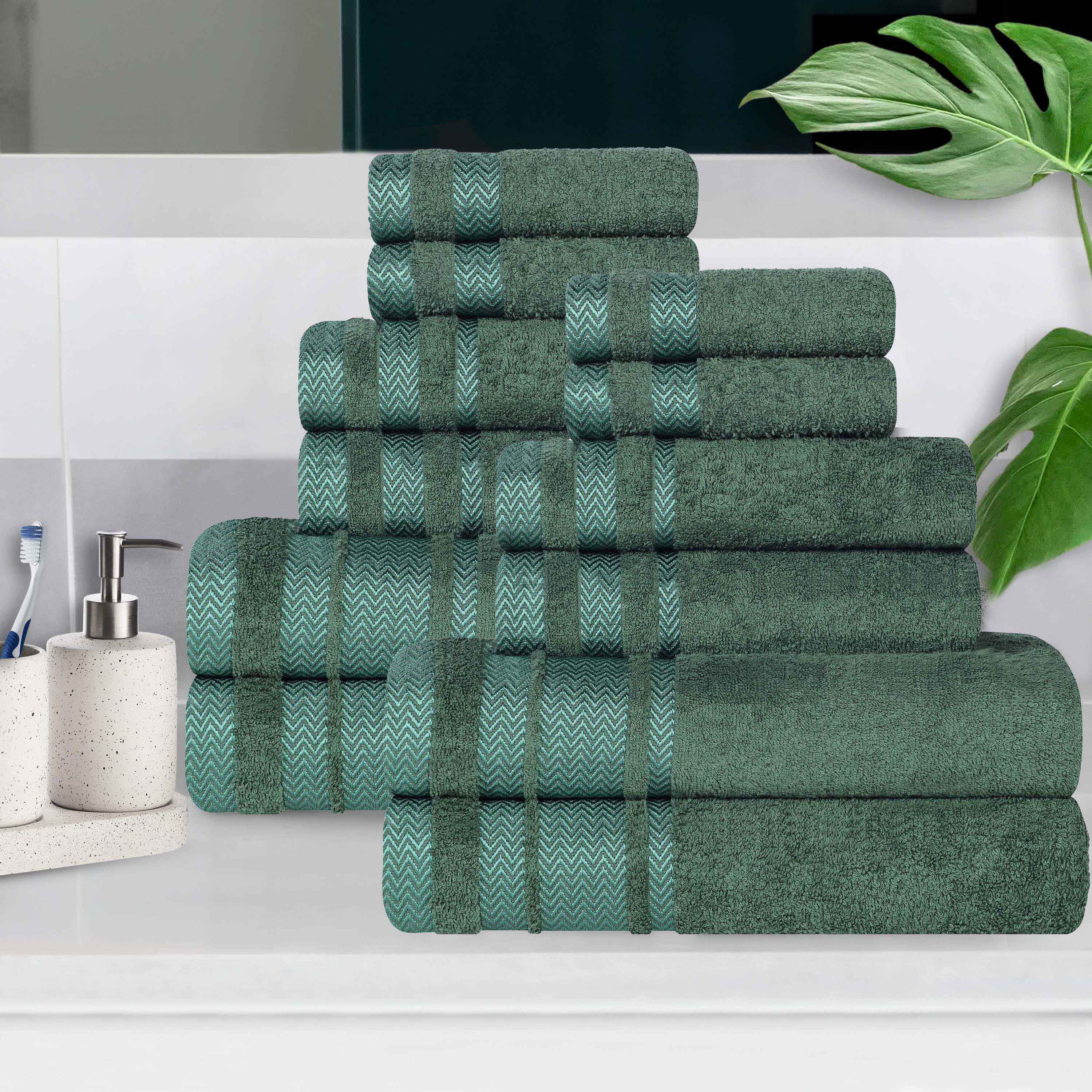 This is a comprehensive 12-piece towel set designed for bathroom use. It is crafted from 100% premium cotton, ensuring softness and high absorbency. The towels feature a unique zigzag-patterned, shiny polyester dobby border that not only adds visual appeal but also enhances the durability of the edges.