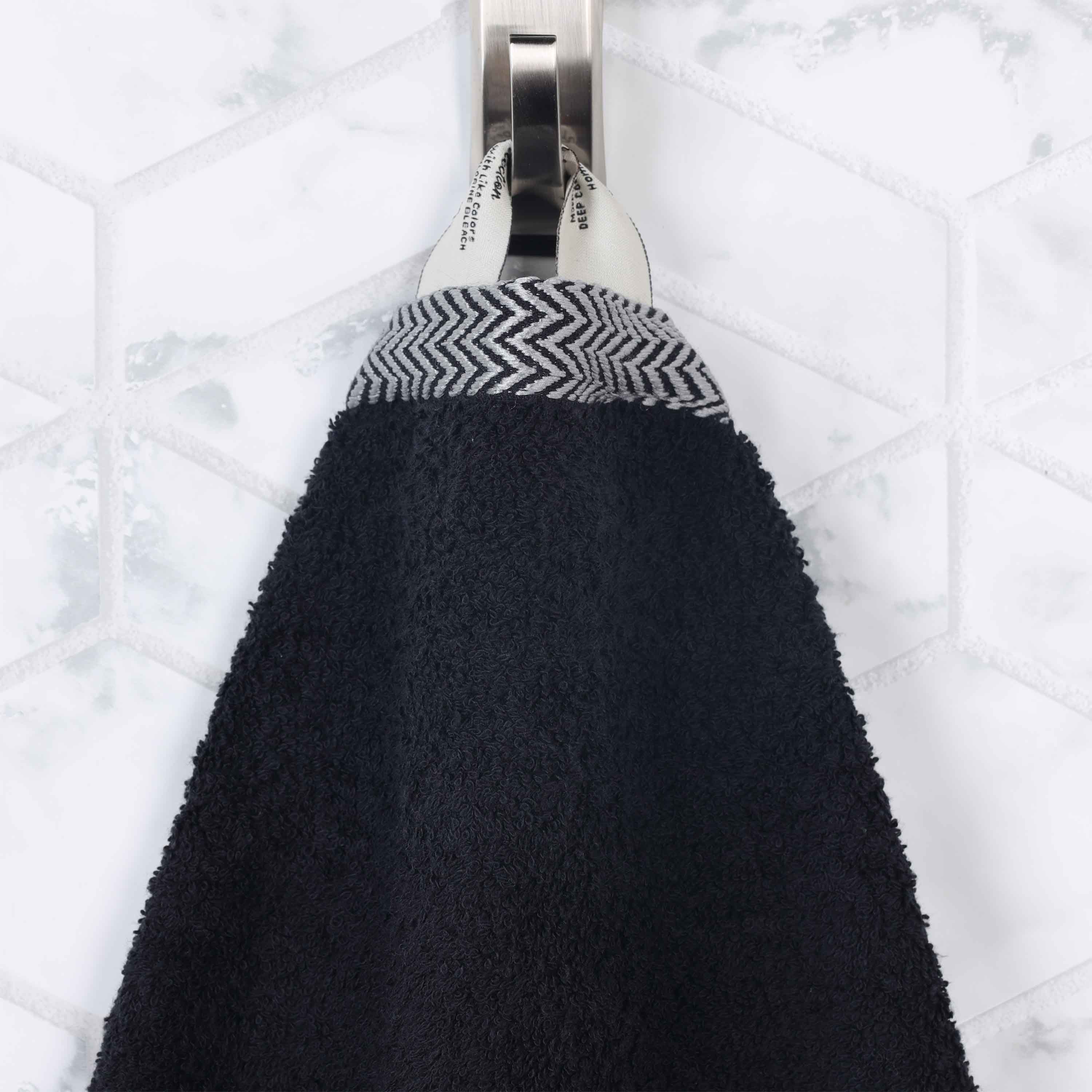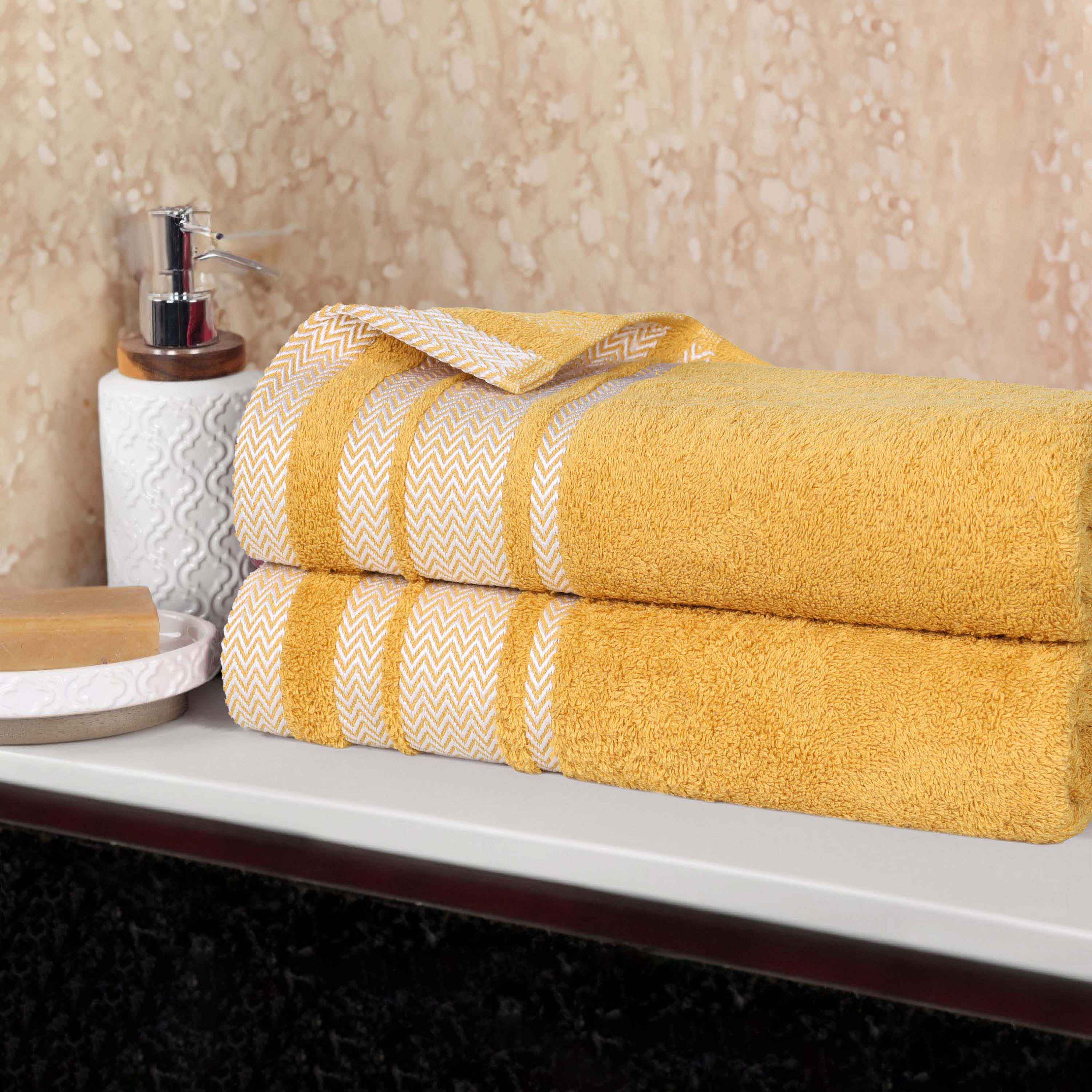 This is a set of towels designed for bathroom use. The towels are crafted from 100% premium cotton, featuring a thick and plush texture. They come in a variety of colors and are adorned with a herringbone/chevron stripe pattern on the top edge, adding both visual appeal and texture.