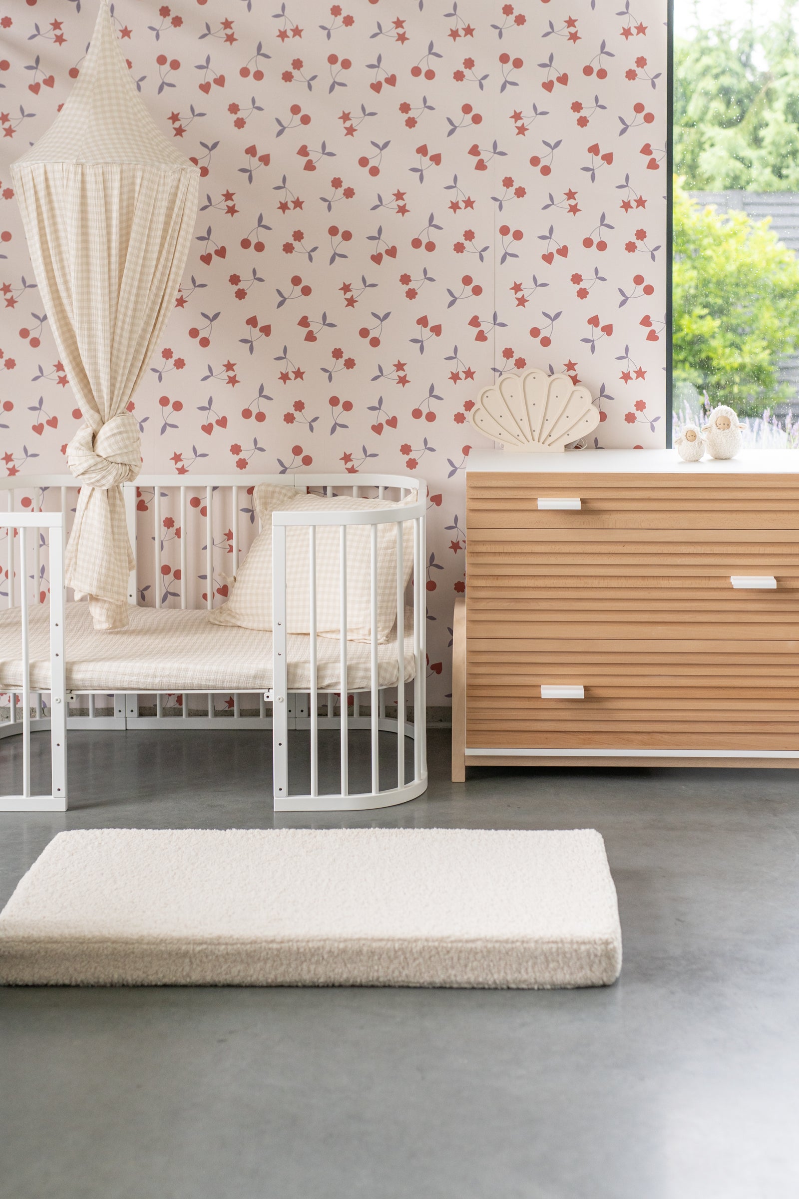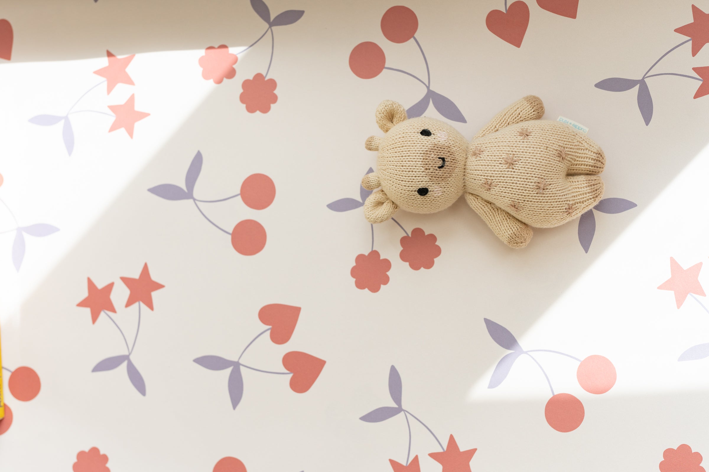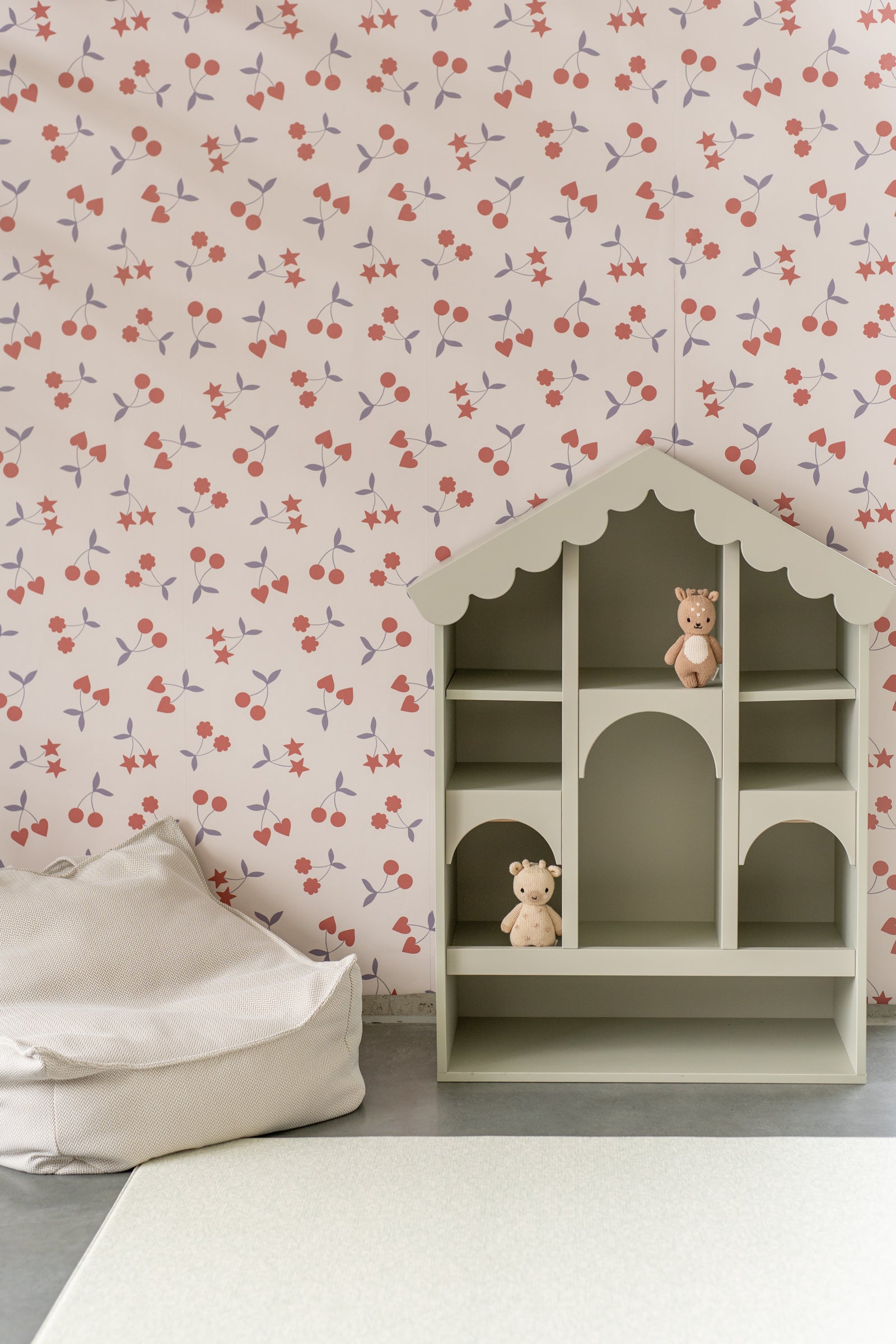 Playful charm for cozy kidsβ rooms Heartgarden β cream wallpaper brings a playful and nostalgic feel to any childβs room. With its mix of cherries, hearts, stars and tiny blossoms, this sweet pattern captures the spirit of childhood in a soft, retro-inspired palette. Set against a warm cream background, the terracotta red and muted lavender accents add a sense of calm, joy and charm β perfect for vintage, boho or Scandinavian interiors. Whether for a nursery, playroom or reading nook, this wallpaper brings lightness, fun and just the right amount of whimsy. Printed on premium non-woven material, itβs easy to apply and made to last β simply paste the wall and hang the strips. Product features Design: playful twigs with hearts, cherries, stars & flowers Color palette: cream background with rusty pink & jeans blue accents Material: premium non-woven (vlies) wallpaper Finish: elegant matte texture Pattern repeat: every 50 cm Production: made to order β printed just for you Dimensions & Installation Available sizes: β’ 2 strips measuring 50 Γ 270 cm β’ 2 strips measuring 50 Γ 310 cm Coverage: 1 set covers 1 meter wall width Installation: β’ Paste the wall (not the wallpaper) β’ Use non-woven wallpaper paste β’ Surface must be clean, smooth, and dry β’ Instructions: Download the step-by-step non-woven wallpaper guide How many rolls do I need? Each set includes 2 vertical strips (50 cm wide), covering 1 meter in width. Examples: Wall width 2.3 m β order 3 sets Wall width 4 m β order 4 sets Tip: Always add 5β10 cm margin, as walls are rarely perfectly straight. Production & Delivery β’ Production time: 1β3 business days β’ Shipping time: 2β7 business days (Europe) Check β Double Check Please carefully inspect your wallpaper before installation. Verify colours, pattern alignment, and length immediately upon delivery. We allow a cutting tolerance of up to 1 mm per strip. If the deviation is larger, we will gladly reprint your order. *Once the wallpaper has been cut and installed, it is no longer possible to objectively determine whether any irregularity originates from production or from handling during installation. For this reason, claims raised after installation are very difficult to assess. Important Notes β’ This wallpaper is not kept in stock β itβs printed to order β’ Not sure about colour or pattern scale? We recommend ordering a sample first