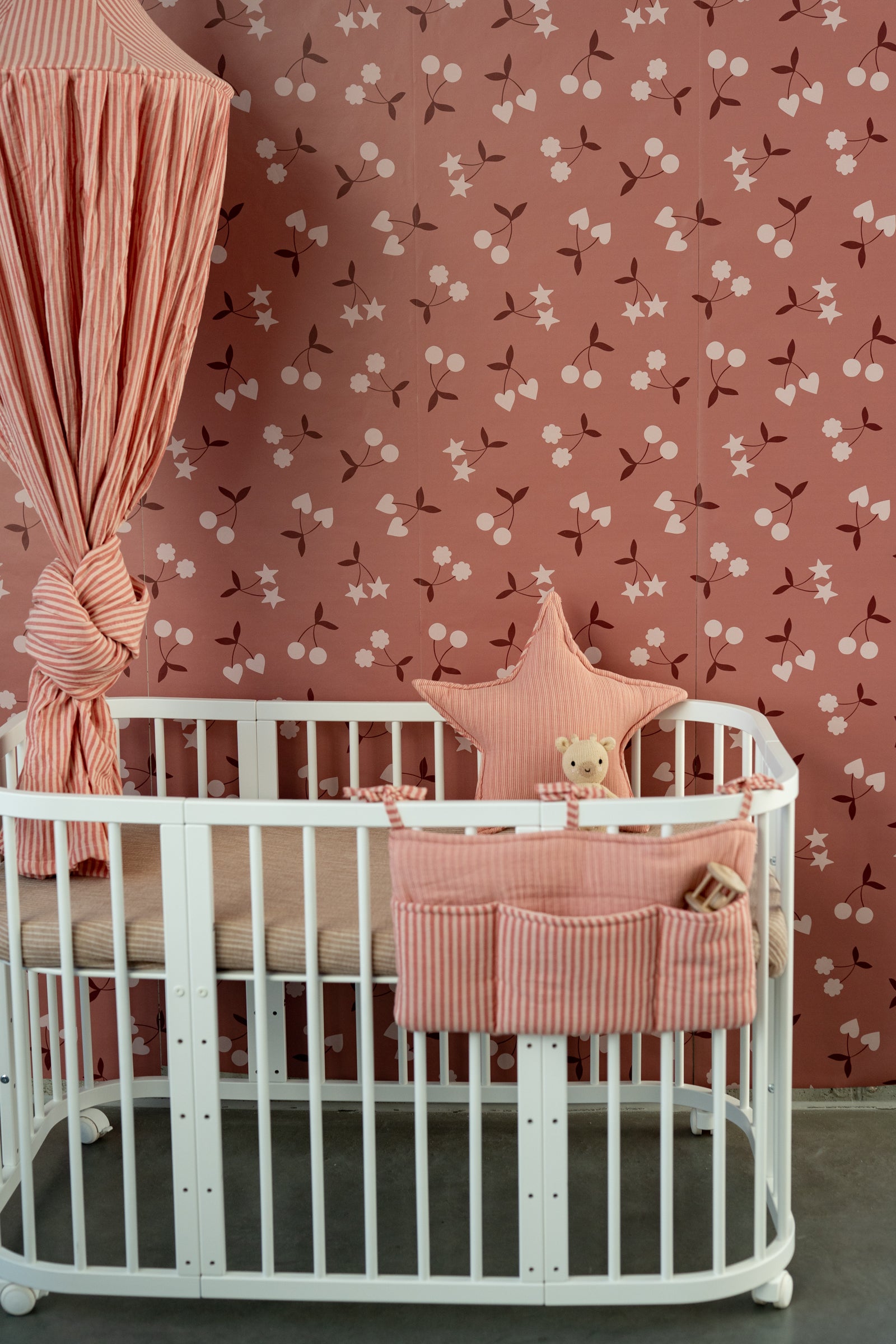 Heartgarden β rust wallpaper brings cozy charm and cheerful energy to any childβs room, playroom or creative nook. This playful, hand-drawn pattern features a mix of hearts, stars, flowers, and cherries dancing across a warm rust-red backdrop. With its soft retro vibe and balanced color palette, it feels both nostalgic and fresh β a perfect match for vintage interiors, Scandinavian styling or bold modern spaces. The earthy rust tone adds warmth and character, making it easy to pair with wooden furniture, creamy whites or deep berry accents. Printed on premium non-woven (vlies) wallpaper, itβs durable and easy to apply β simply paste the wall and smooth on the strips. A fun and heartwarming choice for imaginative spaces. Product features Design: playful twigs with hearts, cherries, stars & flowers Color palette: warm rust background, light peachy-pinks and deep burgundy details Material: premium non-woven (vlies) wallpaper Finish: elegant matte texture Pattern repeat: every 50 cm Production: made to order β printed just for you Dimensions & Installation Available sizes: β’ 2 strips measuring 50 Γ 270 cm β’ 2 strips measuring 50 Γ 310 cm Coverage: 1 set covers 1 meter wall width Installation: β’ Paste the wall (not the wallpaper) β’ Use non-woven wallpaper paste β’ Surface must be clean, smooth, and dry β’ Instructions: Download the step-by-step non-woven wallpaper guide How many rolls do I need? Each set includes 2 vertical strips (50 cm wide), covering 1 meter in width. Examples: Wall width 2.3 m β order 3 sets Wall width 4 m β order 4 sets Tip: Always add 5β10 cm margin, as walls are rarely perfectly straight. Production & Delivery β’ Production time: 1β3 business days β’ Shipping time: 2β7 business days (Europe) Check β Double Check Please carefully inspect your wallpaper before installation. Verify colours, pattern alignment, and length immediately upon delivery. We allow a cutting tolerance of up to 1 mm per strip. If the deviation is larger, we will gladly reprint your order. *Once the wallpaper has been cut and installed, it is no longer possible to objectively determine whether any irregularity originates from production or from handling during installation. For this reason, claims raised after installation are very difficult to assess. Important Notes β’ This wallpaper is not kept in stock β itβs printed to order β’ Not sure about colour or pattern scale? We recommend ordering a sample first
