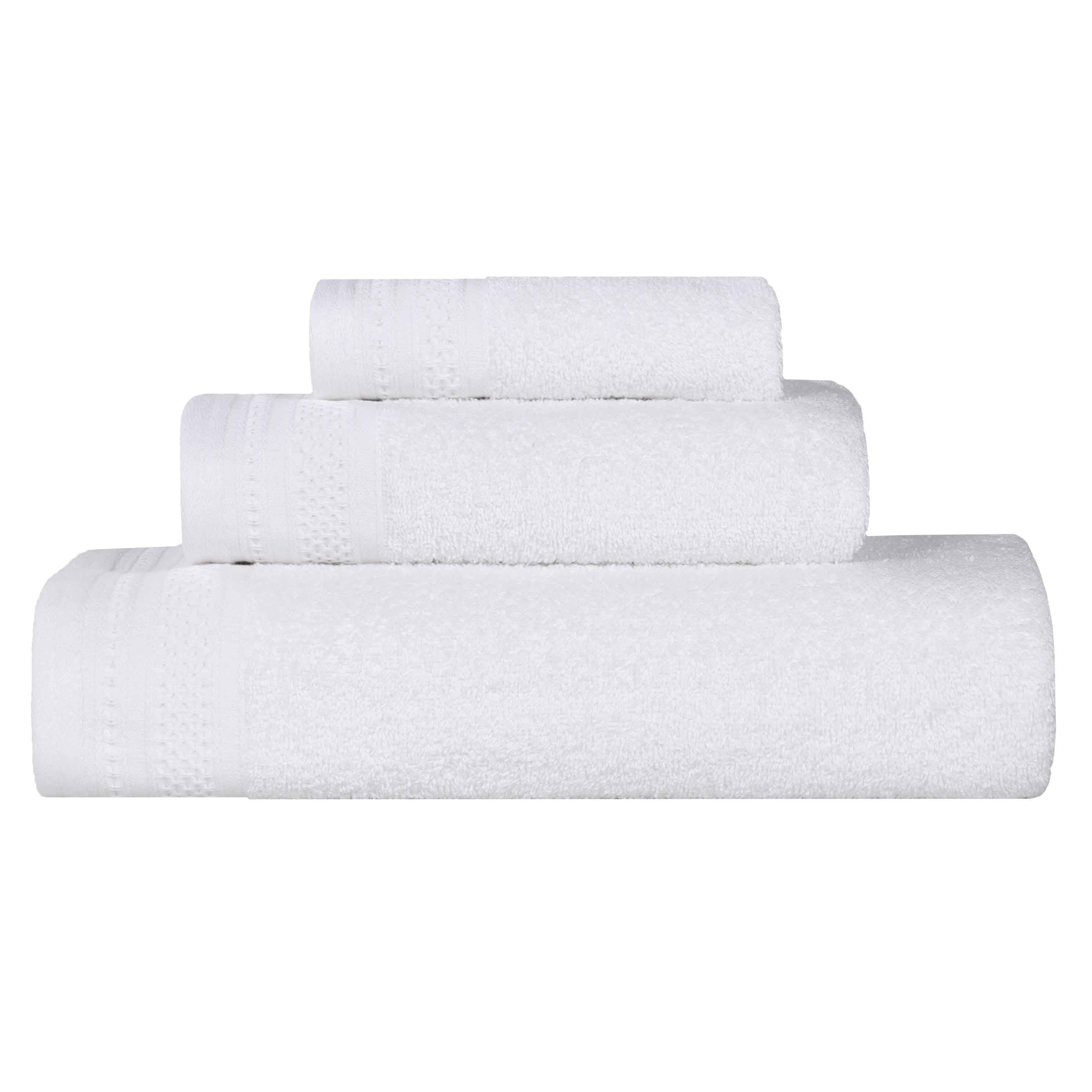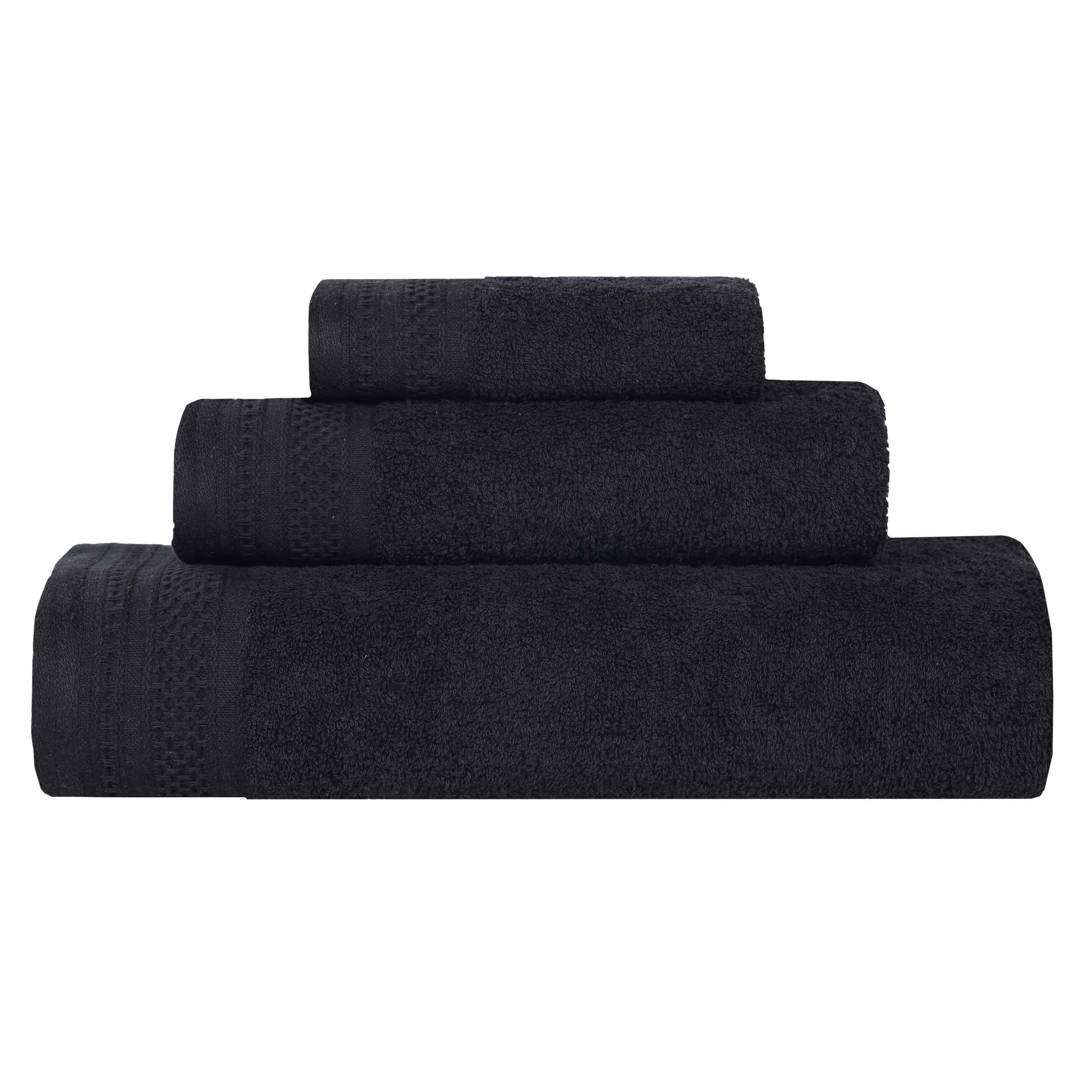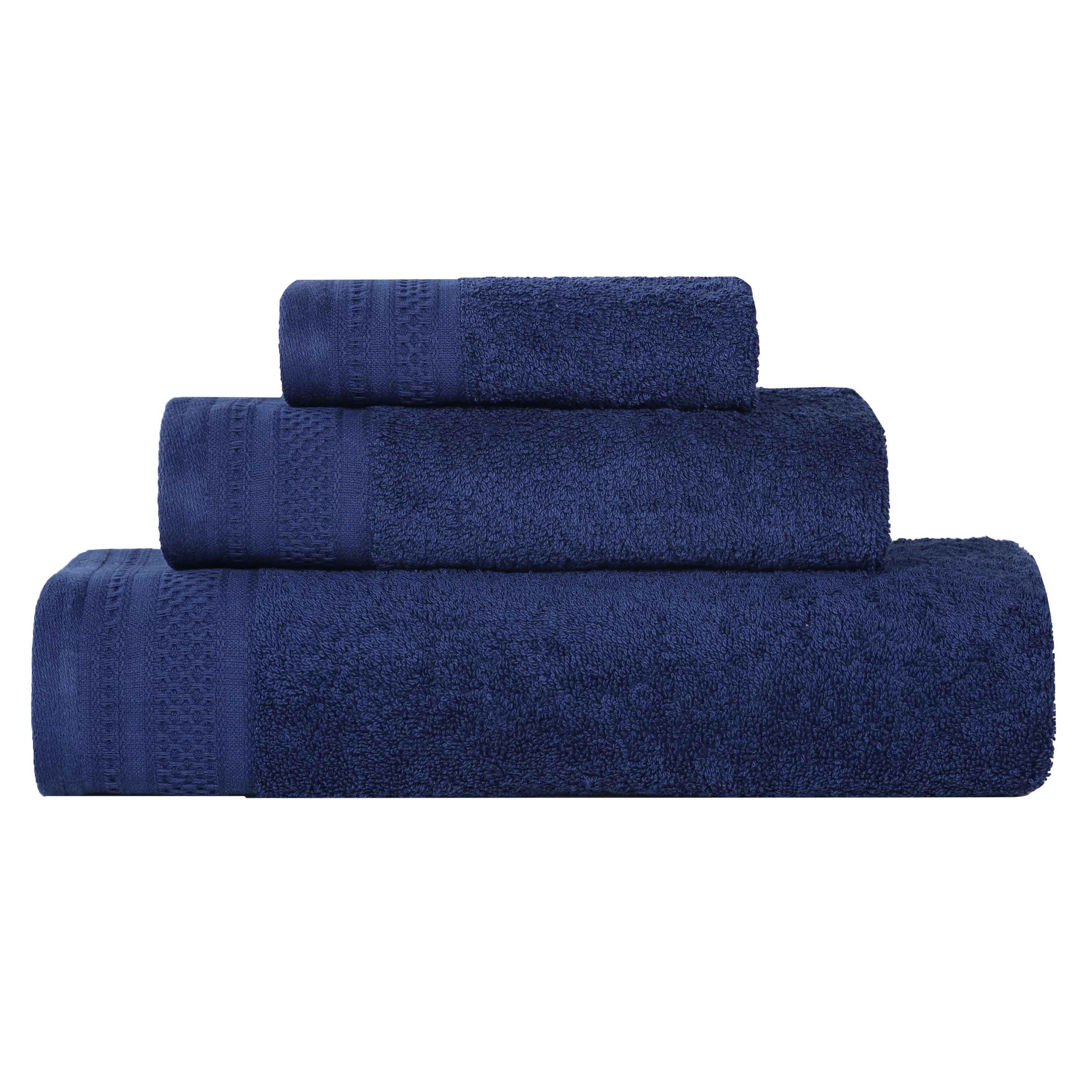 This is a 3-piece towel set crafted from 100% cotton. It comes in an array of solid colors, such as azure, black, and gold. Each towel features decorative textured borders, adding both durability and aesthetic appeal.