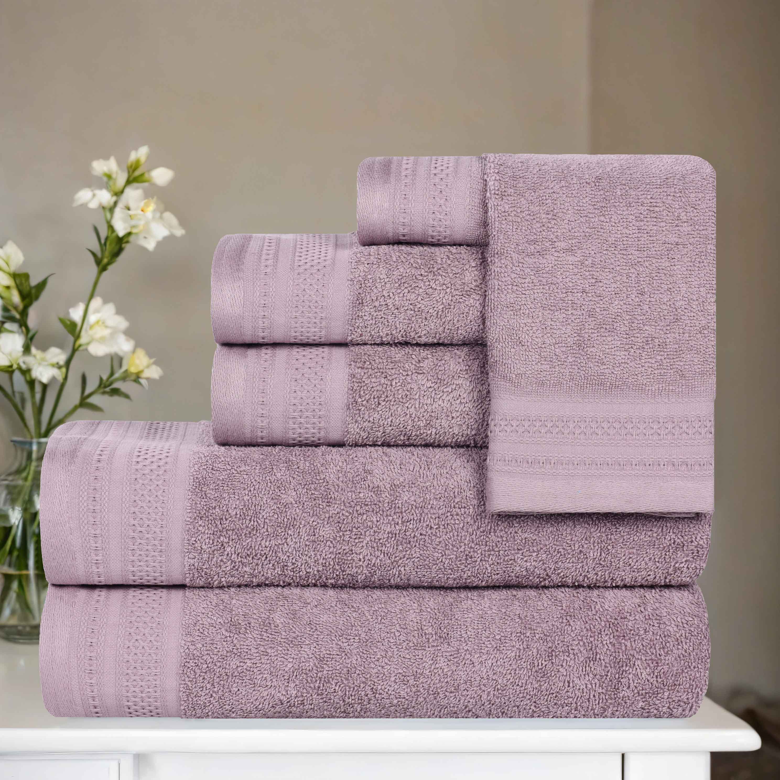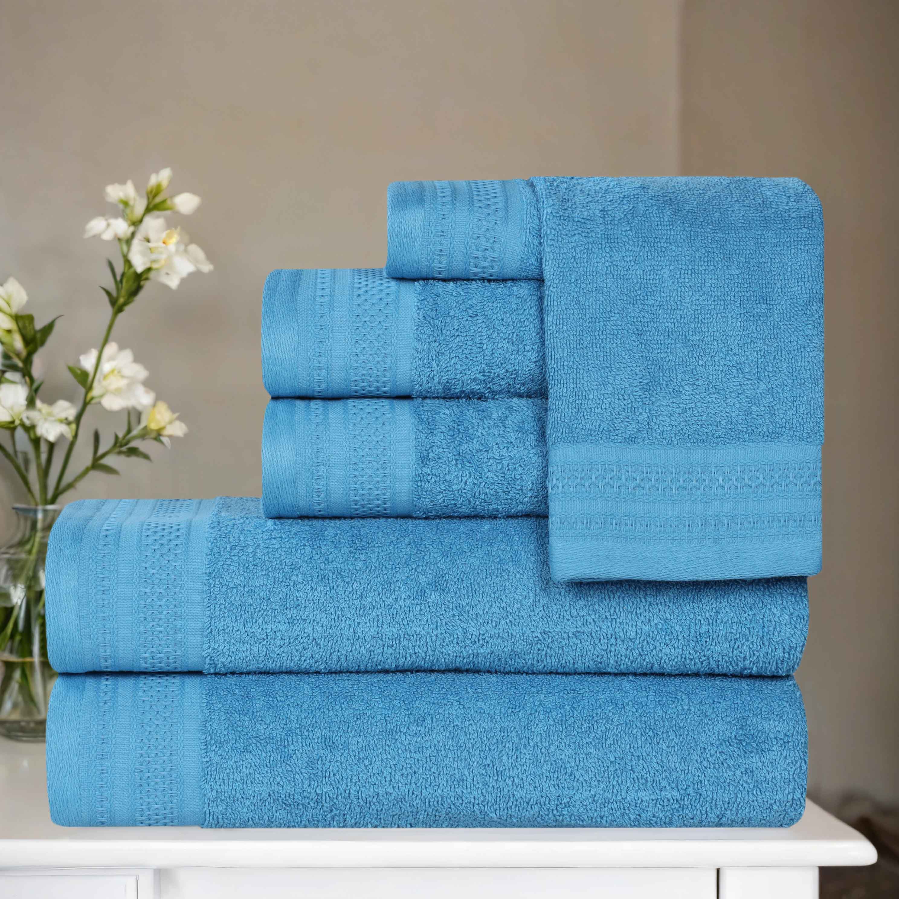 This is a high – quality 6 – piece towel set crafted from 100% cotton. The towels come in a variety of neutral and pastel colors like azure, gold, and sage. Each towel features a decorative honeycomb – like border on a solid – colored main body, adding an elegant touch to the overall design.