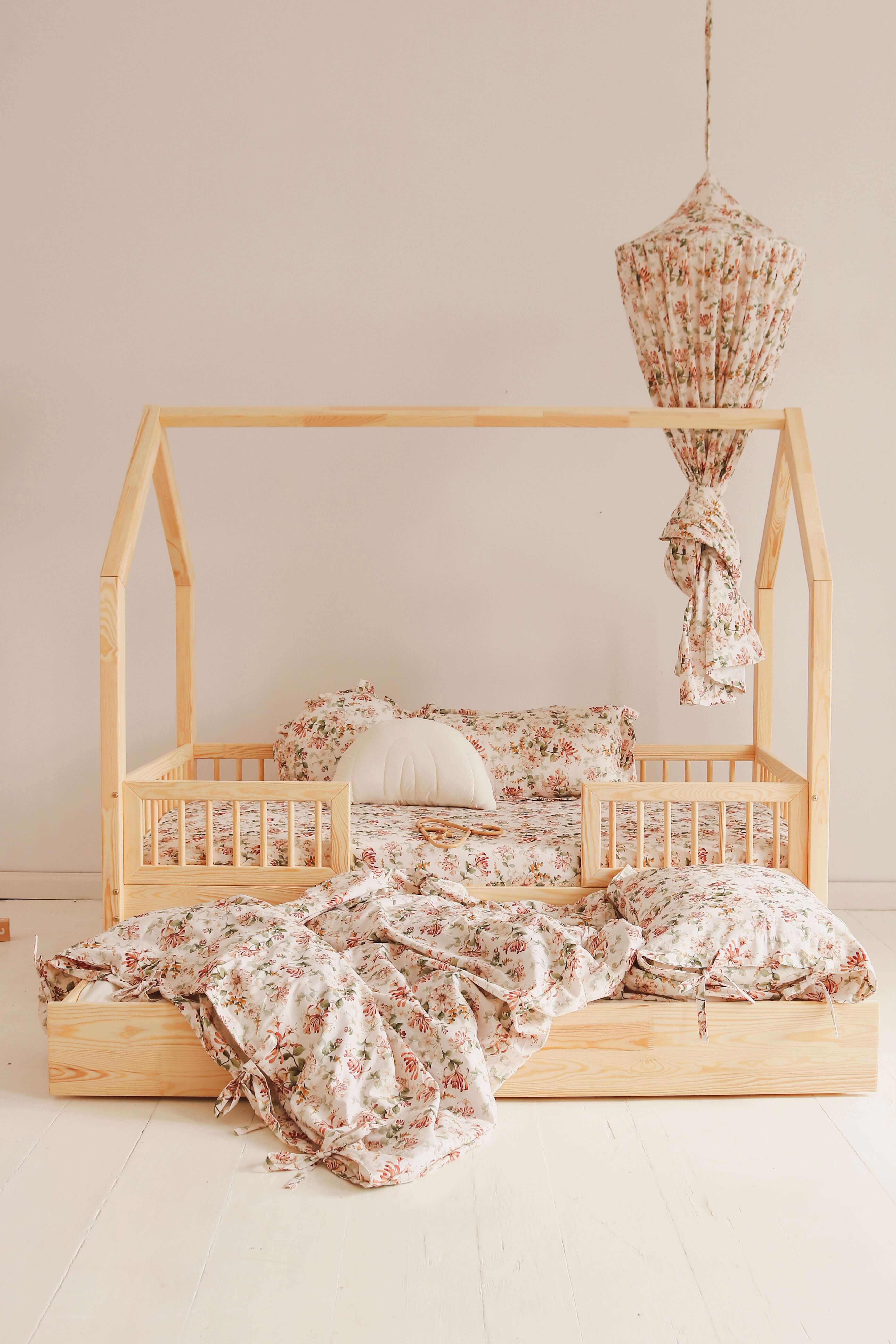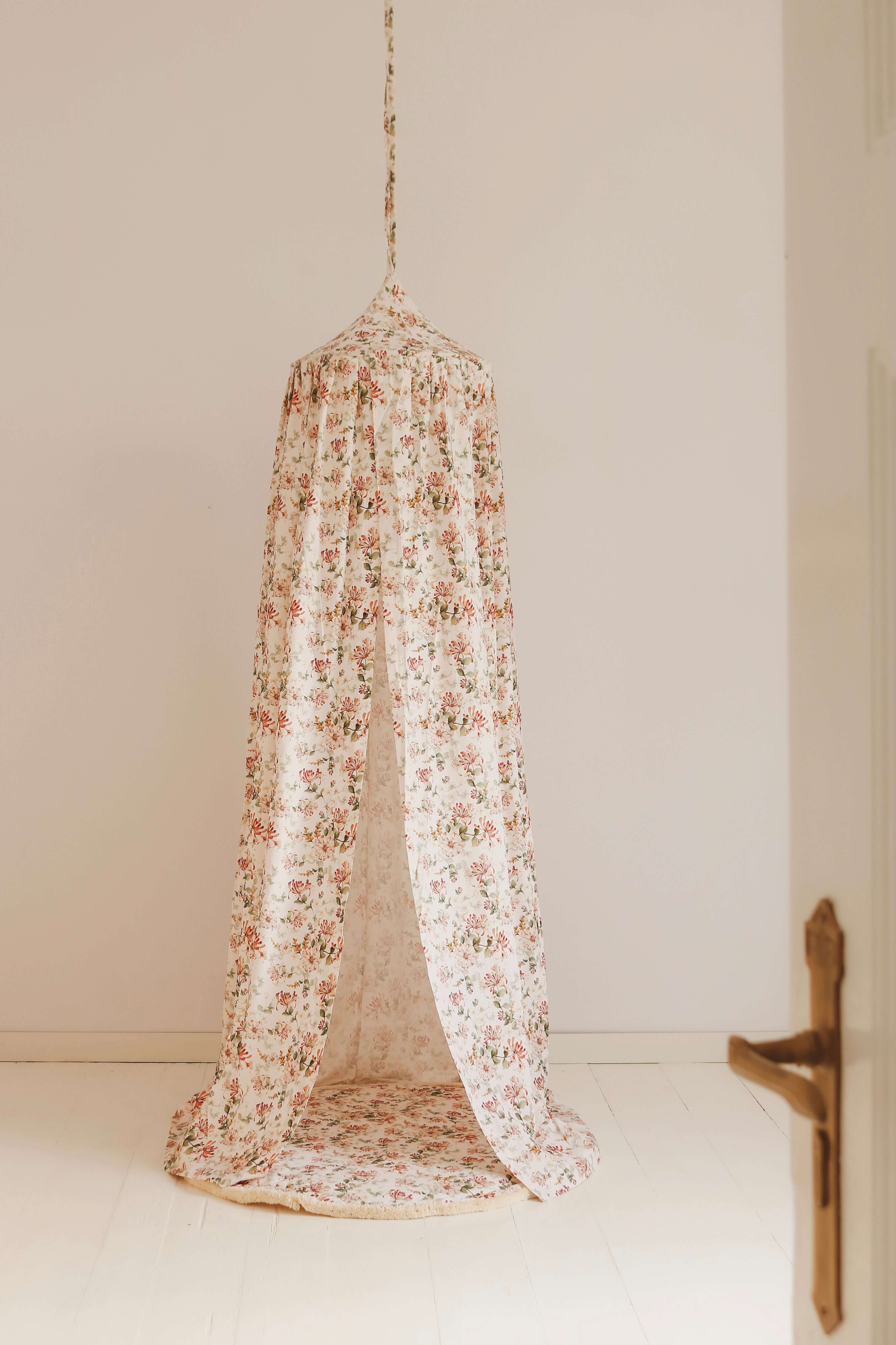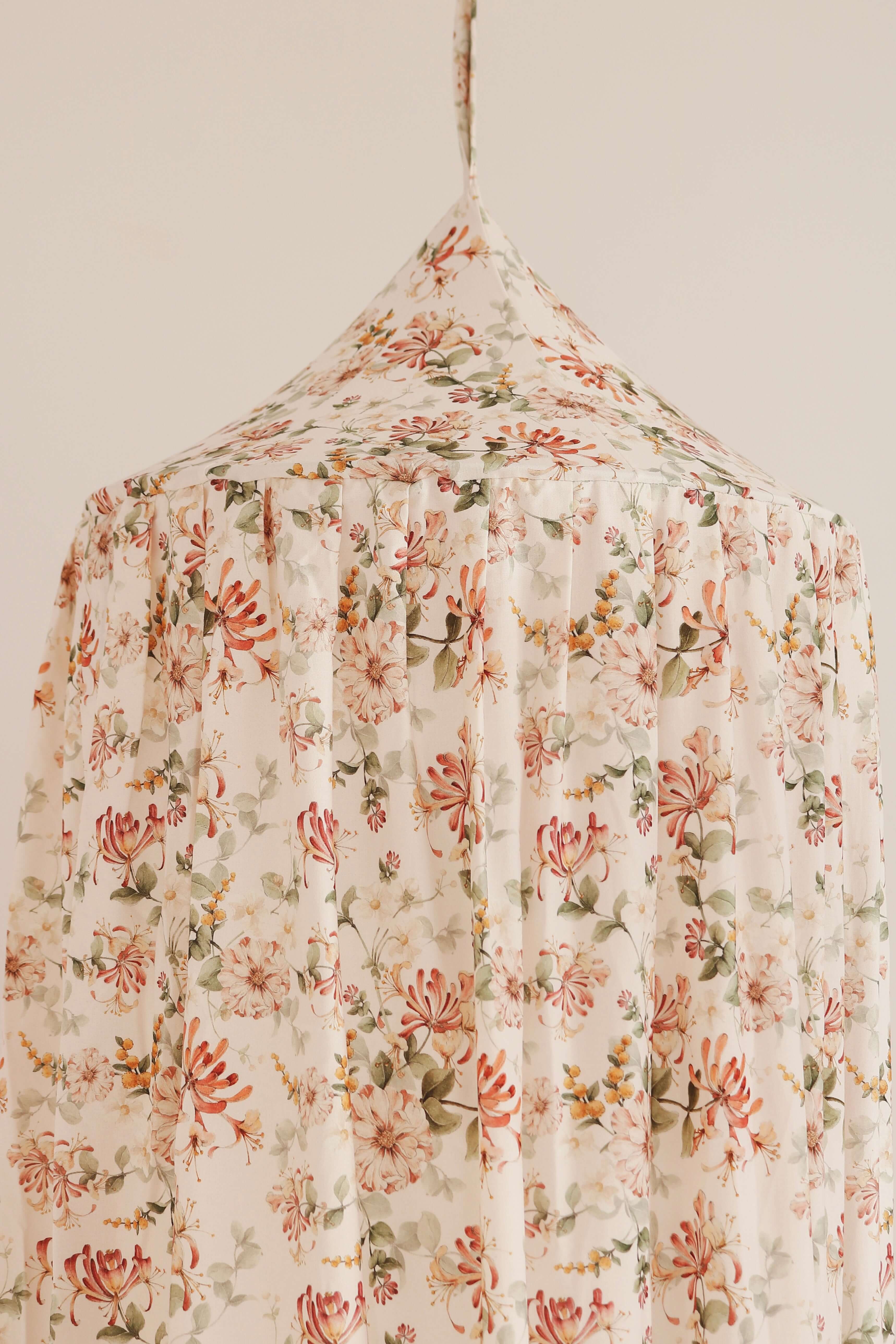 Bring nature-inspired charm to your nursery with our Honeysuckle bed canopy, handcrafted from soft and breathable cotton. The delicate floral print in muted tones sits on a creamy base, offering a calm, timeless look that suits both classic and modern nursery styles. Whether you hang it above a crib, toddler bed, reading nook or play mat – this canopy filters light gently and creates a cozy, magical space for rest or play. A beautiful match for floral, boho or vintage-inspired interiors. Handmade with care in the Netherlands, it’s easy to hang using cotton ties and includes an interior loop for a pendant, mobile or lights. Product details: Fabric: 100% cotton (OEKO-TEX® certified) Color: Cream base with muted honeysuckle floral pattern Height: approx. 235 cm (fabric) + 60 cm hanging ties Hoop diameter: 50 cm (metal hoop included and hidden inside) Mounting: Cotton fabric ties – fits any ceiling hook Interior loop: For hanging a pendant, mobile, or fairy lights Washing: Remove hoop before washing. Machine wash at 30°C (gentle cycle), air dry Preparation time: 2–3 business days Handmade in the Netherlands by Matuu Perfect for: • Crib or toddler bed canopy • Botanical or floral nursery styling • Vintage, romantic or gender-neutral baby rooms • Handmade gift for baby showers or birthdays