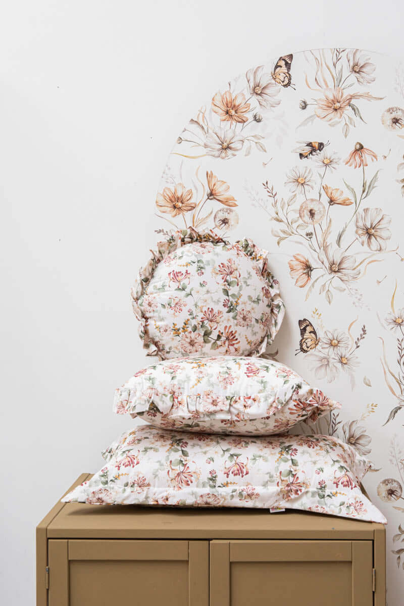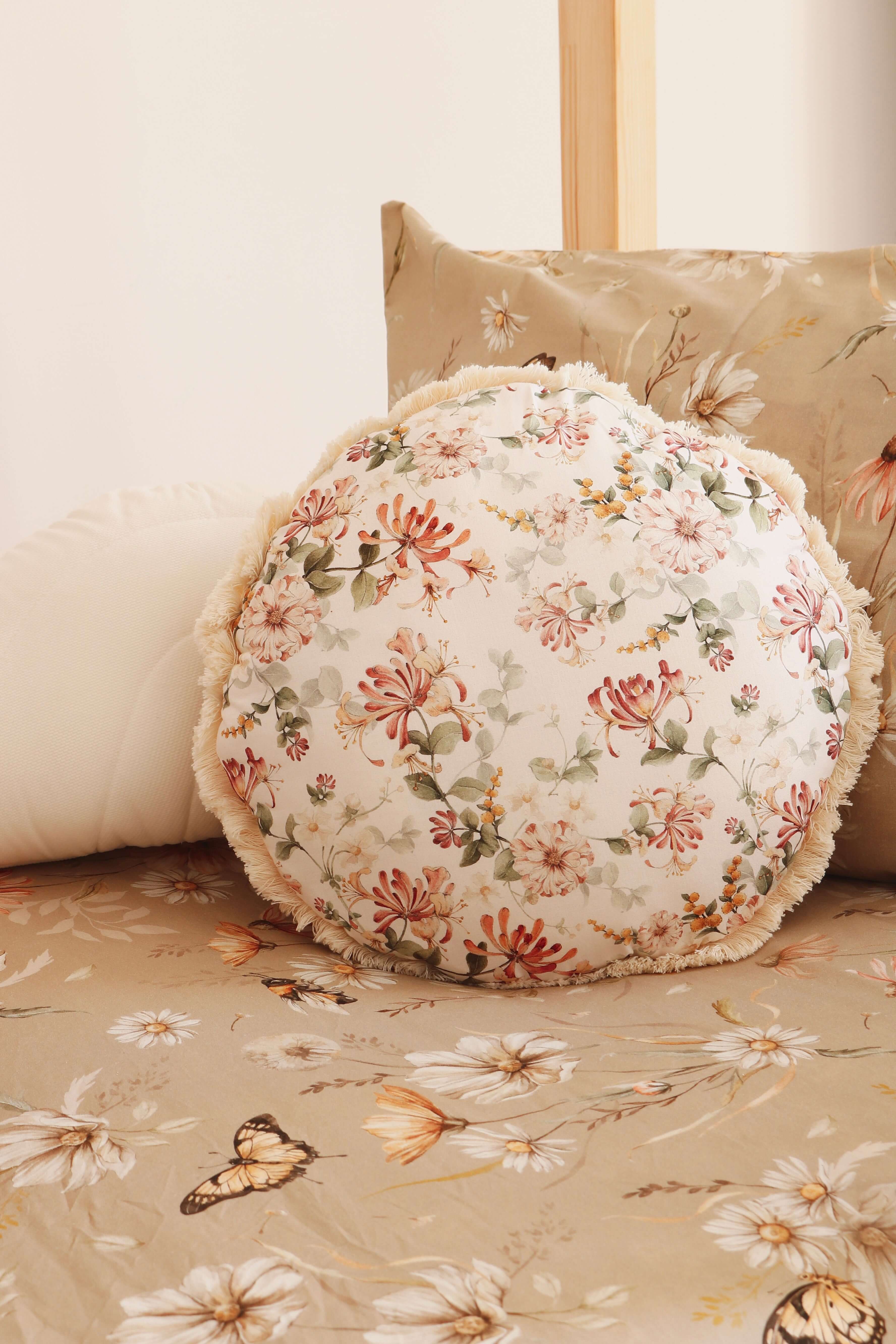 Gorgeous cotton pillow available in 3 shapes: – Round – with romantic ruffles, adding the lightness and vintage look to your interior (diameter 40 cm) – Round – with beige fringe (diameter 40 cm)- Square – with romantic ruffles, adding the lightness and vintage look to your interior (size 50x50cm)- Rectangle – with minimalistic fills (size 40x70cm) You can combine different pillows to discover better results. Washing instruction: Machine wash in 40 degrees, dry flat Processing time: 1-3 work days