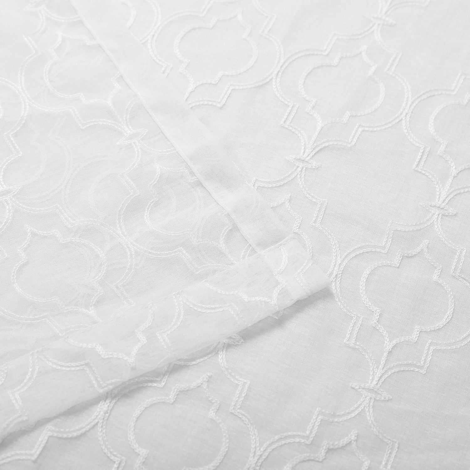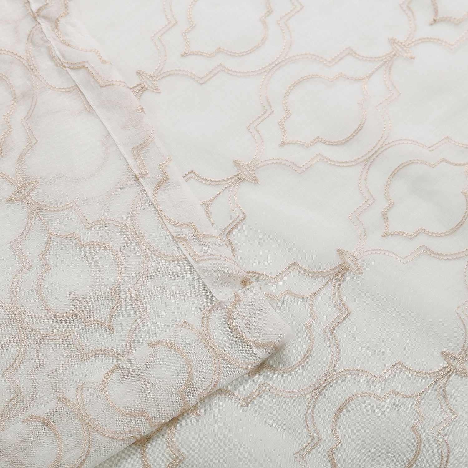 This curtain panel set is a perfect window treatment for residential spaces. Crafted from a sheer, lightweight fabric, it allows natural light to filter through while adding an elegant touch to any room. The repeating geometric pattern in a champagne color is uniformly stitched across the fabric, creating a refined and decorative look.
