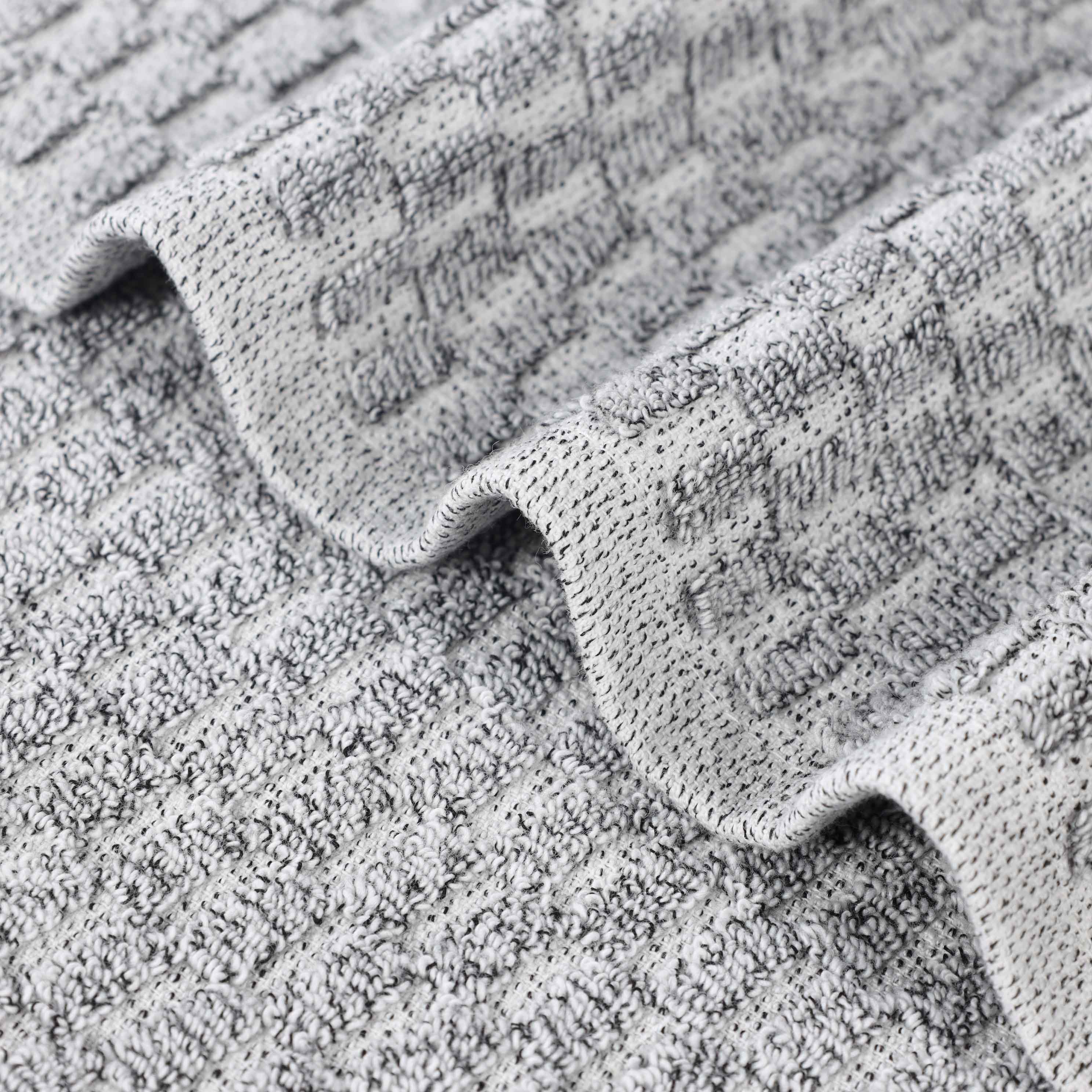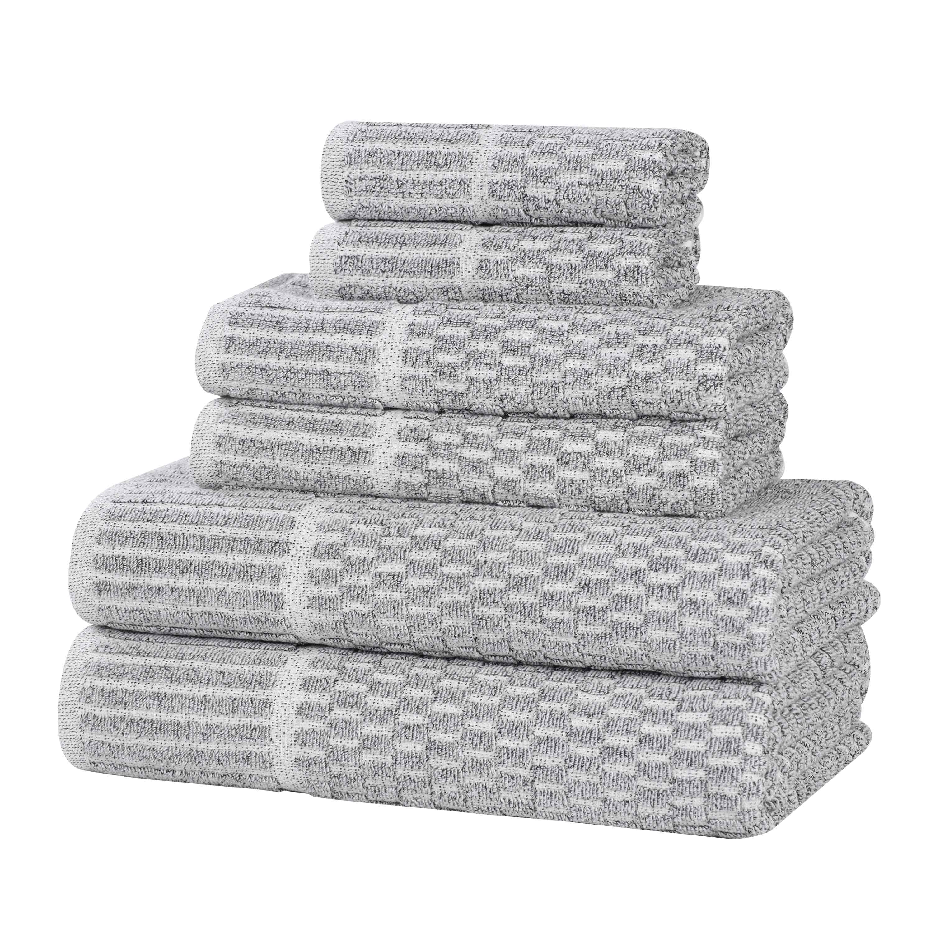 This is a 6 piece towel set perfect for bathroom use. It features a two – toned color scheme with a light base and a darker complementary shade. The towels are made of a blend of 80% cotton and 20% viscose, resulting in a plush, absorbent, and durable fabric with an embossed checkered pattern.