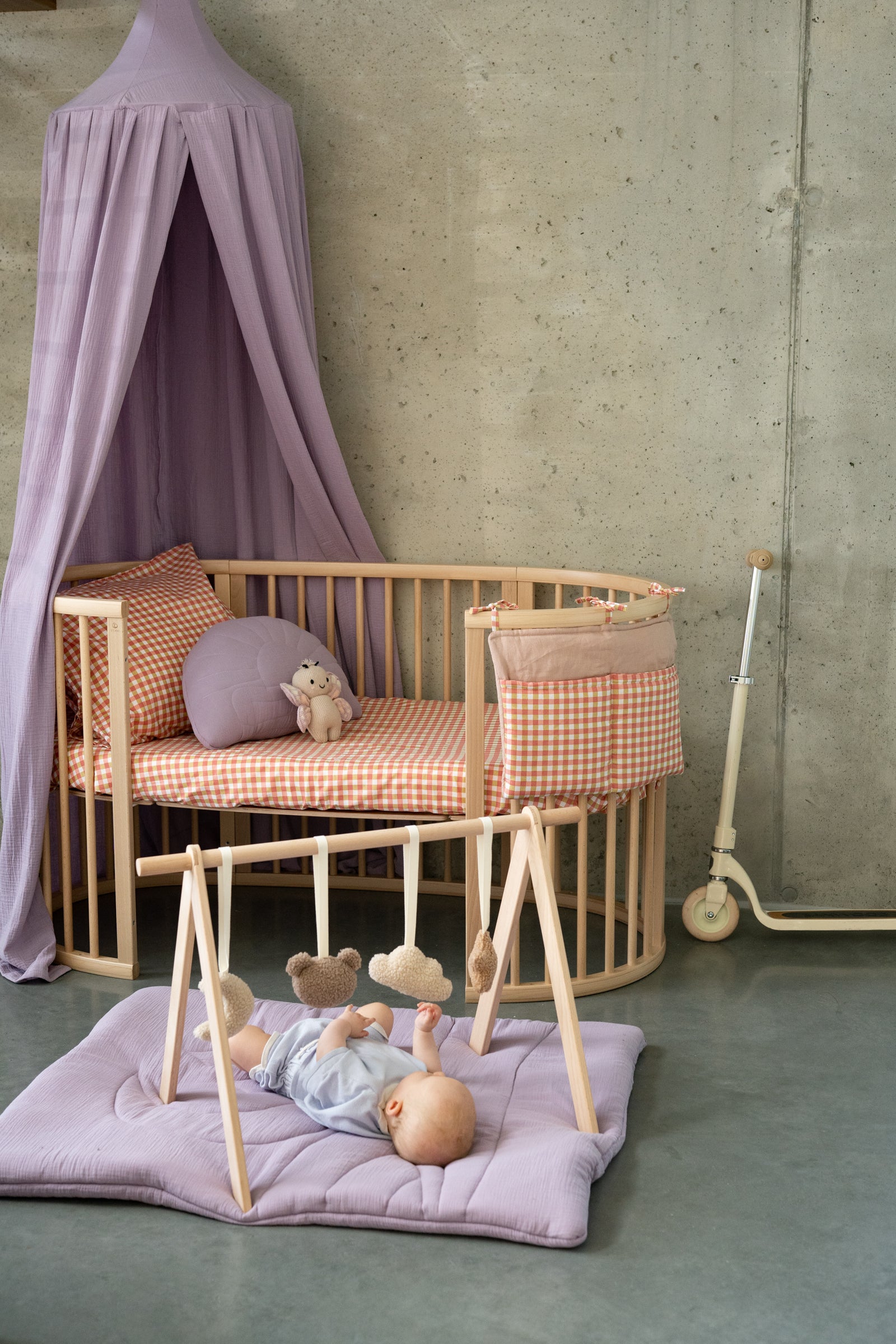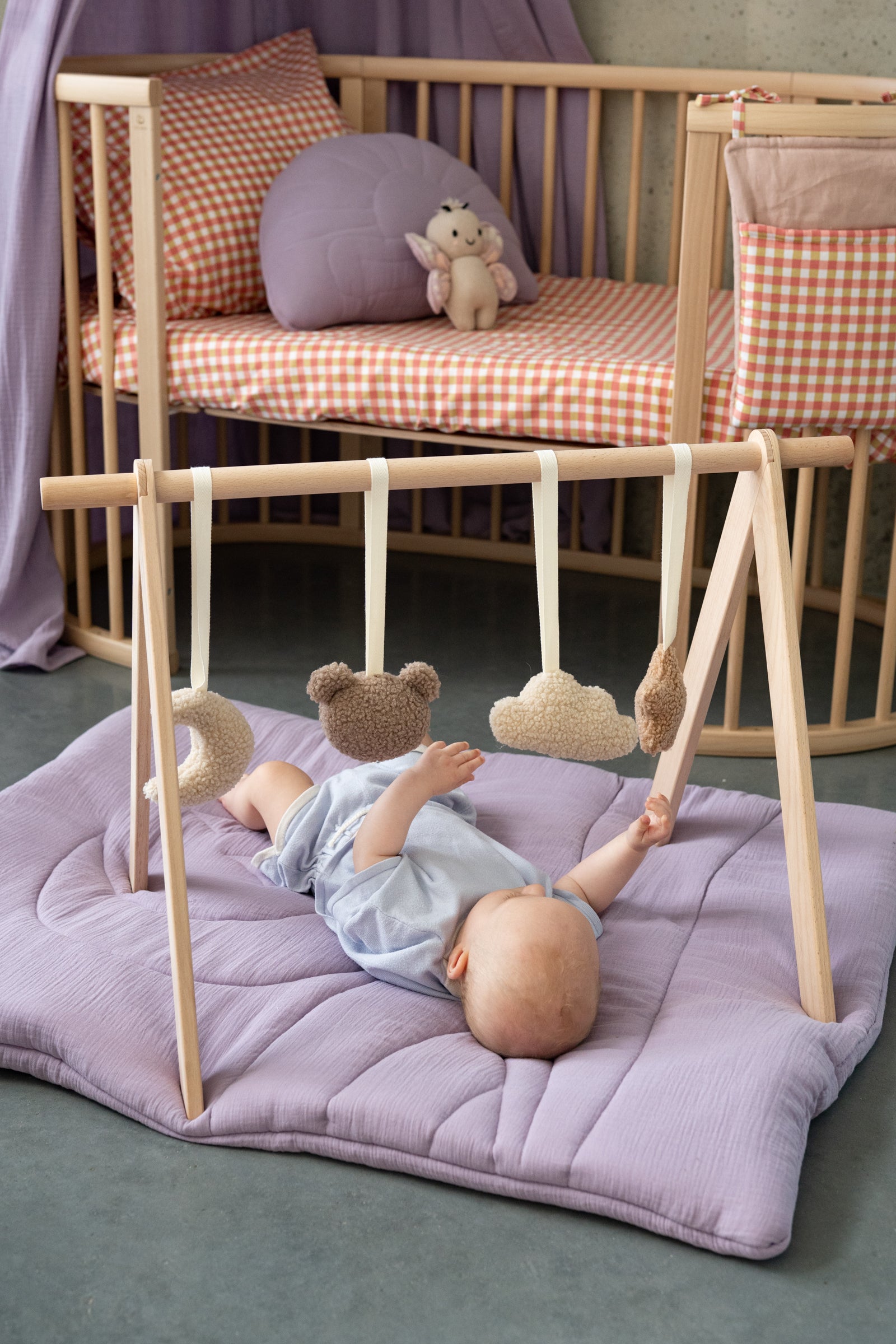 Quilted Playmat can be used for a newborn in a babybox or a play mat on the ground. Later as a stylish rug, bedcover for your toddler or on the wall as wallhanging. Soft baby muslin playmat with OEKOTEX-certified. Hypoallergenic filling. Color: ย lilac *small differences in the quilted illustration and mats may appear as everything is handmade and quilted by heart. Can be washed at 30ย degrees Delivery time: 1-3 business days (counting from the next business day)
