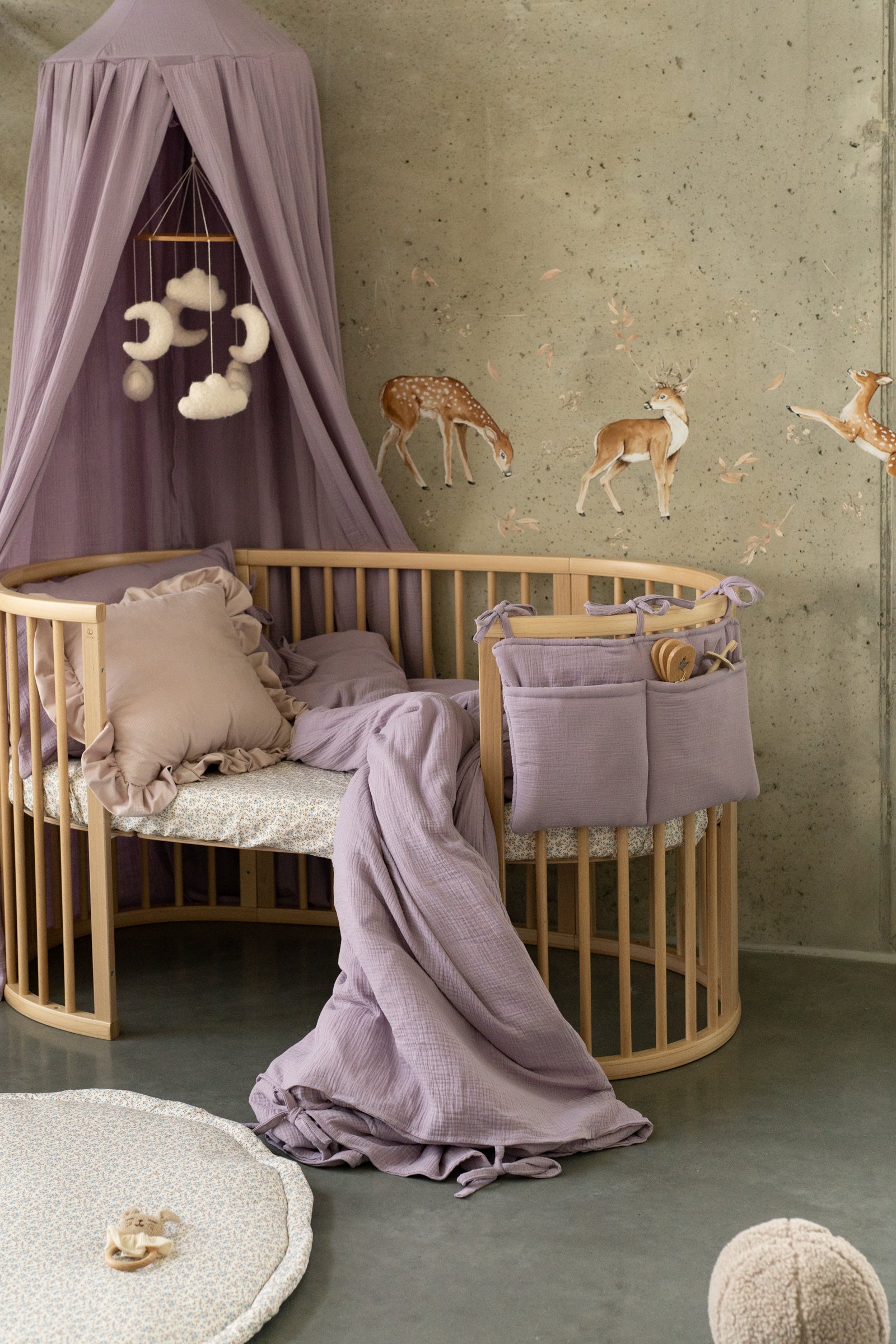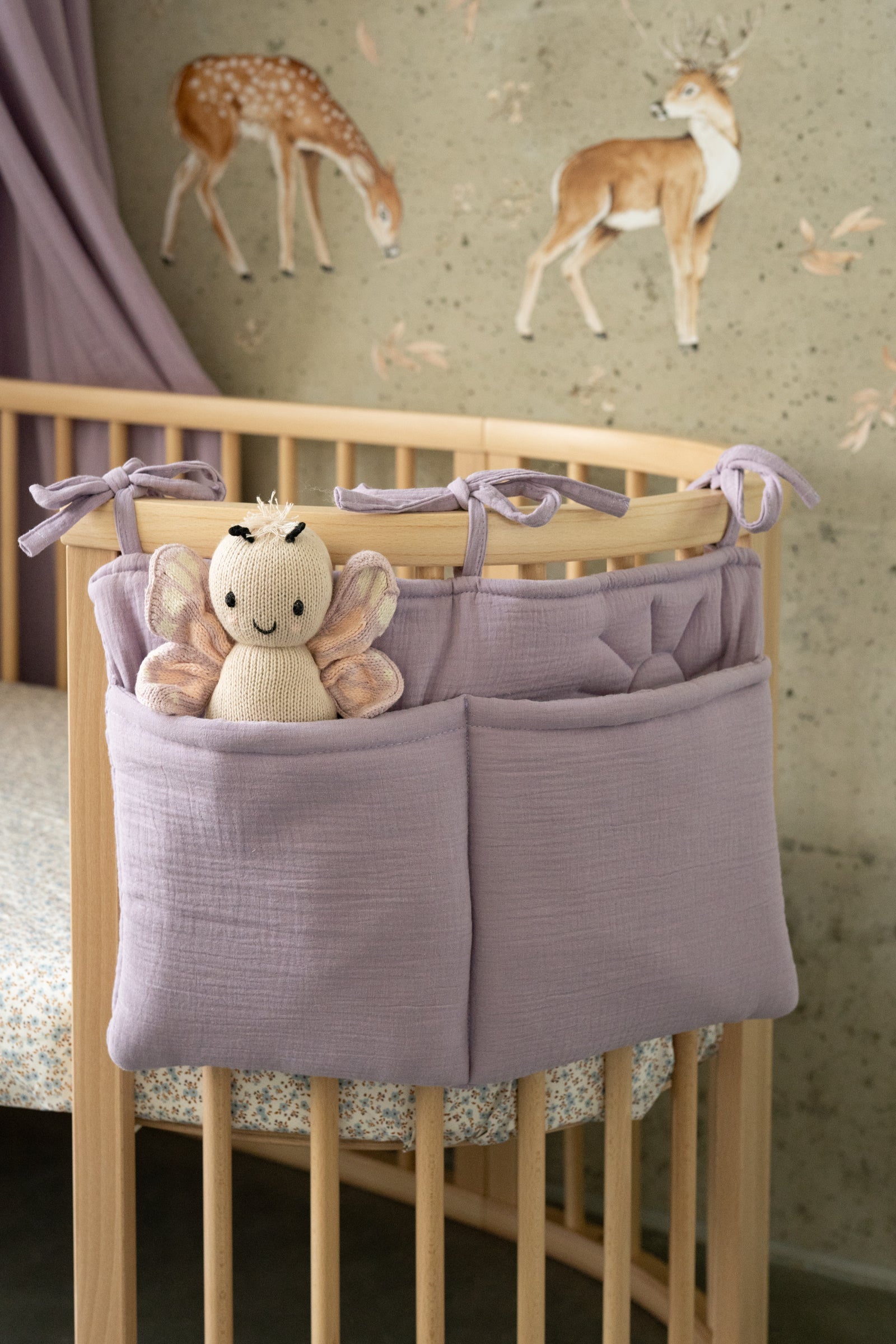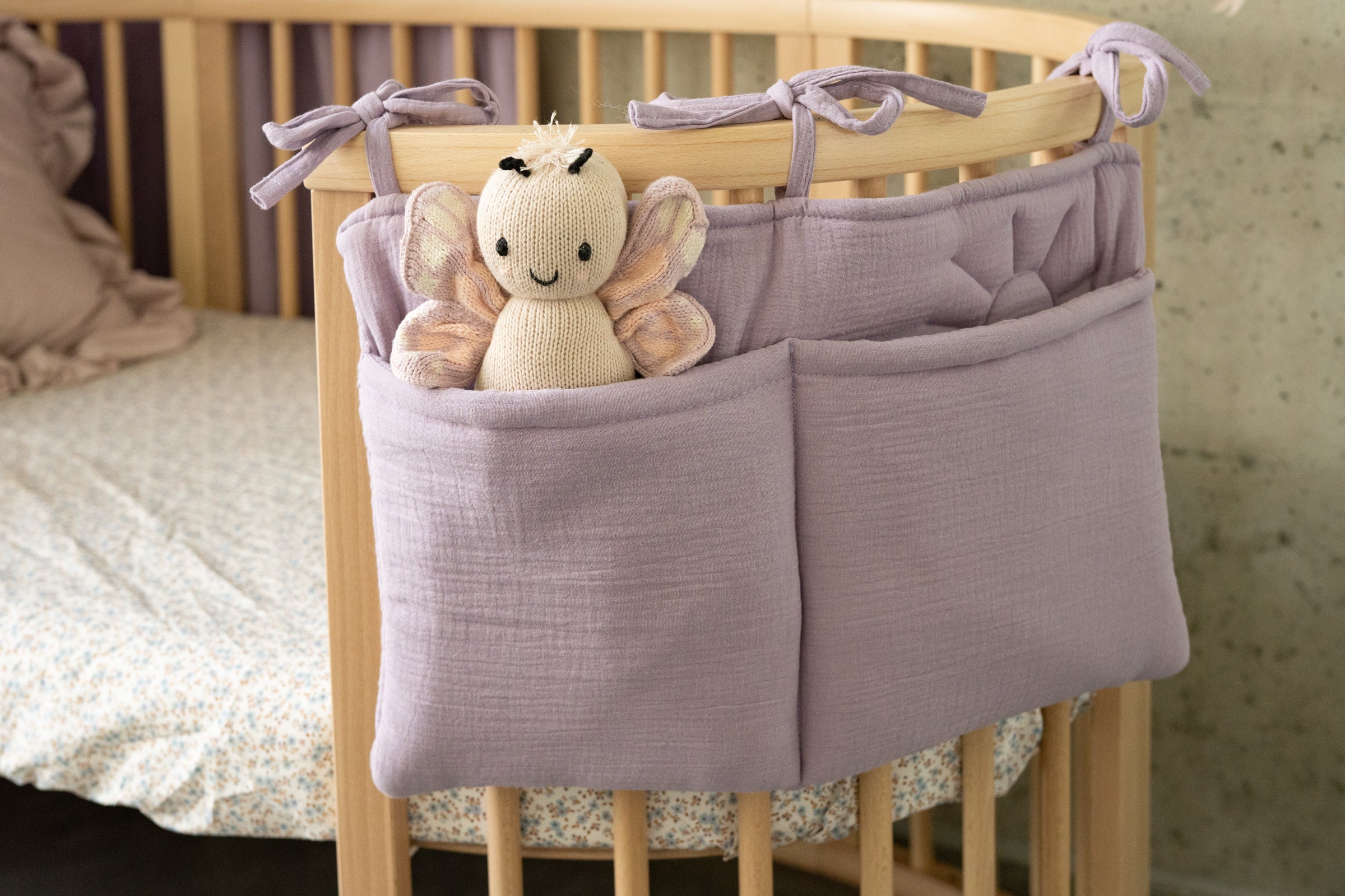 Keep baby essentials close at hand with this beautiful crib organizer in a soft lavender tone. Handmade by me (Roksana, heart of Matuu) in Amsterdam, this bed pocket is crafted from breathable, baby-friendly muslin cotton. Itβs perfect for keeping pacifiers, toys, wipes or bedtime books organized and within reach. Easy to tie onto a crib, playpen or toddler bed using secure cotton straps. A lovely match with lavender bedding, natural wood and calm nursery tones. Stylish, practical and ready to bring peace and order to your daily routine. Details β’ Size: 50 Γ 32 cm β’ Fabric: 100% muslin cotton β’ Machine washable at 40Β°C β’ Preparation time: 2β3 business days β’ Handmade in the Netherlands There is a possibility to make a bed pocketΒ in other size, let me know if you are interested