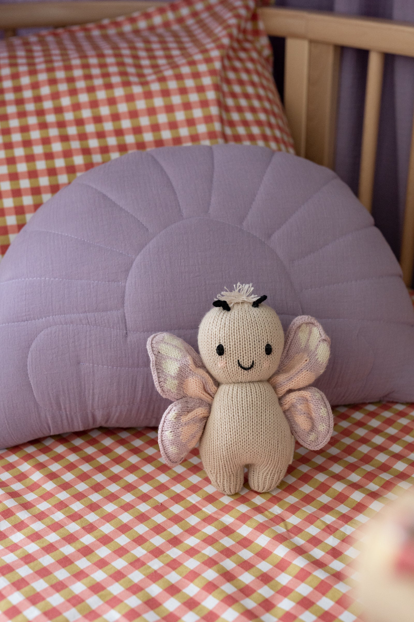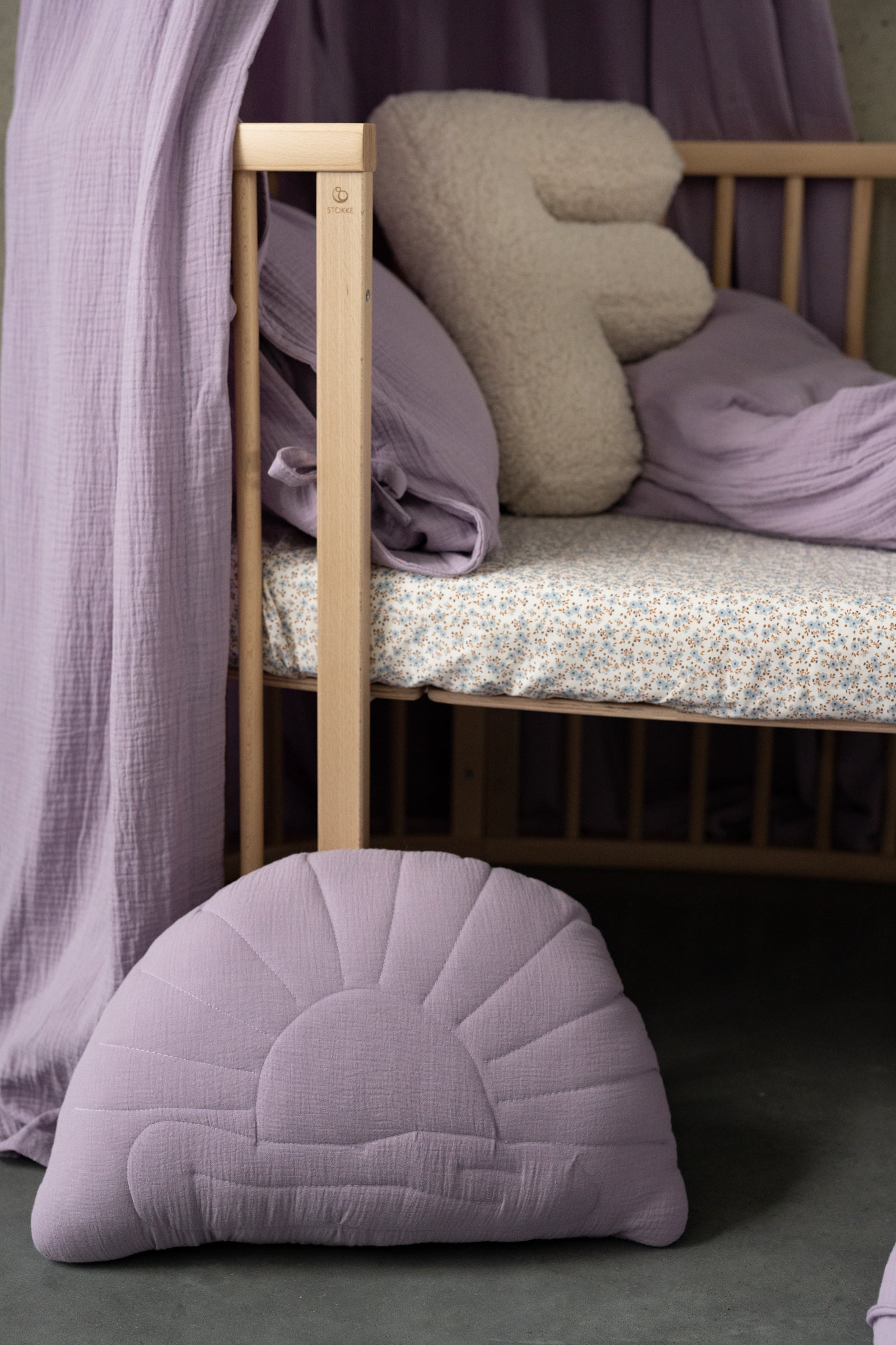 Lovely soft pillow in the shape of a half circle, in a hand-embroidered sun on a cloud. Perfect decoration and toy for childโs room or play corner. Dimensions: height: 35 cm, width: 45 cm Fabric : lilac muslin fabricย Filled with light and soft silicone balls Processing time: 1-3 work days Designed, made and quilted by hand in the Netherlands