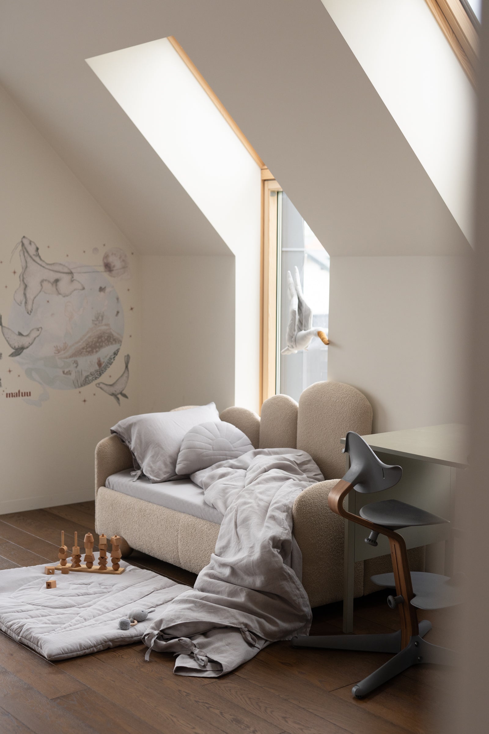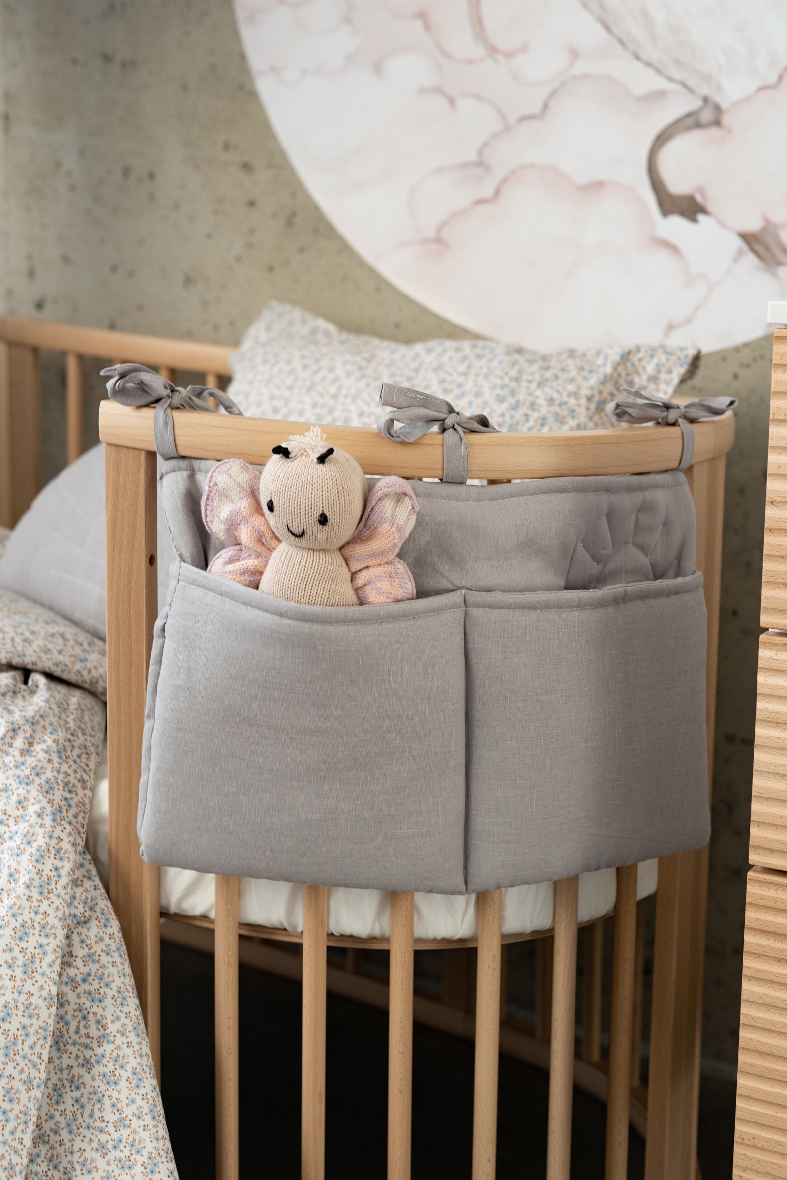 With your baby at home, you want to keep the essentials within reach — and look good doing it! Our Light Grey linen bed pocket organizer combines everyday functionality with timeless design. Handmade from soft, breathable linen and quilted for structure, it easily ties to the crib or playpen with simple fabric straps. Perfect for storing pacifiers, wipes, small toys or bedtime books — all in one beautiful, natural place. Its neutral grey tone pairs effortlessly with any interior style: from boho nurseries to minimalist or Scandinavian rooms. Whether you’re decorating your baby’s first room or looking for a thoughtful gift, this organizer adds beauty and calm to your daily routine. Why parents love it: ✓ Timeless, earthy color – easy to style in neutral, bohemian or Scandinavian interiors ✓ Natural look and feel – made from high-quality linen ✓ Lightweight, durable, and soft – with quilted back and decorative sun stitching ✓ Machine washable at 40°C – easy to care for ✓ Handmade with care in NL – a unique and thoughtful gift for new parents Details: • Dimensions: 50 x 32 cm • Fabric: 100% linen • Filling: Oeko-Tex® certified soft polyester • Ties: adjustable fabric ties for easy attachment • Preparation time: 2–3 business days Whether you’re setting up a calming nursery, preparing for a new arrival, or looking for a practical yet stylish gift – this linen crib organizer offers the perfect balance of beauty and utility.