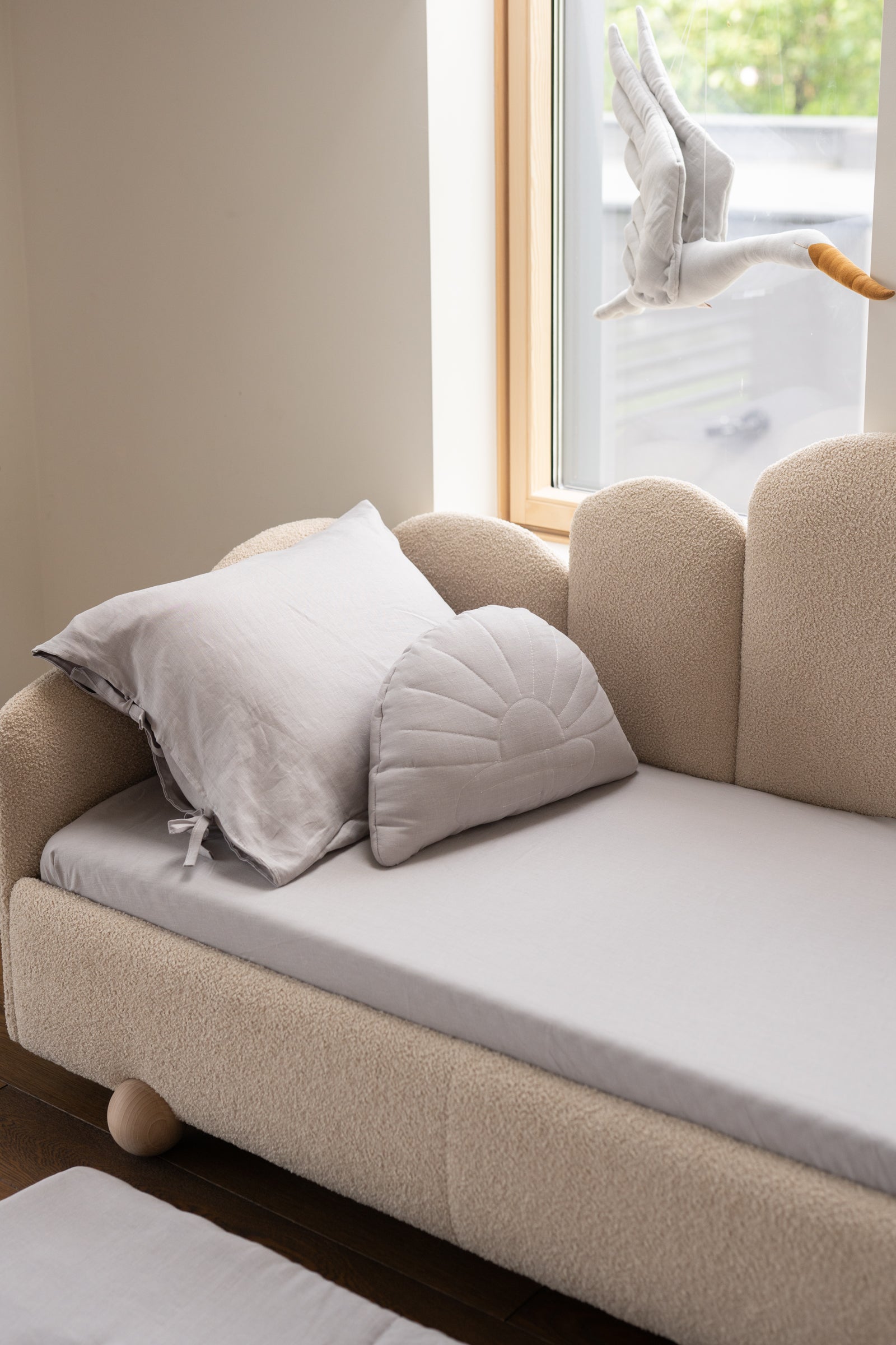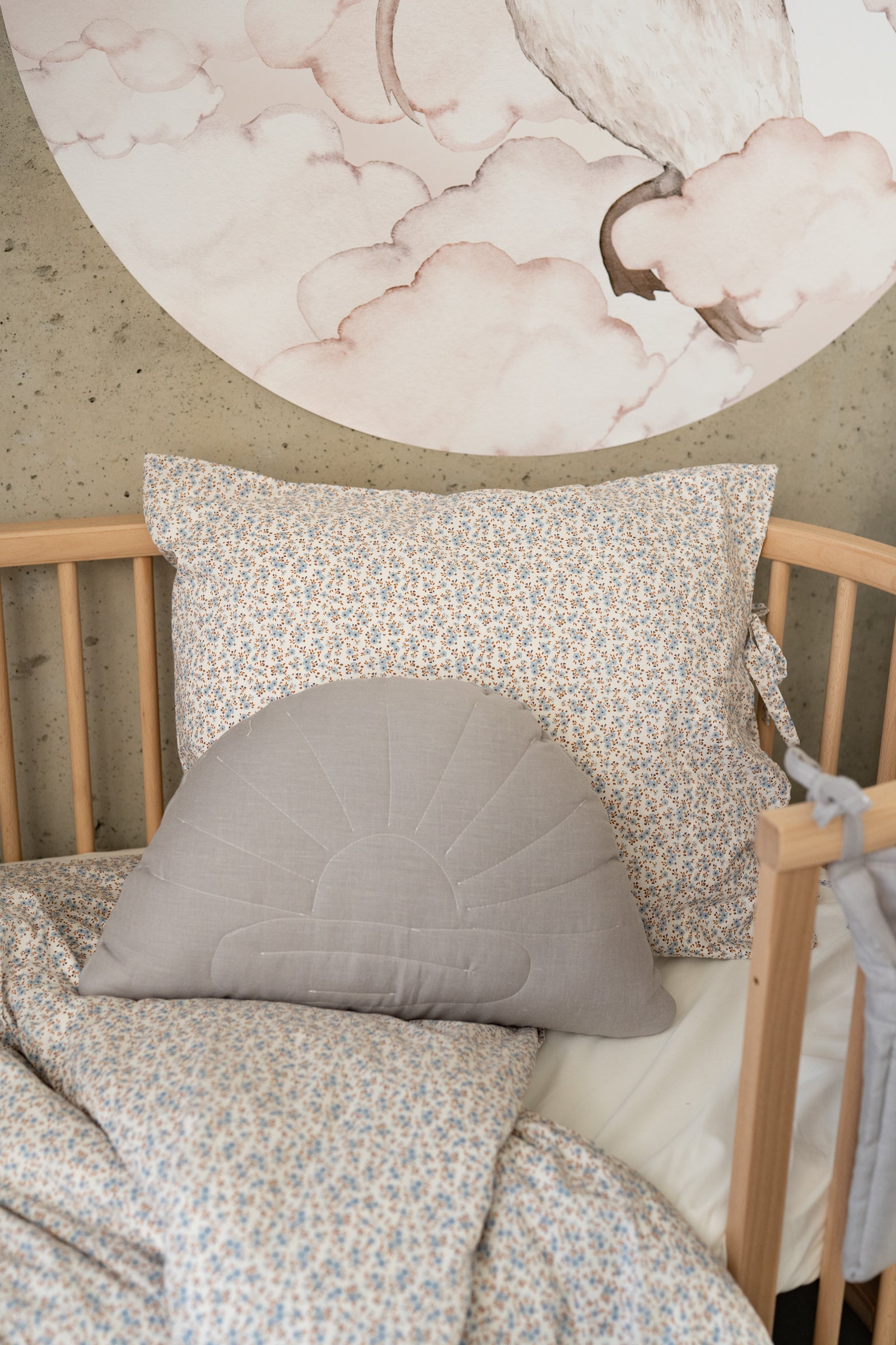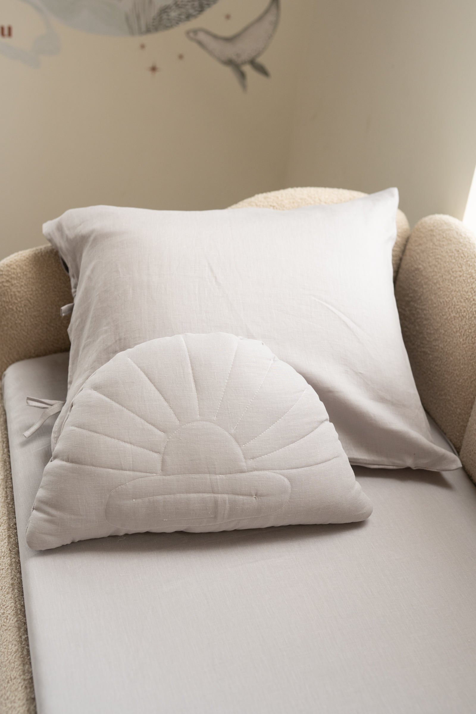 Lovely soft pillow in the shape of a half circle, in a hand-embroidered sun on a cloud. Perfect decoration and toy for child’s room or play corner. Dimensions: height: 35 cm, width: 45 cm Fabric : light grey linen fabric Filled with light and soft silicone balls Processing time: 1-3 work days Designed and made and quilted by hand, in Amsterdam, the Netherland