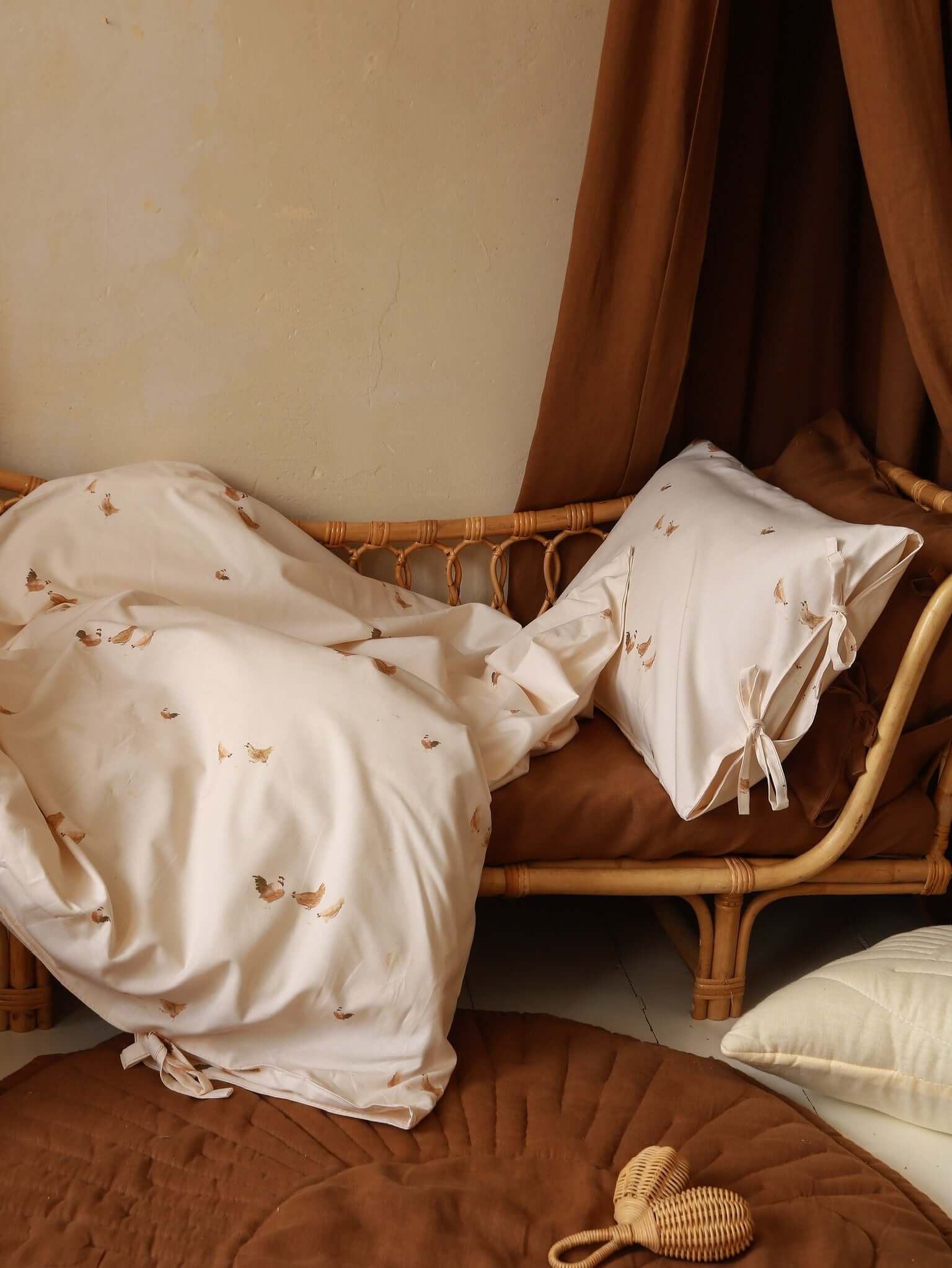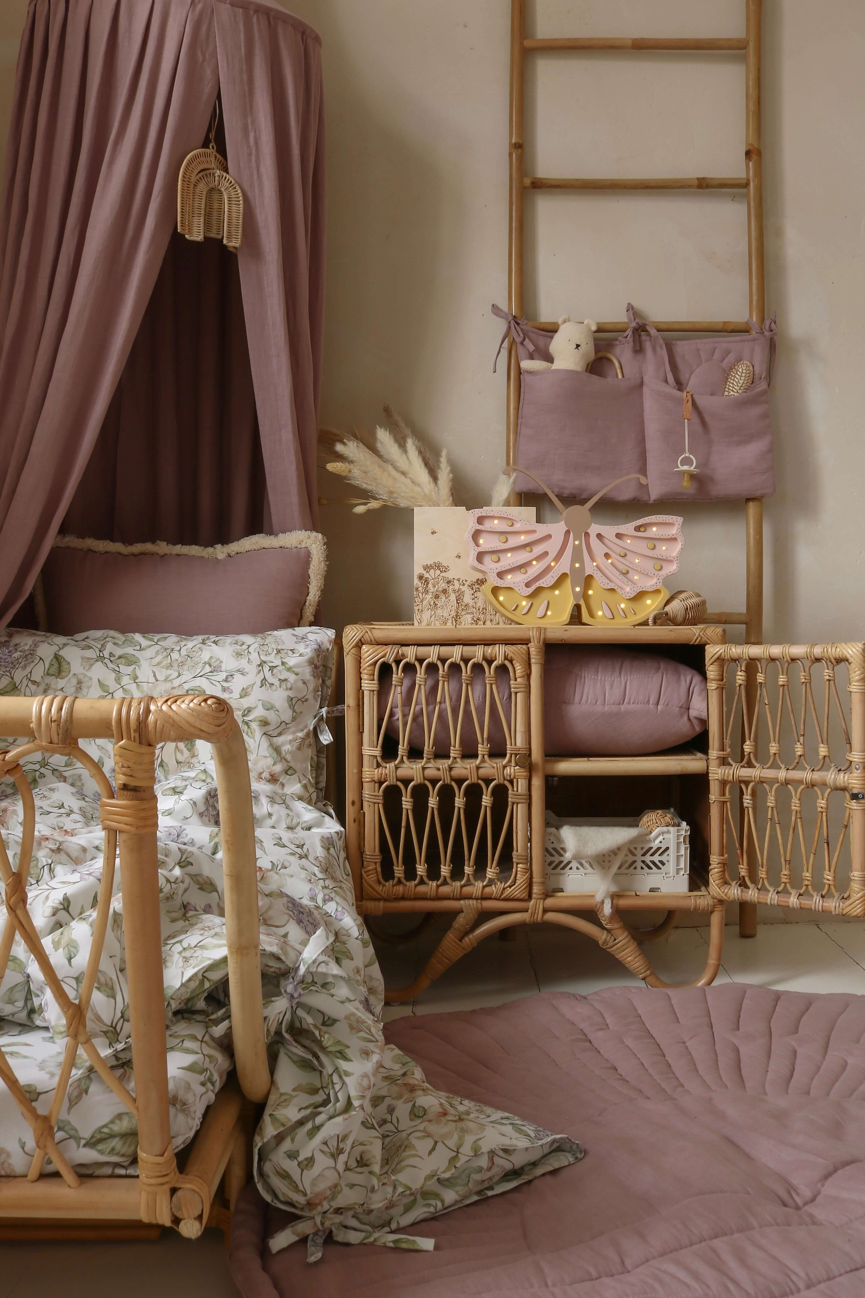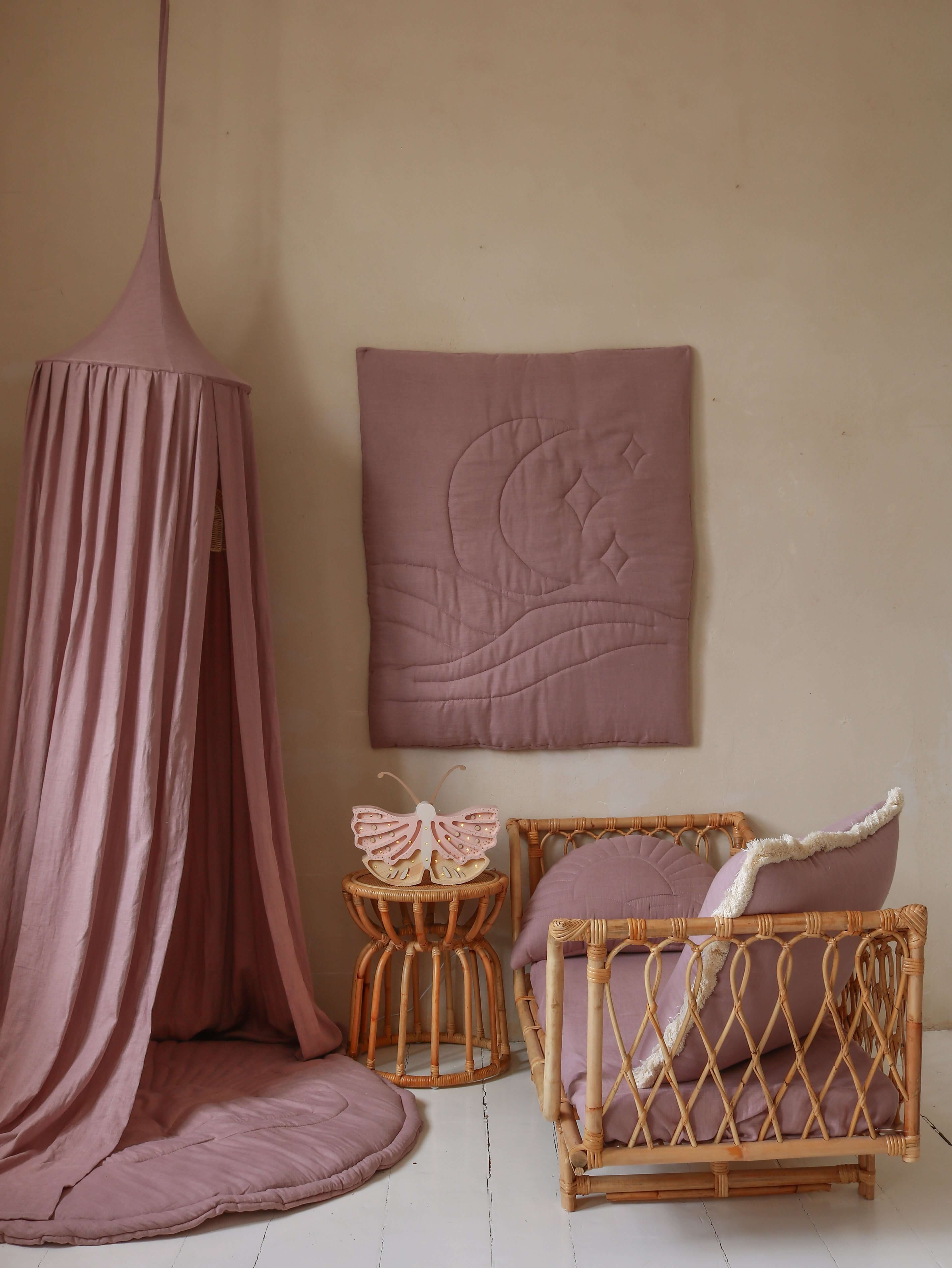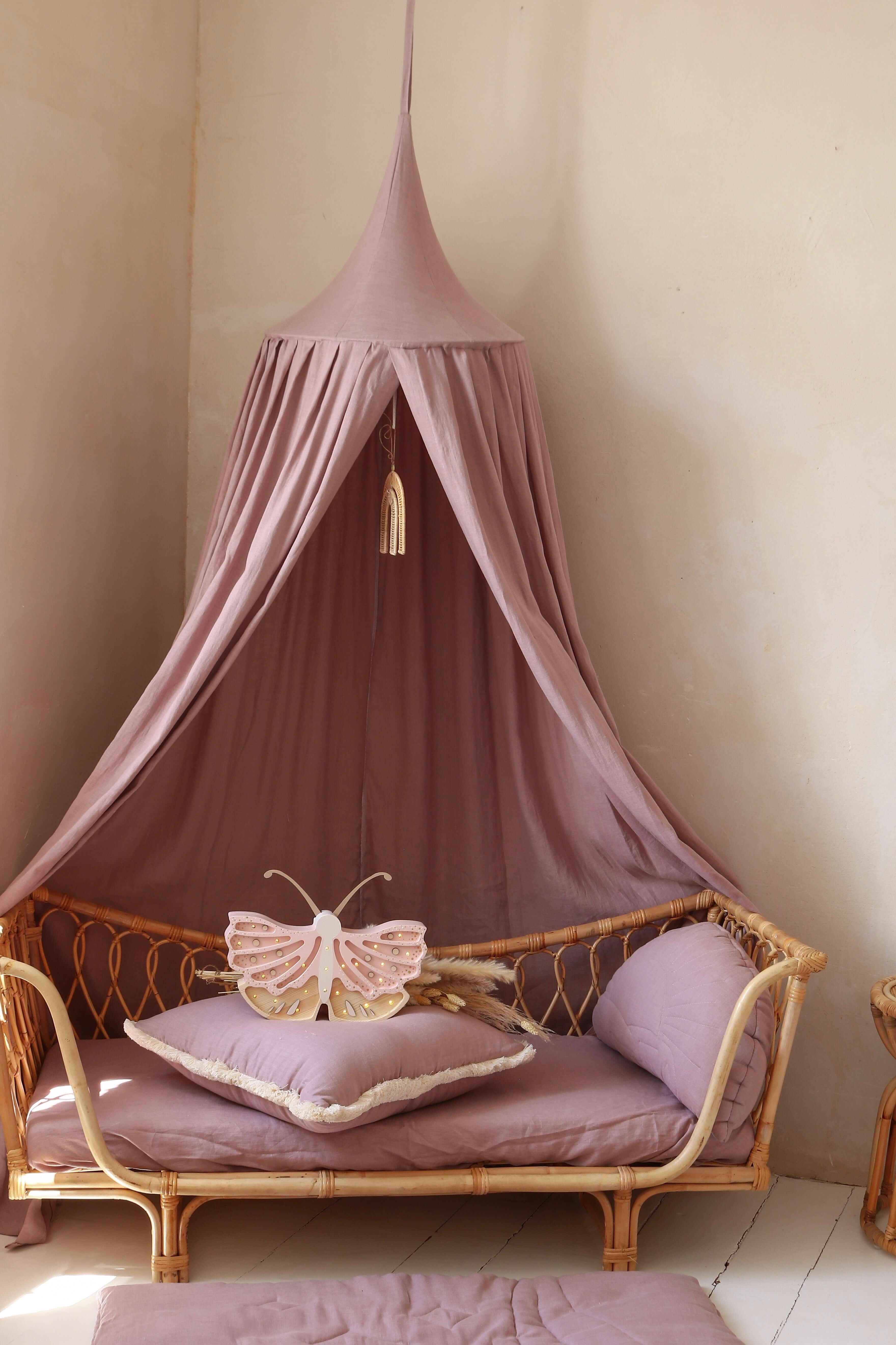 Create a serene and elegant space with our Lilac Linen canopy, handcrafted from premium-quality European linen in a soft, muted lilac shade. This airy bed canopy gently filters the light, creating a peaceful nook for rest, reading, or play. Its natural texture and subtle color make it perfect for boho, Japandi, vintage or gender-neutral interiors. Hang it above a crib, toddler bed or cozy play corner to instantly add a calming, dreamy atmosphere to your childβs room. Thoughtfully made with a hidden metal hoop, long cotton ties for secure hanging, and an interior loop to hang a mobile, pendant or fairy lights. Designed and handcrafted with care in the Netherlands by Matuu. Product details: Fabric: 100% linen β breathable, natural and durable Color: Muted lilac / dusty lavender Height: approx. 235 cm (fabric) + 60 cm cotton hanging ties Hoop diameter: 50 cm (metal hoop included, hidden inside) Mounting: Two cotton straps β fits any ceiling hook Interior loop: For pendant, mobile or fairy lights Washing: Remove hoop before washing. Machine wash at 30Β°C (gentle), air dry Preparation time: 2β3 business days Handmade in the Netherlands by Matuu Perfect for: β’ Crib or toddler bed canopy β’ Japandi or boho-style nursery β’ Calming, gender-neutral baby room β’ Elegant, handmade baby shower gift