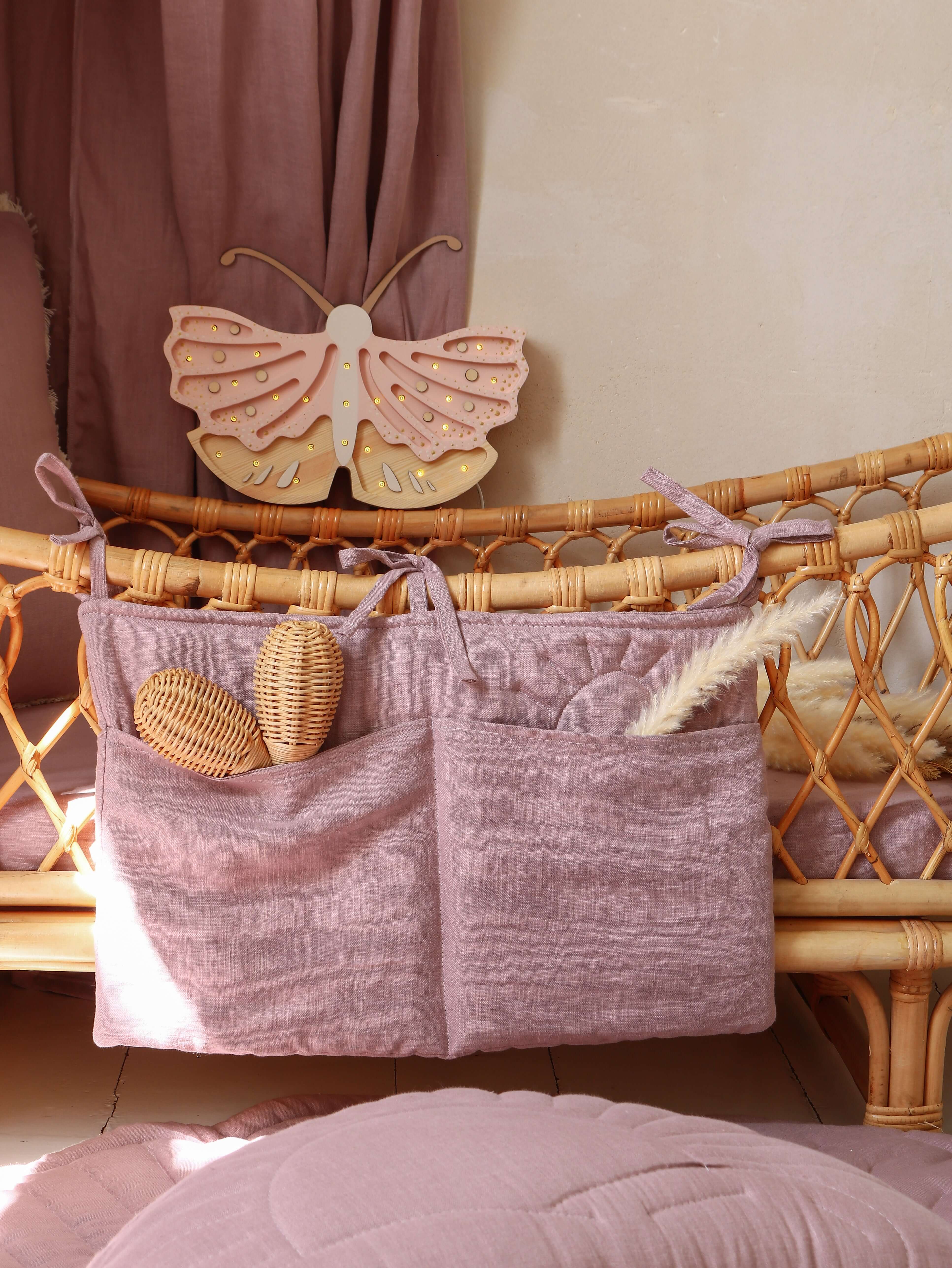 Bring natural elegance and smart storage to your nursery with our Lilac Sun linen crib organizer – the perfect blend of functionality and timeless style. This beautifully handcrafted bed pocket in a muted lilac tone is designed to complement minimalist, boho, and Japandi-inspired interiors. Made from 100% soft linen (OEKO-TEX® certified) and padded with hypoallergenic filling, this crib organizer is breathable, durable, and gentle on your baby’s sensitive skin. The charming sun embroidery adds a delicate decorative detail while maintaining a clean, calm aesthetic. With two roomy pockets, it’s ideal for storing all your baby’s essentials – from diapers and pacifiers to muslin cloths or favorite toys. The organizer ties securely to the side of a crib, cot, or toddler bed and can be easily removed for cleaning. A practical yet stylish solution to keep your baby’s space beautifully organized. Why parents love it: ✓ Timeless, earthy color – easy to style in neutral, bohemian or Scandinavian interiors ✓ Natural look and feel – made from high-quality linen ✓ Lightweight, durable, and soft – with quilted back and decorative sun stitching ✓ Machine washable at 40°C – easy to care for ✓ Handmade with care in NL – a unique and thoughtful gift for new parents Details: • Dimensions: 50 x 32 cm • Fabric: 100% linen • Filling: Oeko-Tex® certified soft polyester • Ties: adjustable fabric ties for easy attachment • Preparation time: 2–3 business days Whether you’re setting up a calming nursery, preparing for a new arrival, or looking for a practical yet stylish gift – this linen crib organizer offers the perfect balance of beauty and utility.