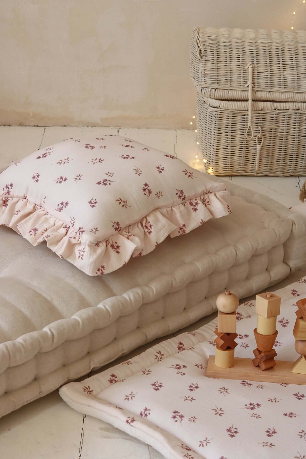 - Evenly gathered ruffled trim on pillows for a soft and playful look