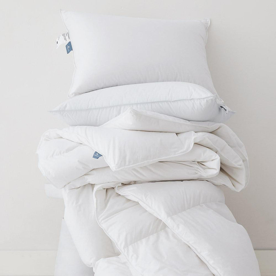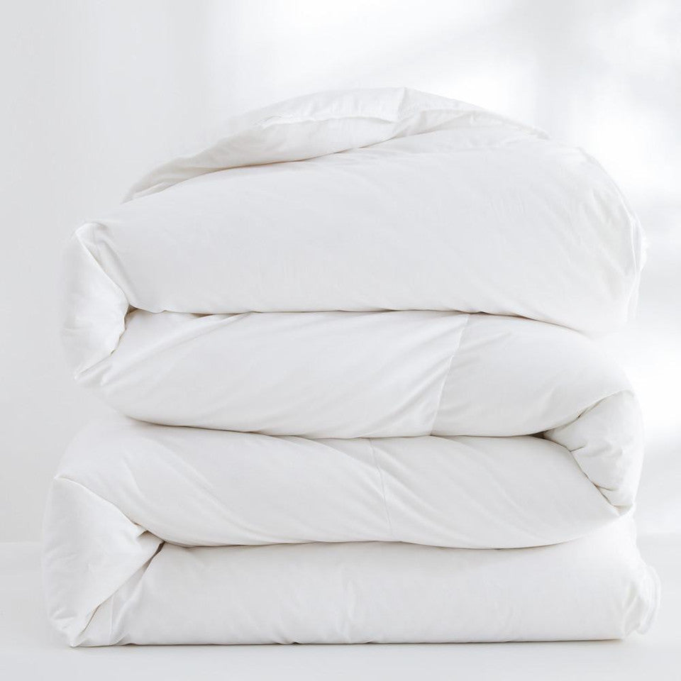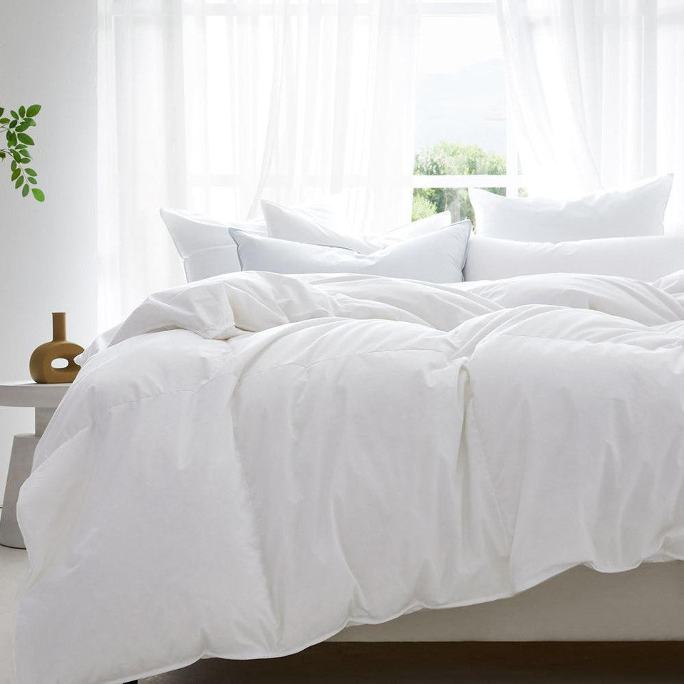 This box-stitched luxury down comforter offers an unparalleled blend of comfort and elegance. It is filled with 800 fill power white goose down of European origin, providing exceptional warmth. The outer shell is a 348-thread count German milled micro twill with batiste yarns, and it has a smooth, breathable texture.