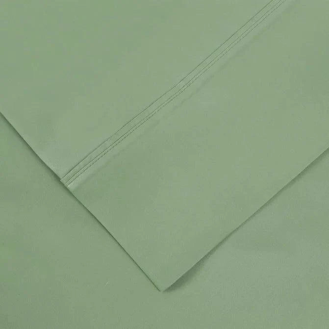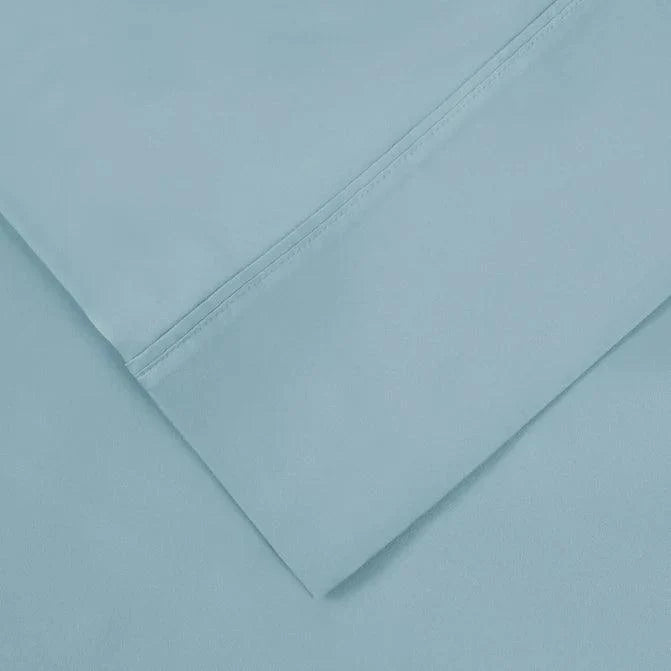 This bed linen set offers a minimalist and elegant aesthetic. It features solid, muted colors such as blue, gray, ivory, pink, and sage, with no patterns. The fabric has a smooth finish, and the precise stitching along seams and folded corners adds to its overall refined look. It’s a complete bedding ensemble that includes flat sheets, fitted sheets, and pillowcases.