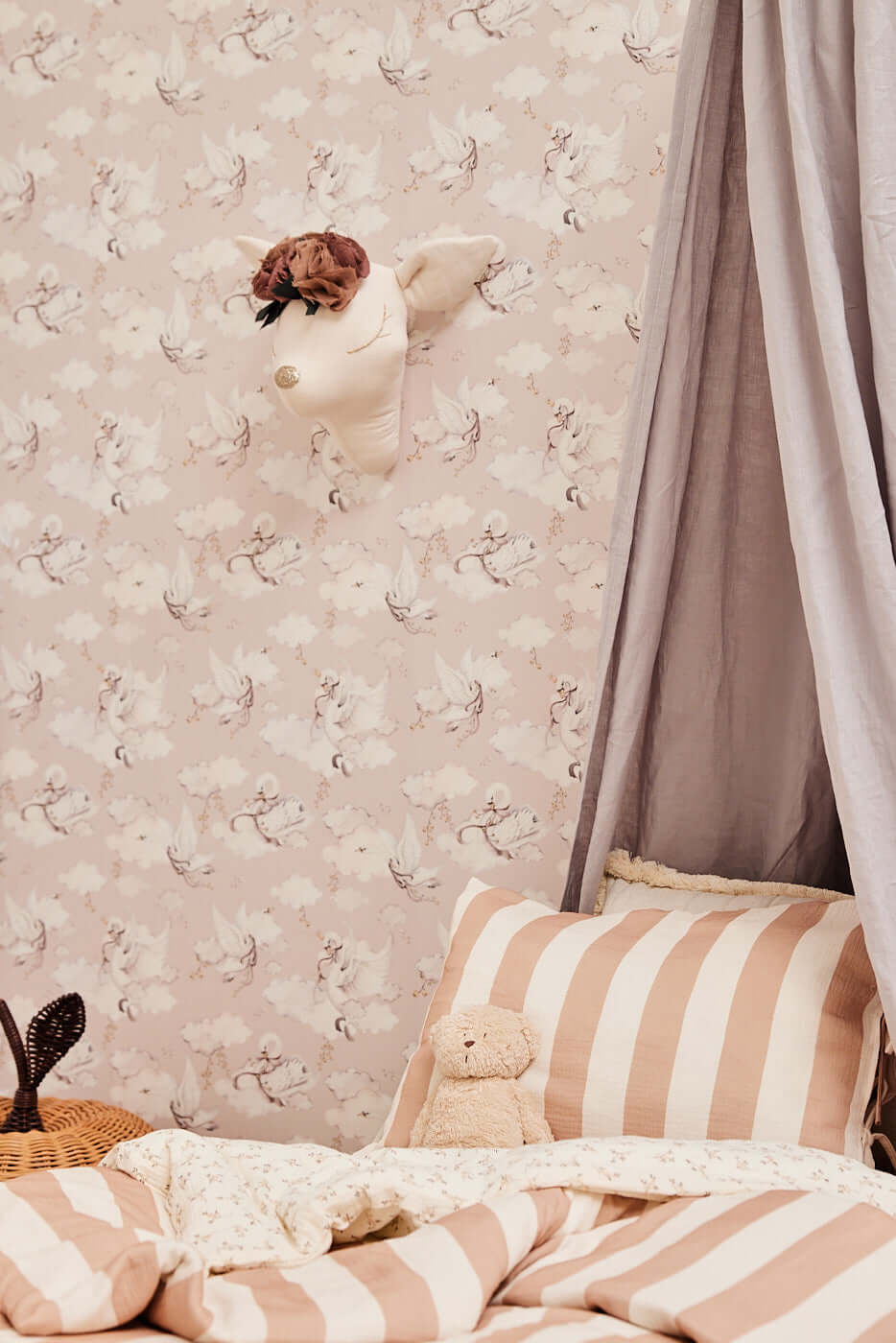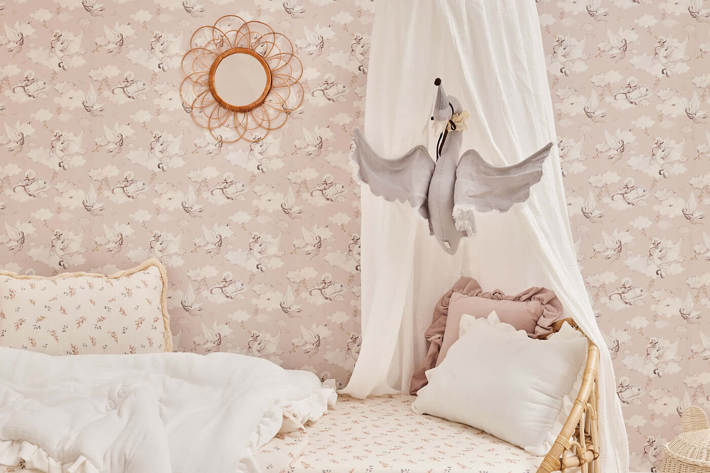 Β Dreamy swan wallpaper in soft beige tones Add a touch of magic and calm to your childβs room with the Magic Swan β beige wallpaper. Featuring hand-painted white swans gliding among delicate clouds and stars, this wallpaper brings softness, warmth and imagination to any nursery, bedroom, or cozy play space. The muted beige palette makes it versatile and timeless, blending beautifully with Scandinavian, Japandi, or classic interiors. Product Details Design: Hand-painted white swans and clouds Colors: Muted blue background with white, beige and soft grey details Material: Premium non-woven wallpaper (vlies) Finish: Matte, soft-touch surface Pattern repeat: every 50 cm Production: Printed to order β custom made just for you Sizes & Installation Each roll contains 2 strips: 2 Γ 50 cm wide Γ 270 cm high 2 Γ 50 cm wide Γ 310 cm high Coverage: 1 roll covers 1 meter of wall width. Β Installation: β’ Paste the wall (not the wallpaper) β’ Use non-woven wallpaper paste β’ Surface must be clean, smooth, and dry β’ Instructions: Download the step-by-step non-woven wallpaper guide How Many Rolls Do I Need? Each set includes 2 sheets (total 1 meter wide). Example: 2.3 m wide wall β Order 3 sets 4 m wide wall β Order 4 sets Tip: Add 5β10 cm extra to be safe β walls are rarely perfectly straight! Production & Shipping Production time: 1β3 business days Shipping time: 2β7 business days (UE) Check β Double Check Please carefully inspect your wallpaper before installation. Verify colours, pattern alignment, and length immediately upon delivery. We allow a cutting tolerance of up to 1 mm per strip. If the deviation is larger, we will gladly reprint your order. *Once the wallpaper has been cut and installed, it is no longer possible to objectively determine whether any irregularity originates from production or from handling during installation. For this reason, claims raised after installation are very difficult to assess. Important Notes This wallpaper is not kept in stock β itβs printed to order. Not sure about the colour or pattern scale?We recommend ordering a sample first.