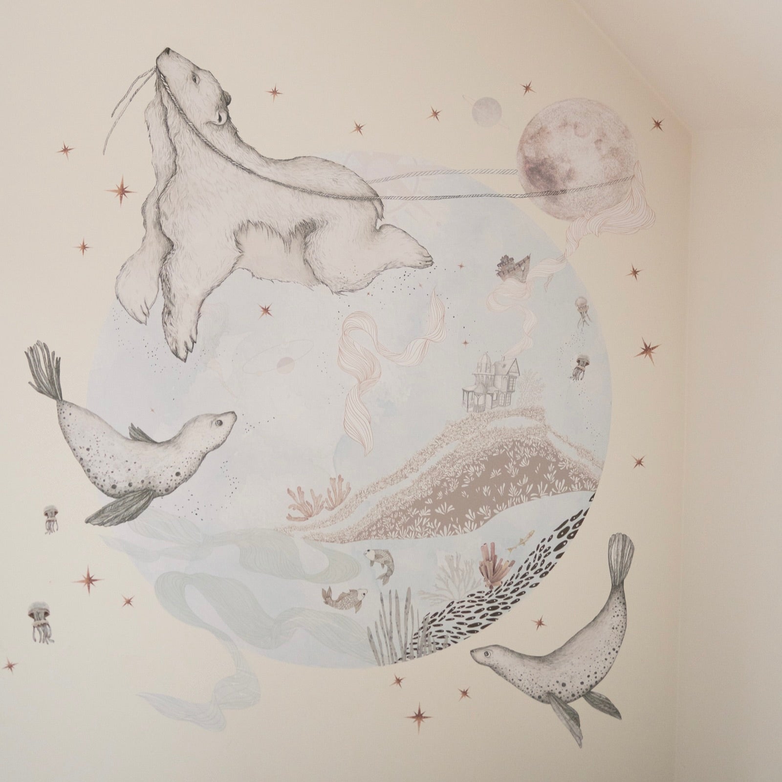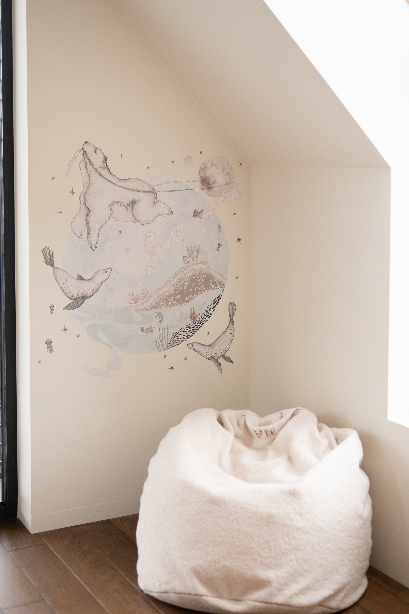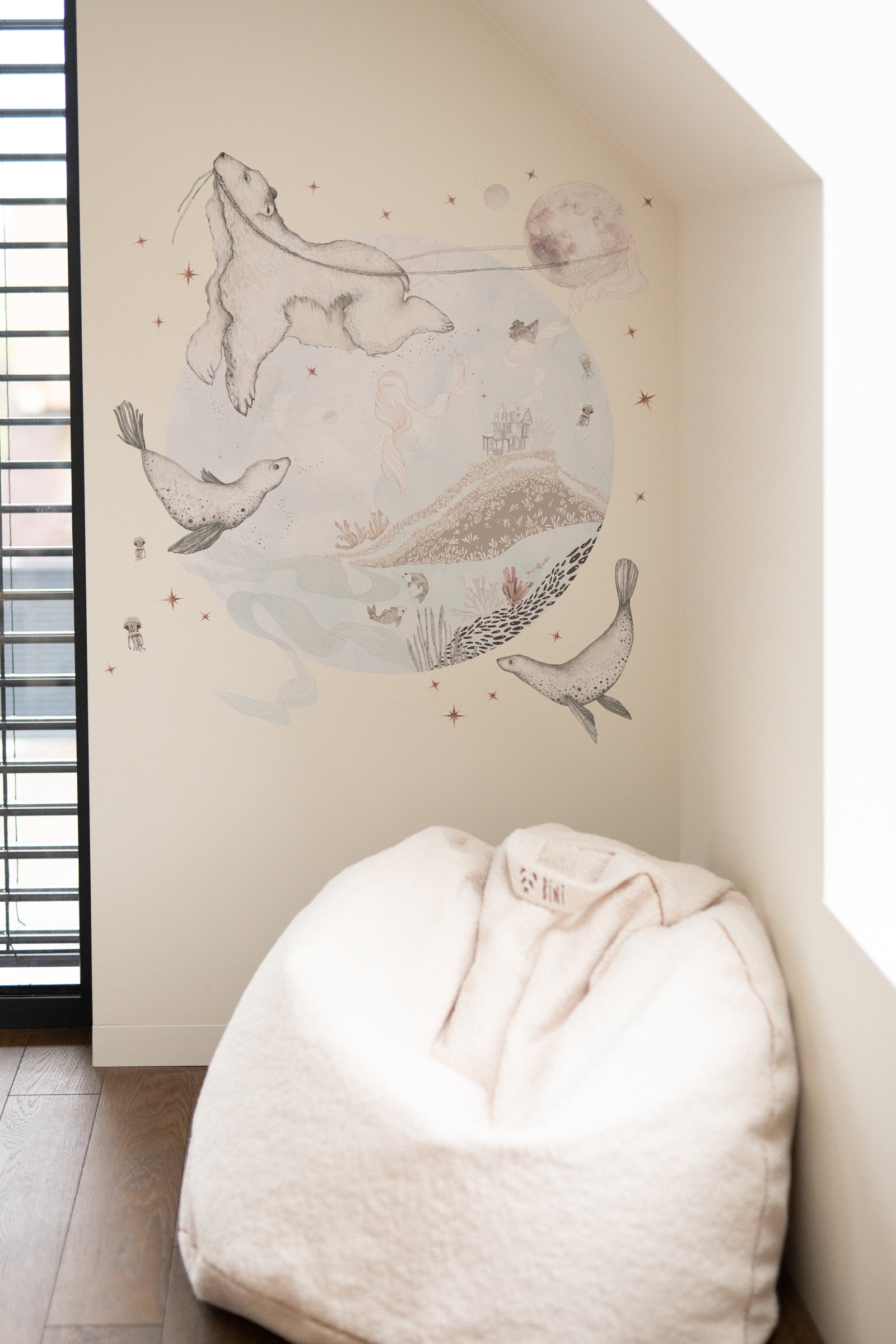 Bring calm and imagination into your childโs room with the Magical Bear World wall sticker โ Blue edition. This round decal features a gentle polar bear, curious seals and underwater plants โ all set on a soft light blue background. Itโs perfect for creating a peaceful, sea-inspired space. The sticker is made of high-quality matte vinyl, easy to apply and remove without damage. A lovely way to add storybook charm to any nursery. Material Matte, self-adhesive PVC (95 ฮผm) Washable and fade-resistant EN 13501-1 B-s2-d0 fire safety certified Safe for childrenโs spaces Available sizes Round ร 100 cm Round ร 130 cm Application Peel & stick โ no tools or glue needed For smooth, clean walls or furniture Full instructions: Processing time 5โ10 business days * Please note: Our wall stickers are printed to order and are therefore non-returnable, unless there is a defect or a mistake in printing. If you experience any issue with your order, please contact us and we will be happy to help. Perfect for: Underwater-themed nurseries Baby rooms in soft, muted colors Calming, serene interior designs Gender-neutral ocean-inspired spaces Scandinavian or minimalist kidsโ rooms