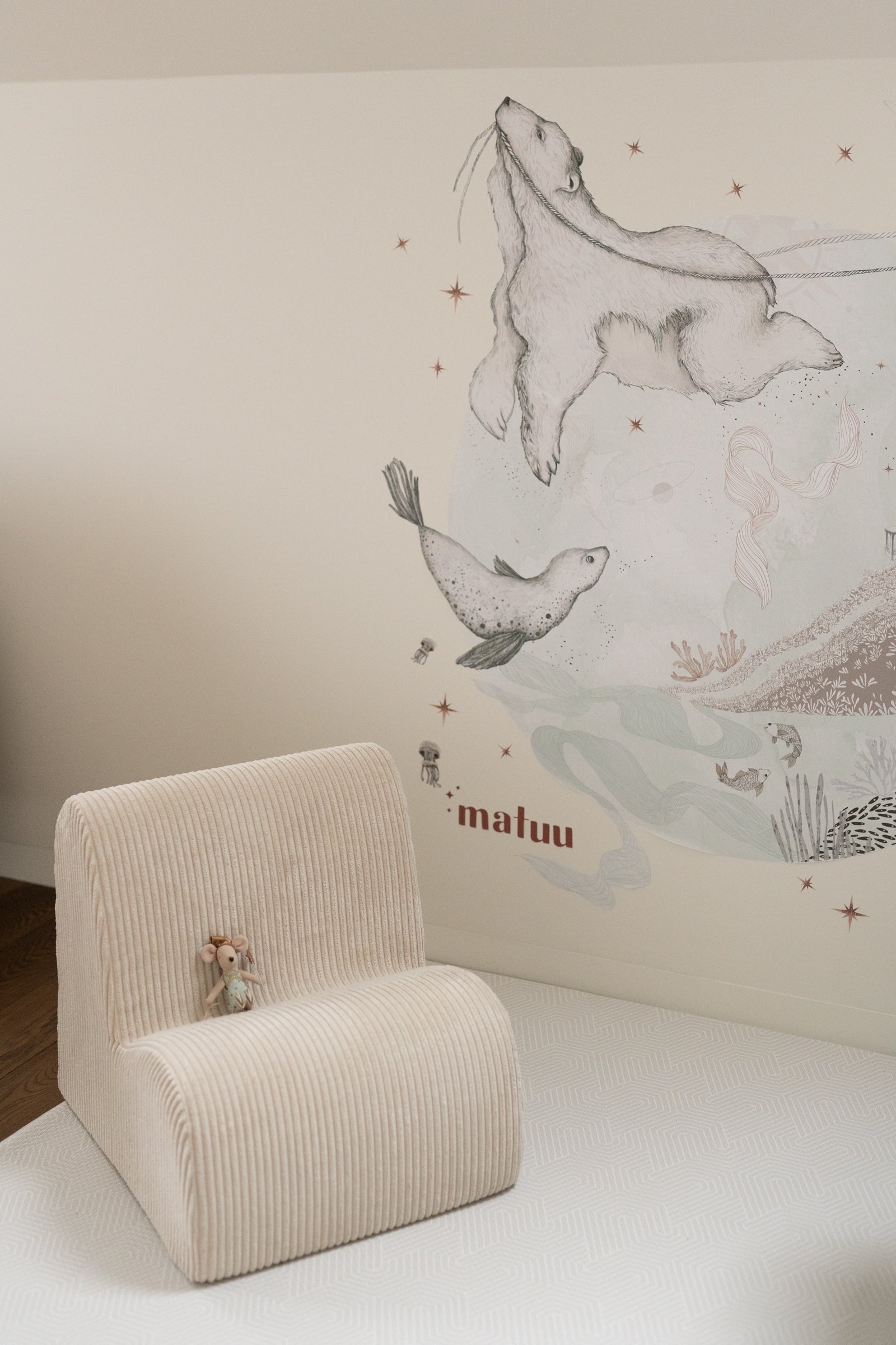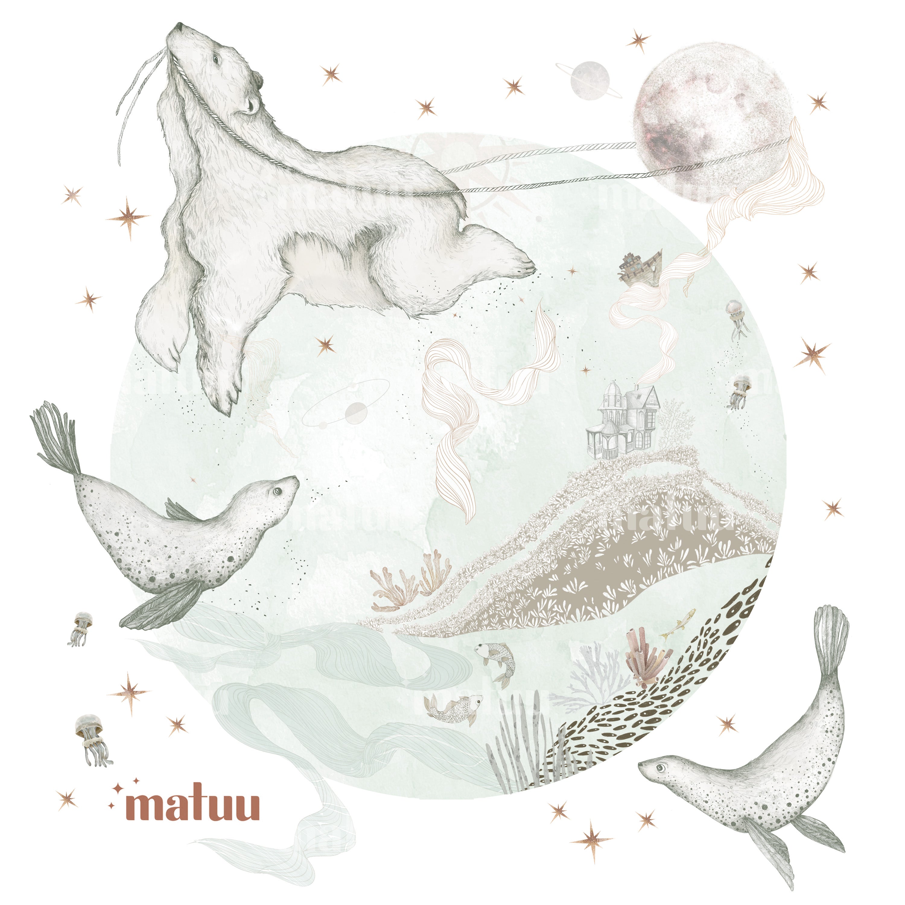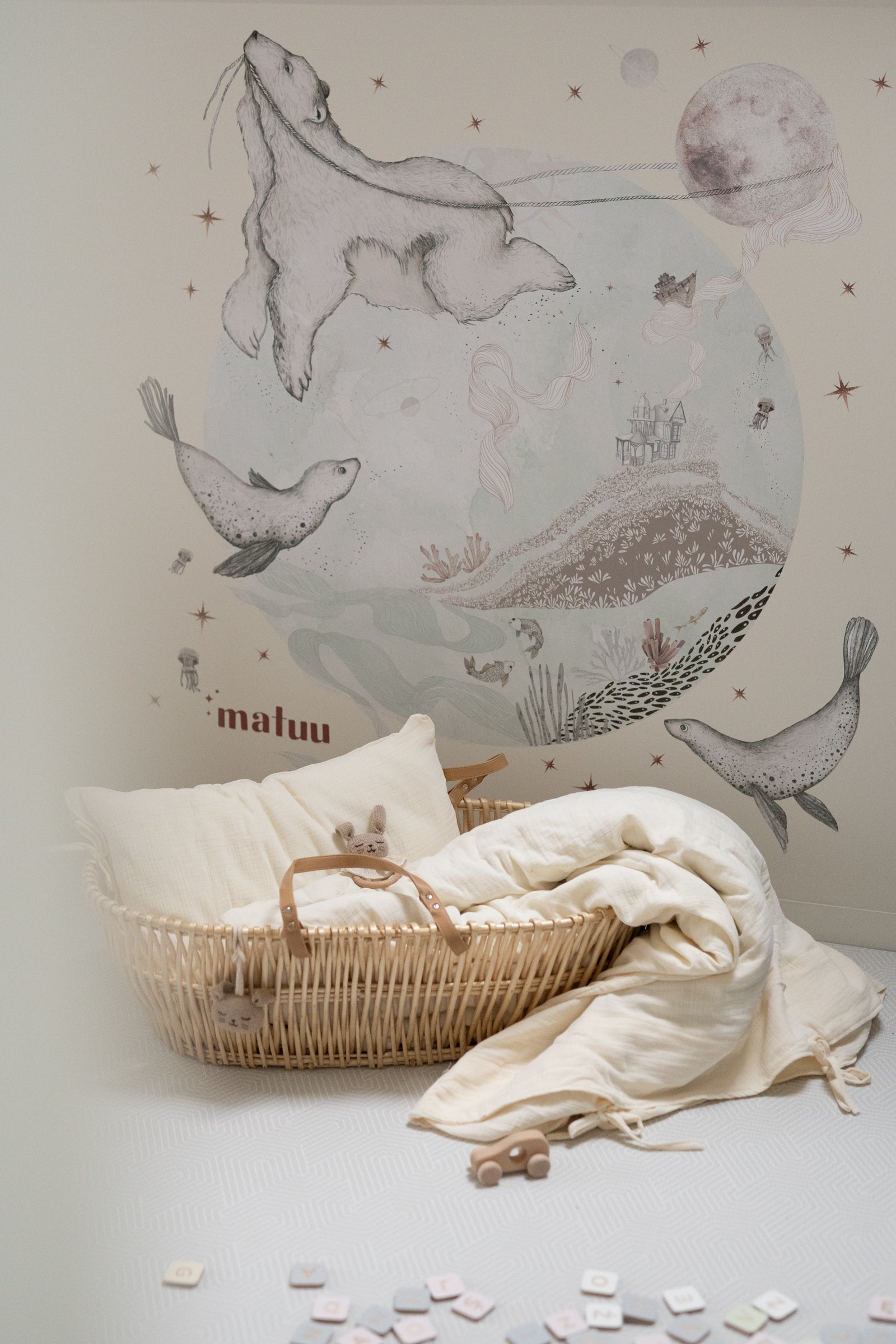Create a peaceful underwater scene in your child’s room with the Magical Bear World wall sticker – Light Green edition. This charming round decal features a polar bear, playful seals and dreamy sea plants – all set against a soft, light green background. A perfect choice for ocean-themed or calming, gender-neutral nurseries. Made from high-quality, matte vinyl, this sticker is easy to apply and remove, washable, and safe for little ones. Material Matte, self-adhesive PVC (95 μm) Washable and fade-resistant EN 13501-1 B-s2-d0 fire safety certified Safe for children’s spaces Available sizes Round Ø 100 cm Round Ø 130 cm Application Peel & stick – no tools or glue needed For smooth, clean walls or furniture Full instructions: Processing time 5–10 business days * Please note: Our wall stickers are printed to order and are therefore non-returnable, unless there is a defect or a mistake in printing. If you experience any issue with your order, please contact us and we will be happy to help. Perfect for: Underwater-themed nurseries Baby rooms in soft, muted colors Calming, serene interior designs Gender-neutral ocean-inspired spaces Scandinavian or minimalist kids’ rooms