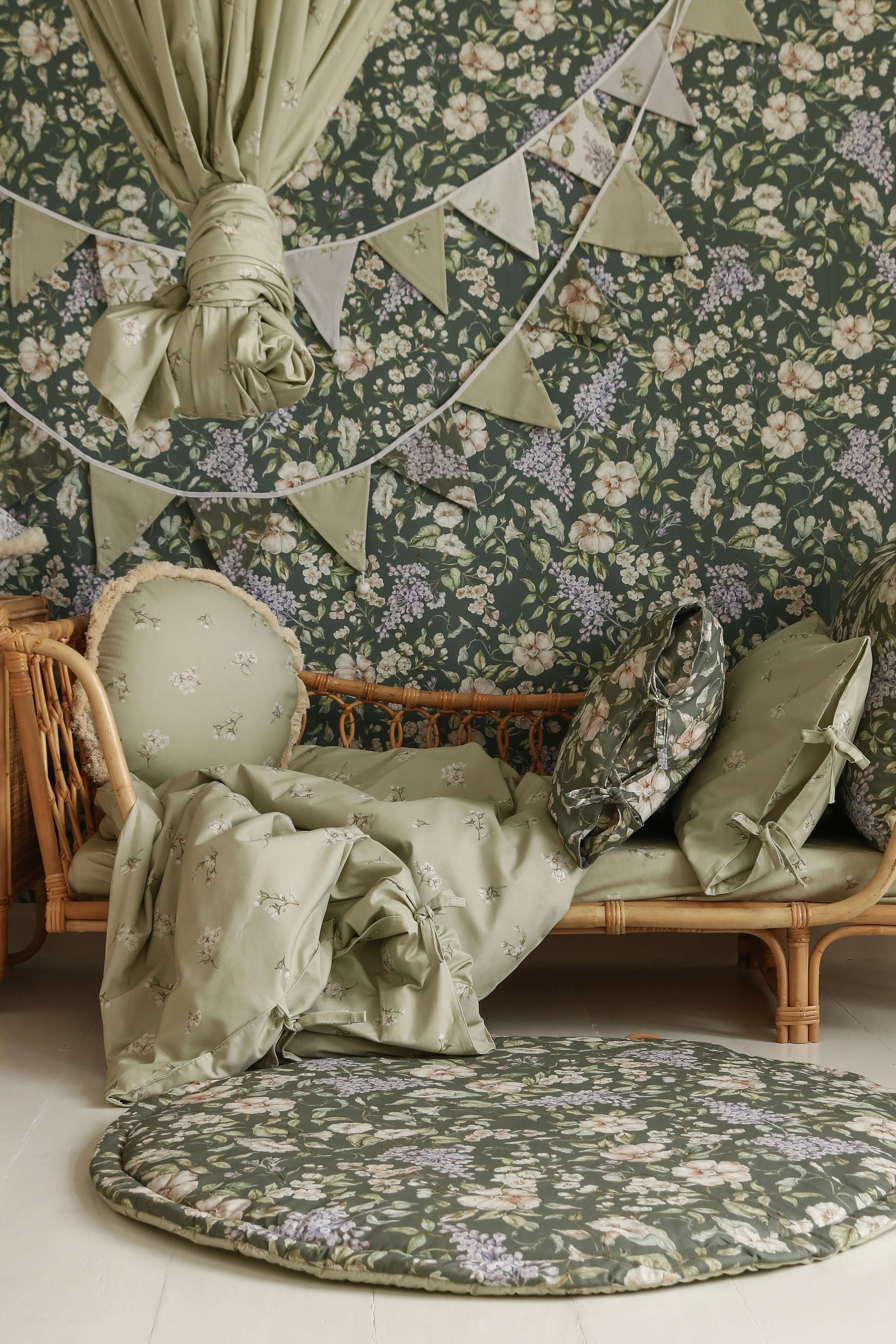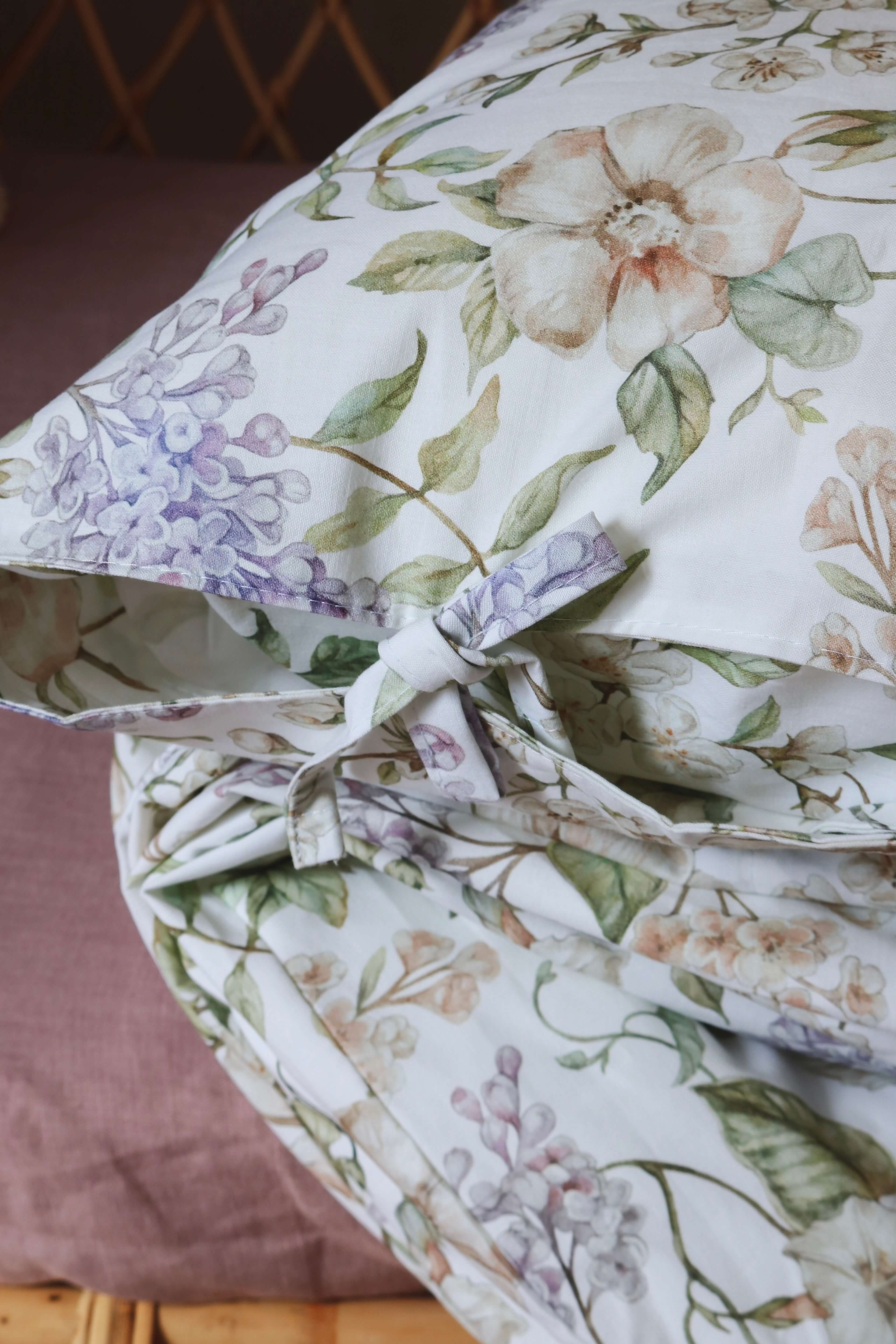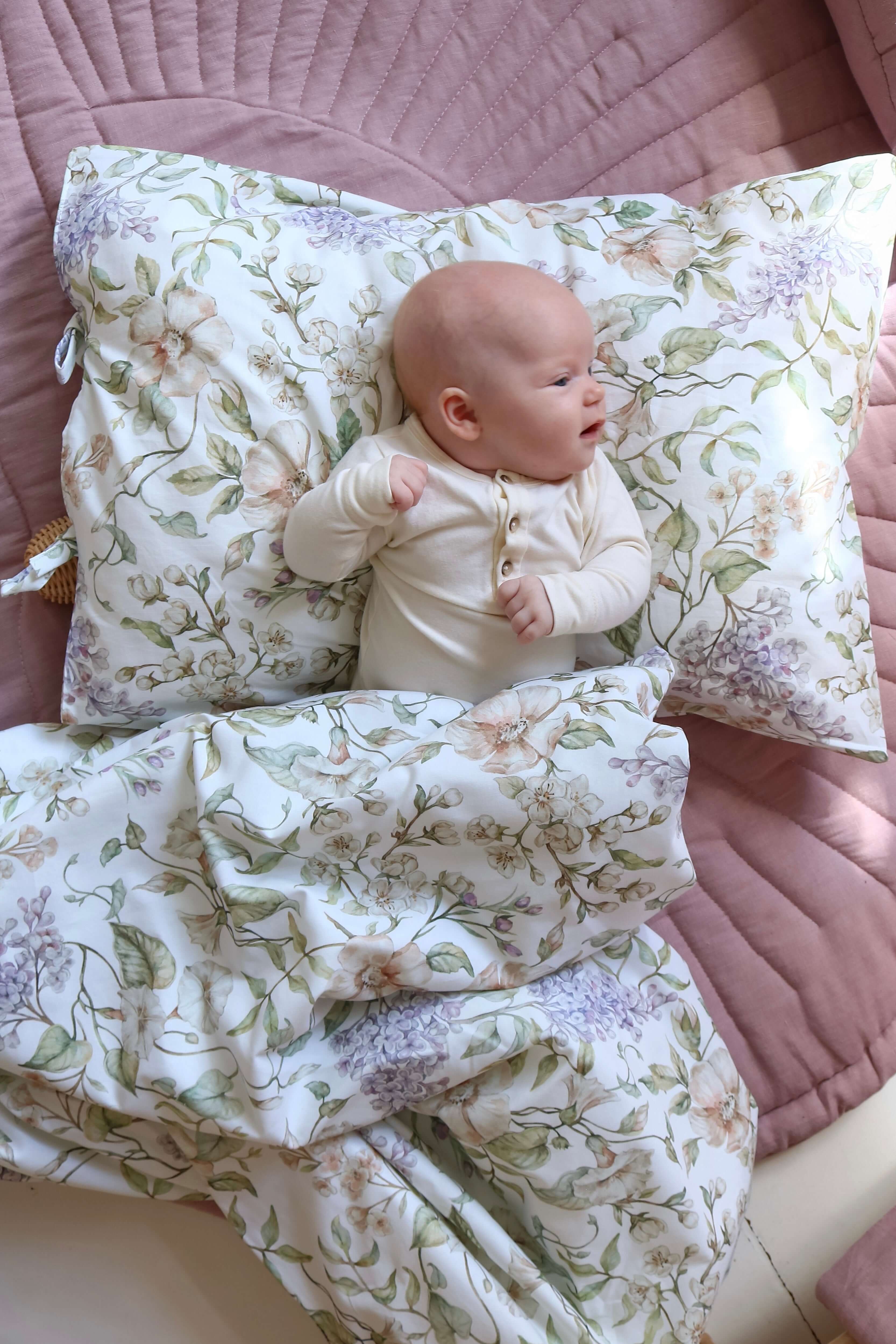 Bring the charm of a blooming spring garden into your home with the May Garden on White bedding set. Crafted from soft, breathable enzyme-washed cotton, this set combines natural comfort with an elegant floral design. Enzyme-washed cotton is specially softened, making the fabric extra gentle against the skin while remaining durable and easy to care for. The delicate print features hand-painted flowers in pastel shades of lilac, blush, and green on a fresh white background. Timeless and versatile, it adds a romantic, nature-inspired touch to boho, vintage, or Scandinavian-style nurseries and bedrooms. Lightweight, safe for sensitive skin, and OEKO-TEXยฎ certified, this bedding is designed for everyday comfort. Each set includes a duvet cover and pillowcase, finished with cotton ties instead of zippers or buttons for a handcrafted look. Carefully handmade in the Netherlands, itโs the perfect mix of artisanal quality and cozy design. Product Details Material: 100% enzyme-washed cotton โ OEKO-TEXยฎ certified Design: White background with lilac, blush, and green floral pattern Closure: Cotton ties (no zippers or buttons) Set includes: 1 duvet cover + 1 pillowcase (all sizes) Sizes: Crib, toddler, junior, and single bed Care: Machine wash at 40 ยฐC, gentle cycle; do not tumble dry; iron on low if needed Production time: 2โ3 business days Handmade in the Netherlands by Matuu Perfect For Romantic, floral, or boho-style nurseries Parents who love pastel and nature-inspired prints Cozy toddler and kidsโ bedrooms Neutral or vintage interiors with a soft accent A thoughtful baby shower, birthday, or holiday gift