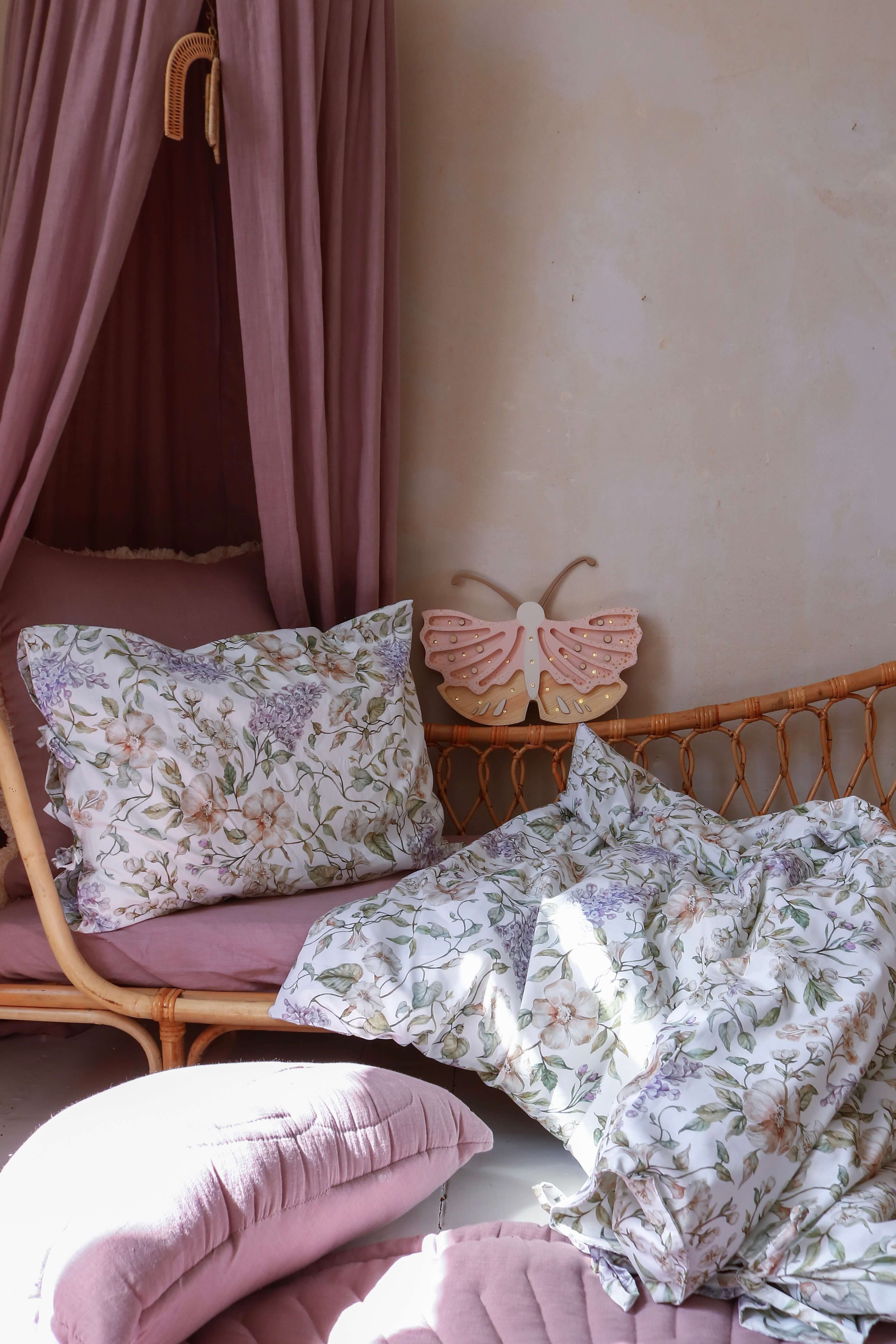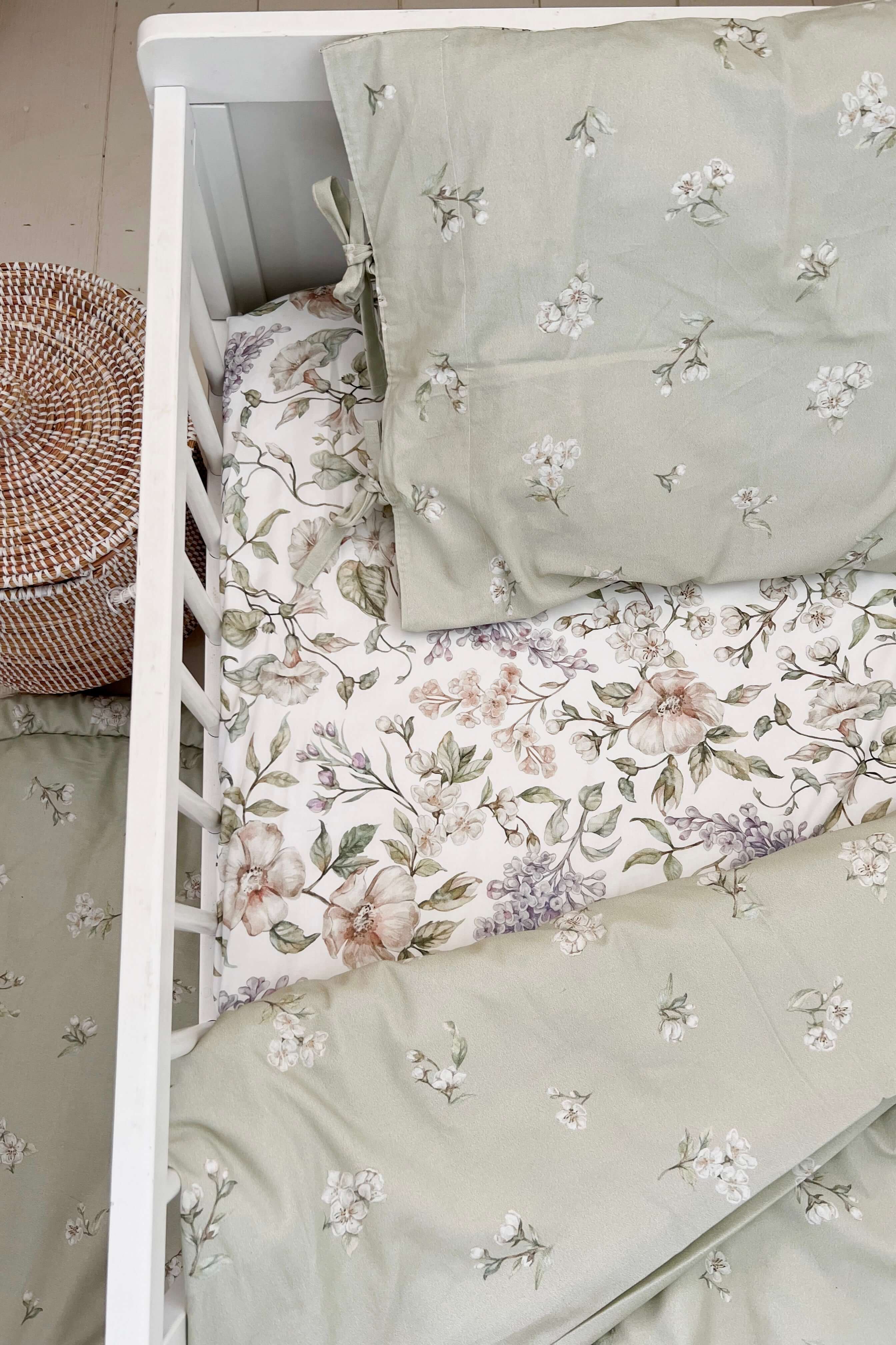 Add a touch of spring freshness to your nursery with our May Garden on White fitted sheet. Made from soft, enzyme-washed cotton, it features a delicate pattern of tiny wildflowers and leaves in warm, natural tones on a crisp white background β cheerful, light, and timeless. Perfect for creating a calm and nature-inspired baby room. The elasticated edges ensure a snug fit and keep the sheet securely in place, offering your little one a soft and breathable surface for sleeping and playing. Available in multiple sizes to fit cribs, toddler beds, or changing baskets. Β Β Product details: Β β’ Fabric: 100% enzyme-washed cotton β soft and breathable β’ Pattern: Tiny flowers and leaves in warm tones on white background β’ Sizes: Available from crib to single bed β’ Fit: Elasticated edges for a secure fit β’ Care: Machine wash at 40Β°C β’ Preparation time: 2β3 business days β’ Handmade with care in the Netherlands by Matuu Β Β Perfect for: Β β’ Crib or toddler bed β ideal for babies and young children β’ Light, floral, and nature-inspired nursery styling β’ Matching with Matuu bedding, canopies, pillows, and dΓ©cor β’ A thoughtful handmade gift for new parents or baby showers