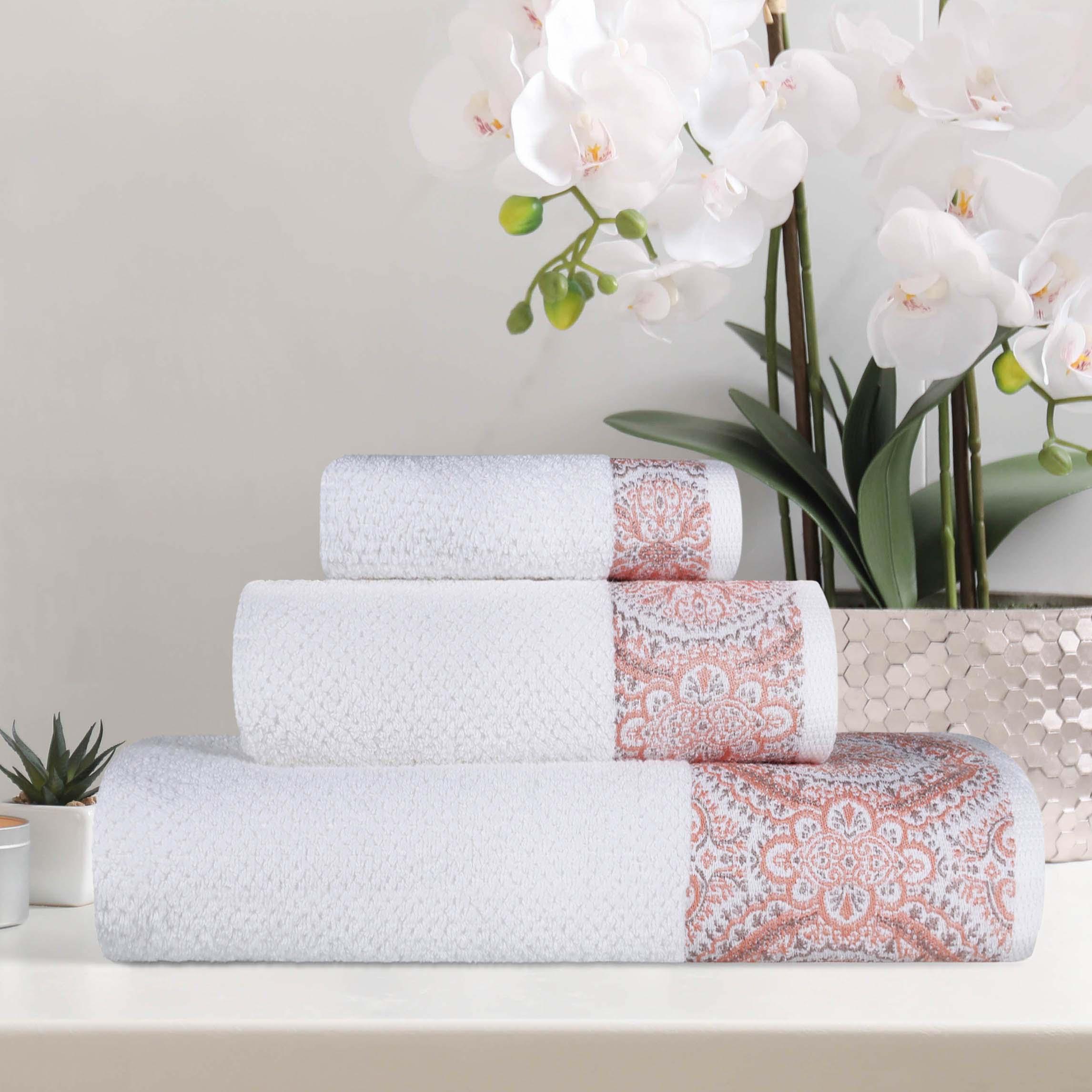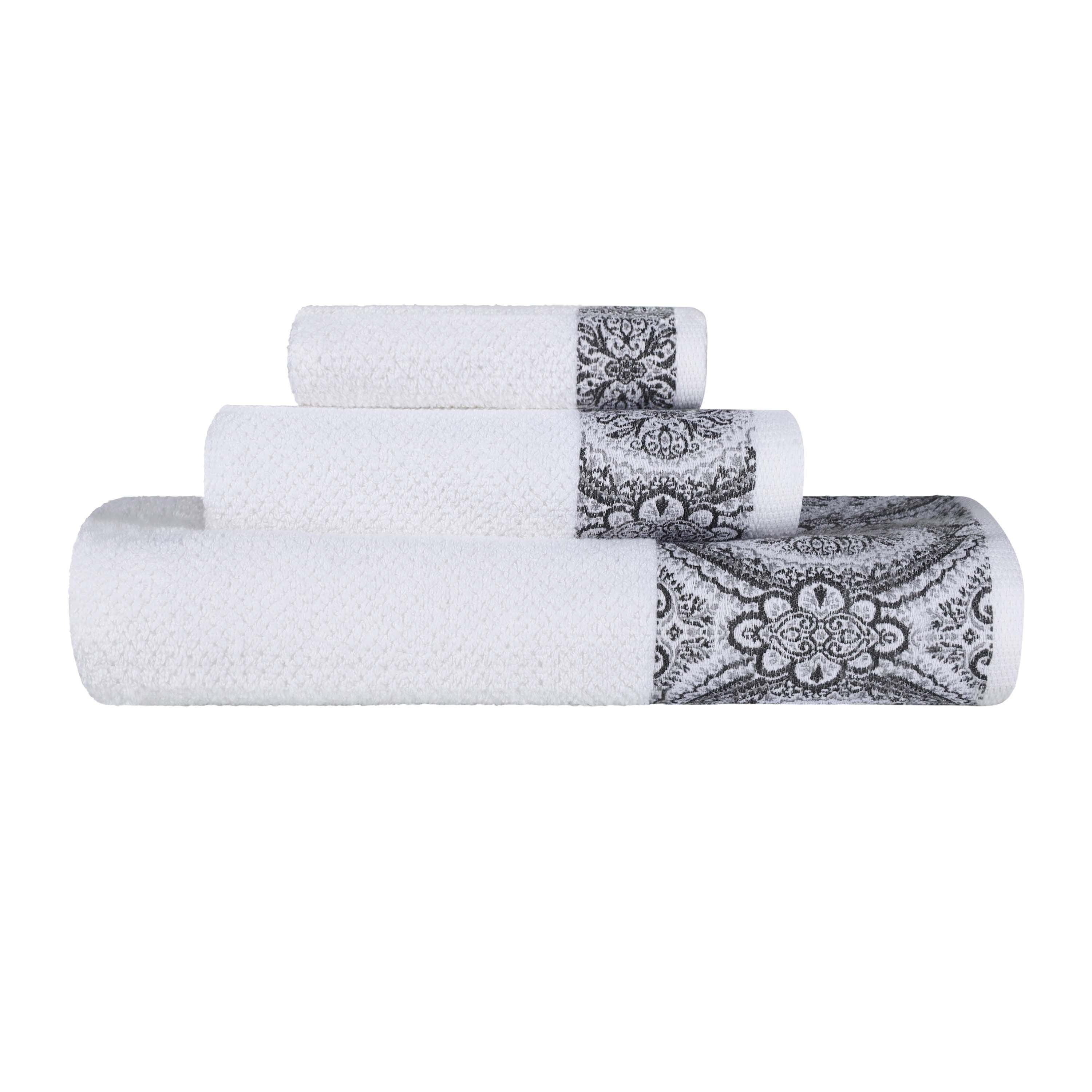 This towel set is a collection of three towels in different sizes – small, medium, and large. They are made of 100% cotton, presenting a plush and absorbent texture. The white base color is adorned with an intricate medallion – like pattern in an Emberglow or Stone color, adding a decorative touch for the bathroom.