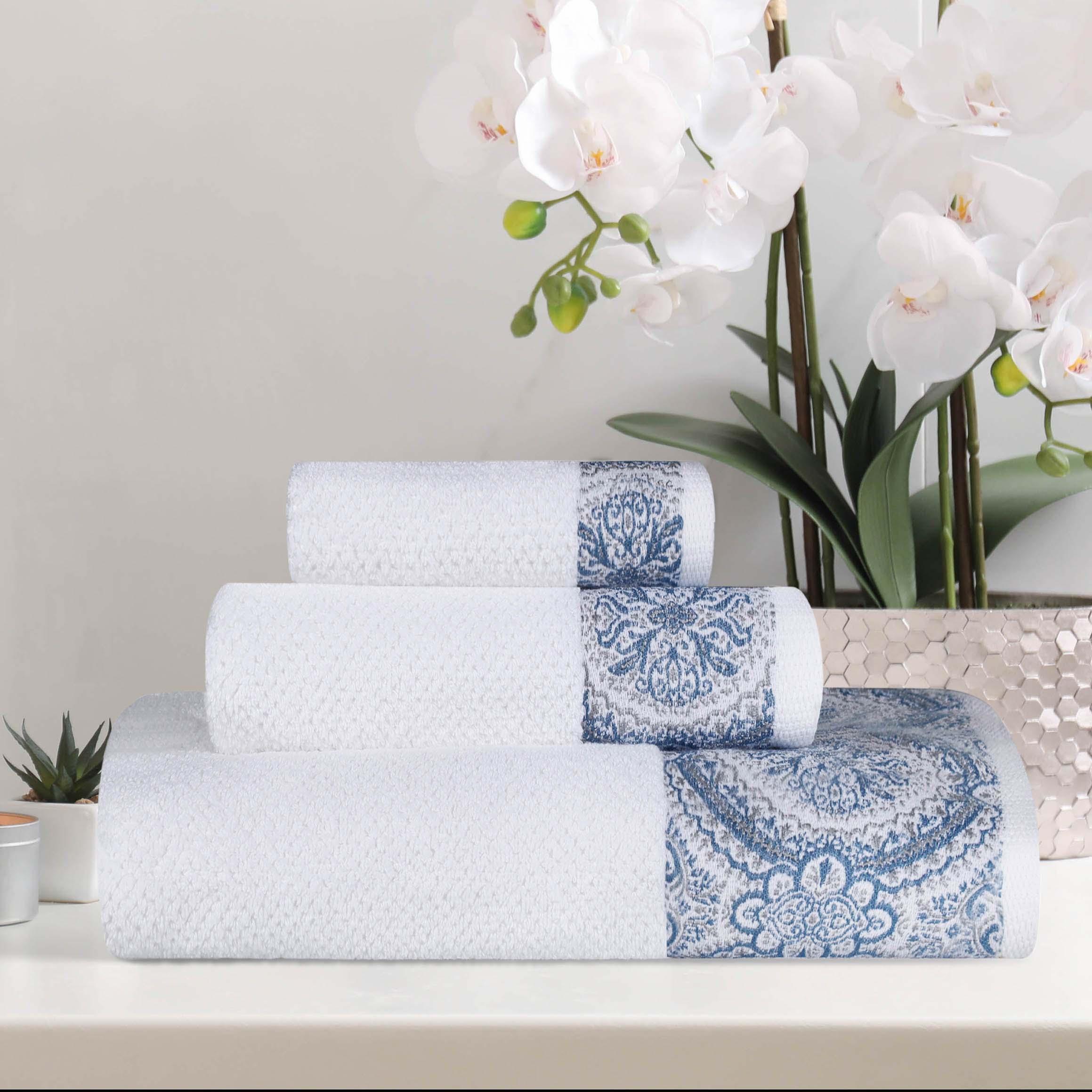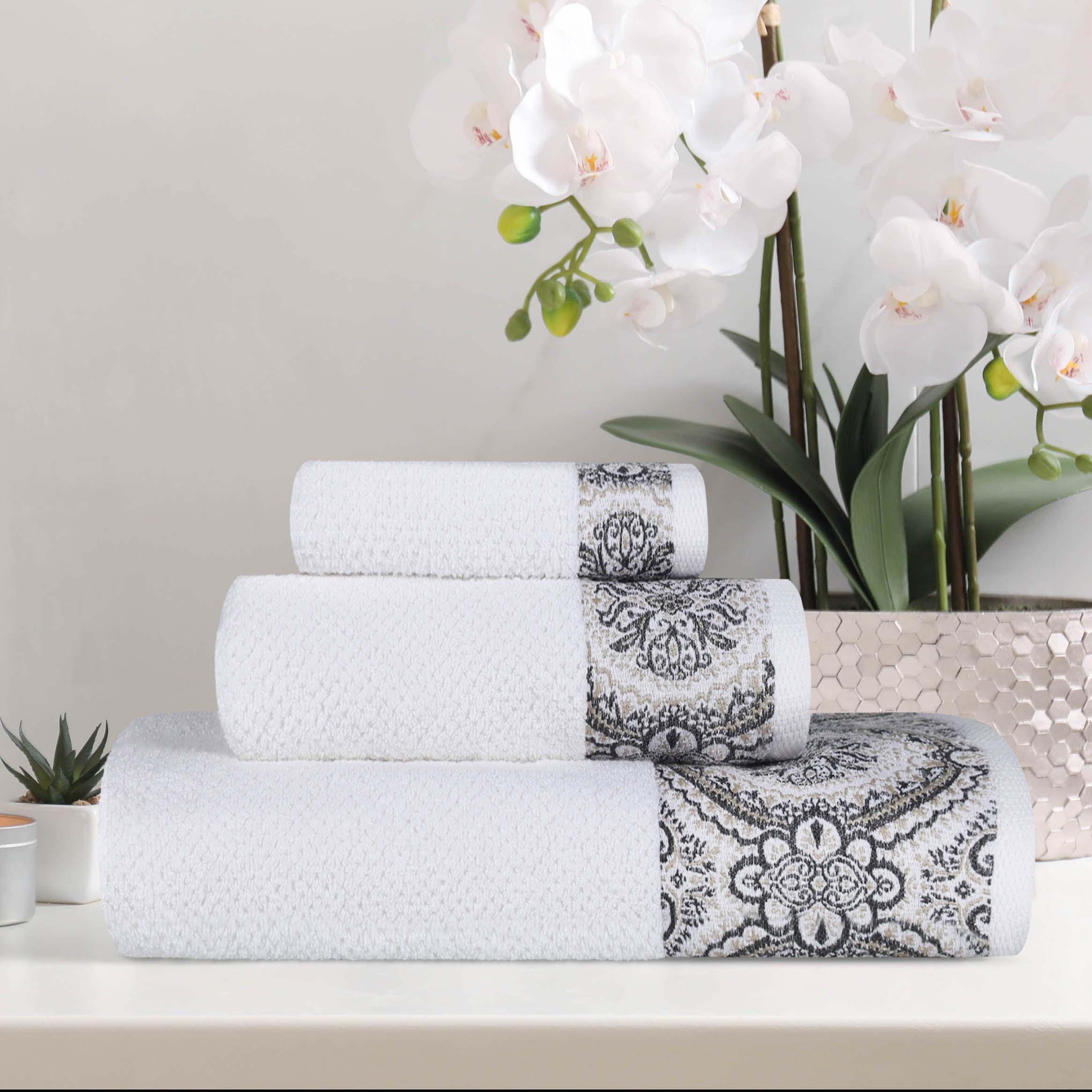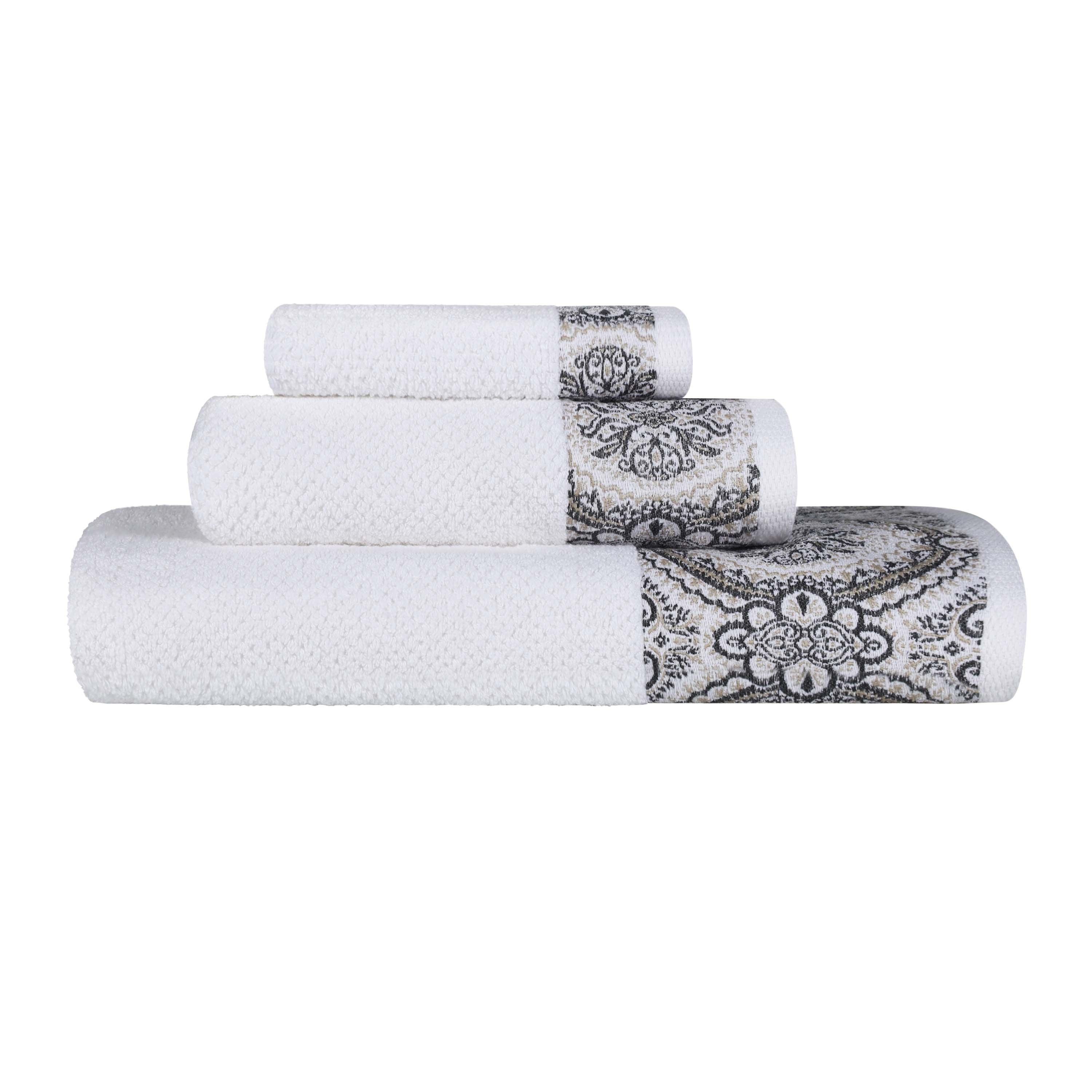 - A uniform, intricate medallion pattern on a band across all towel sizes for a cohesive look.