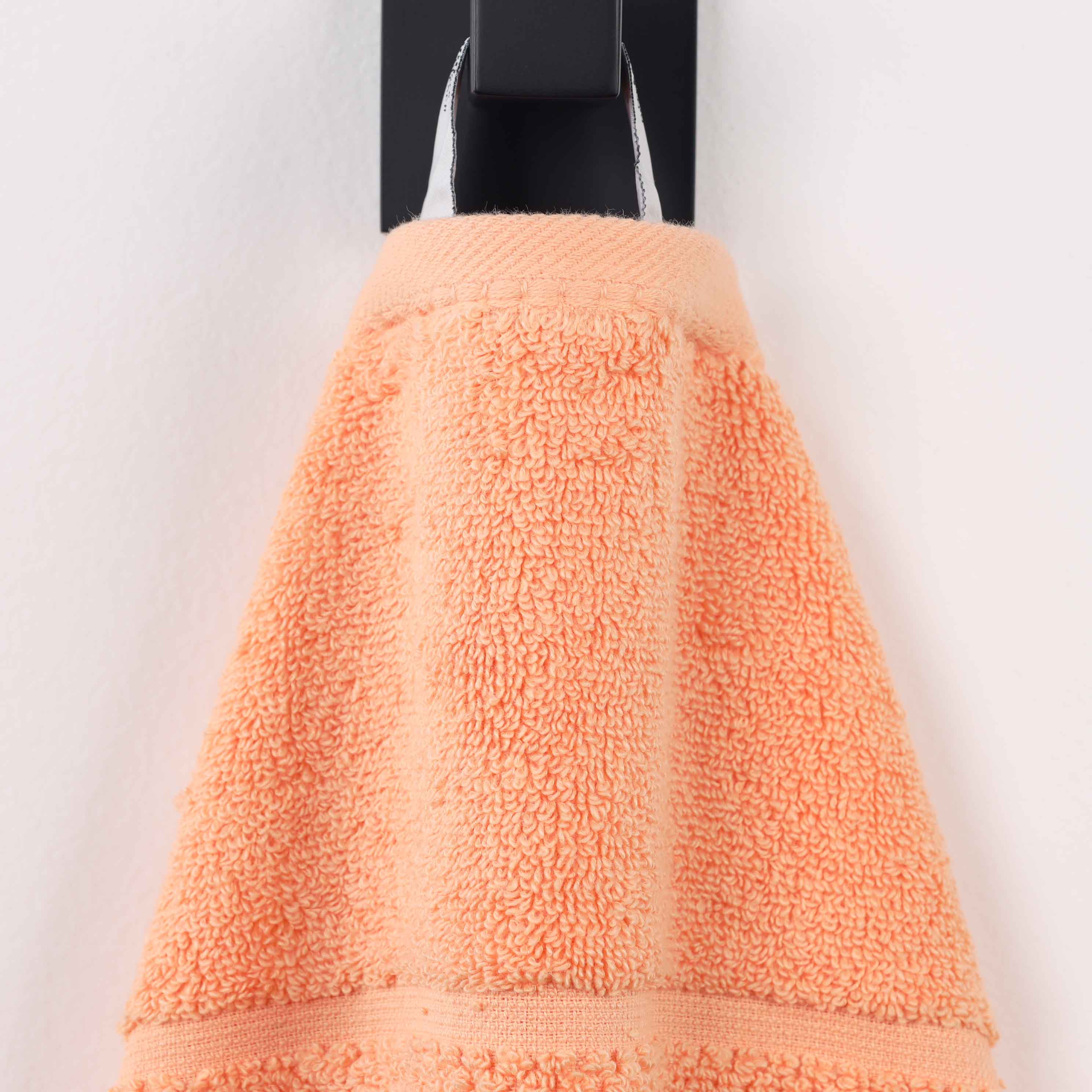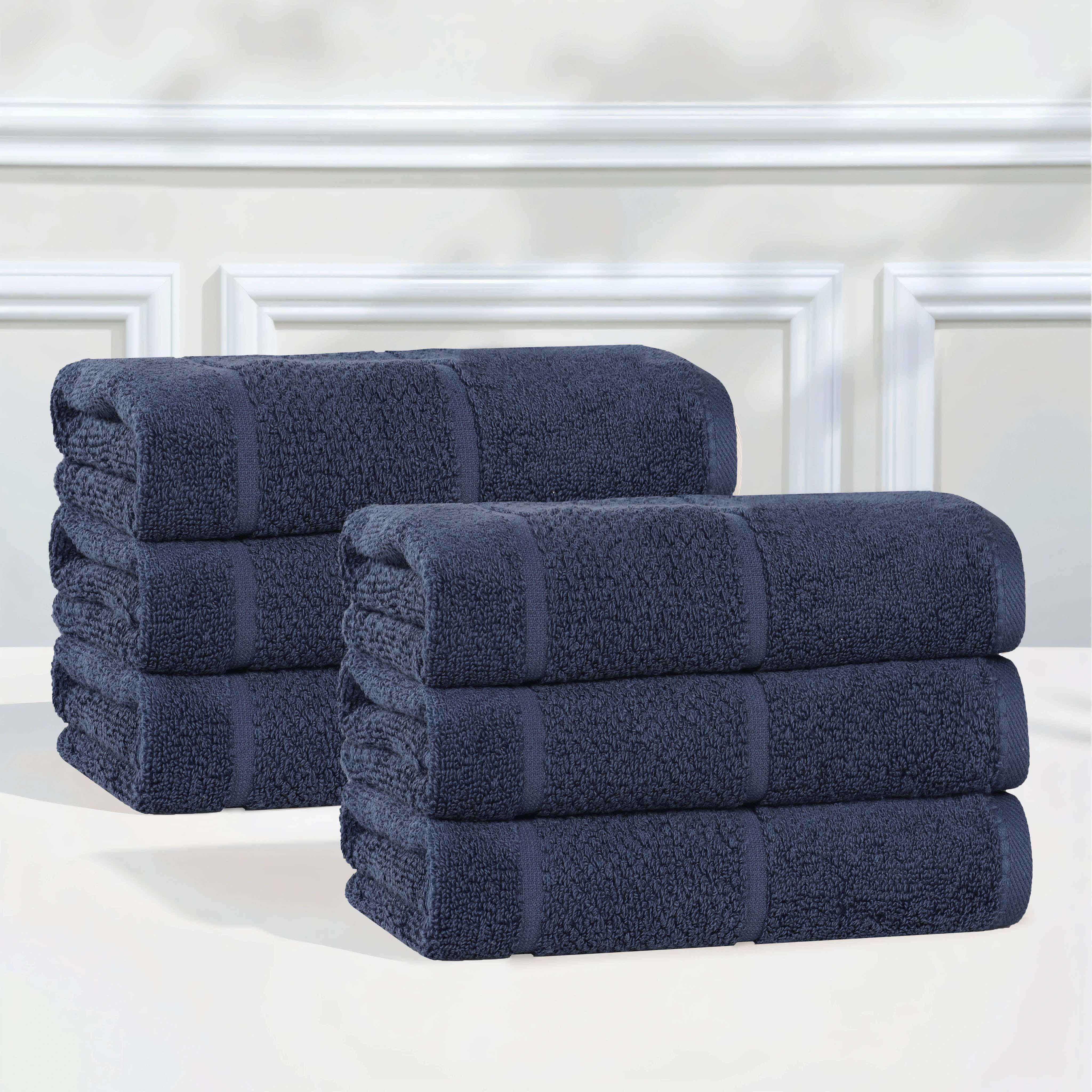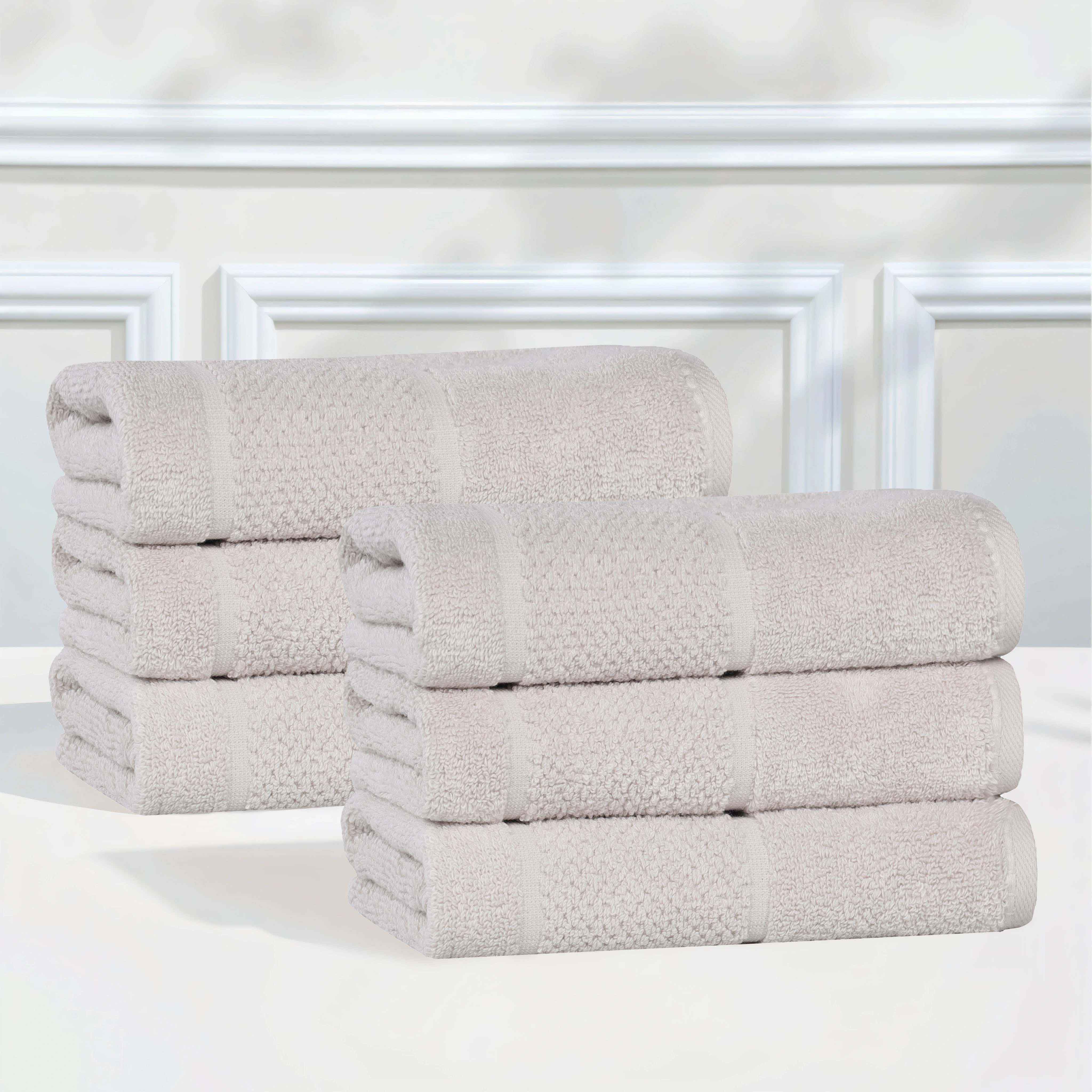 This is a set of 6 hand towels crafted from an 80% cotton and 20% viscose blend. They come in a variety of colors like ivory, navy blue, peach, silver, and white. The towels feature elegant border designs, some with smooth edges and others with textured patterns, adding a touch of sophistication.
