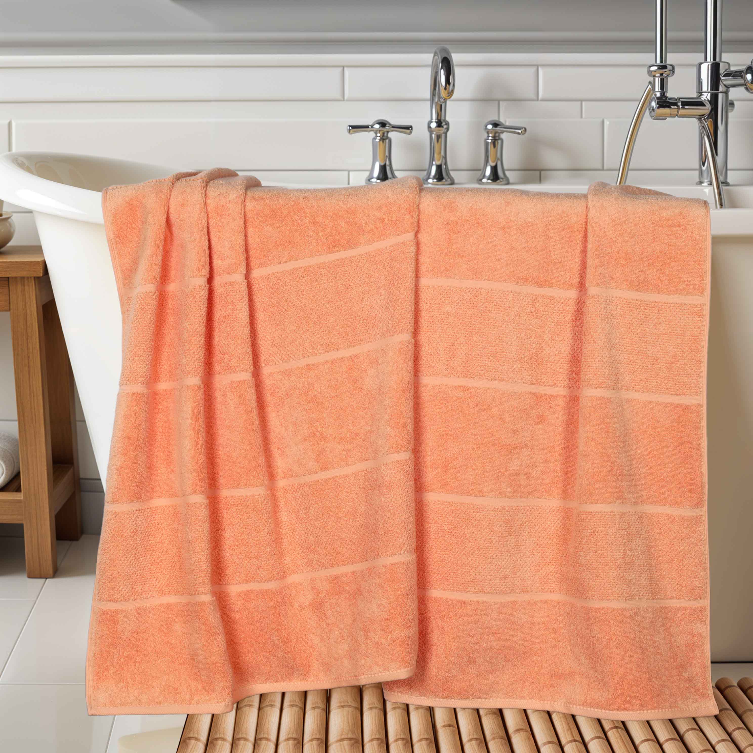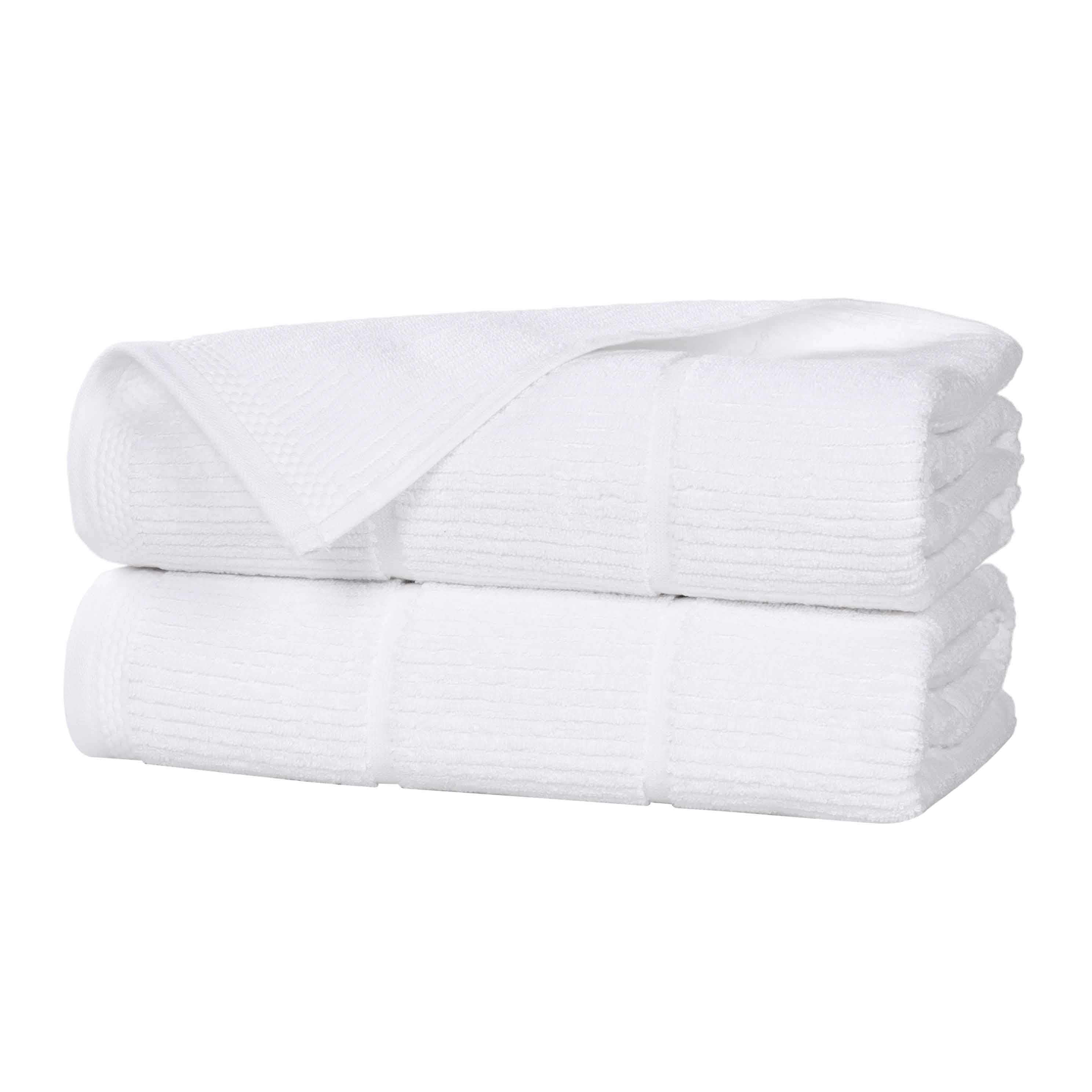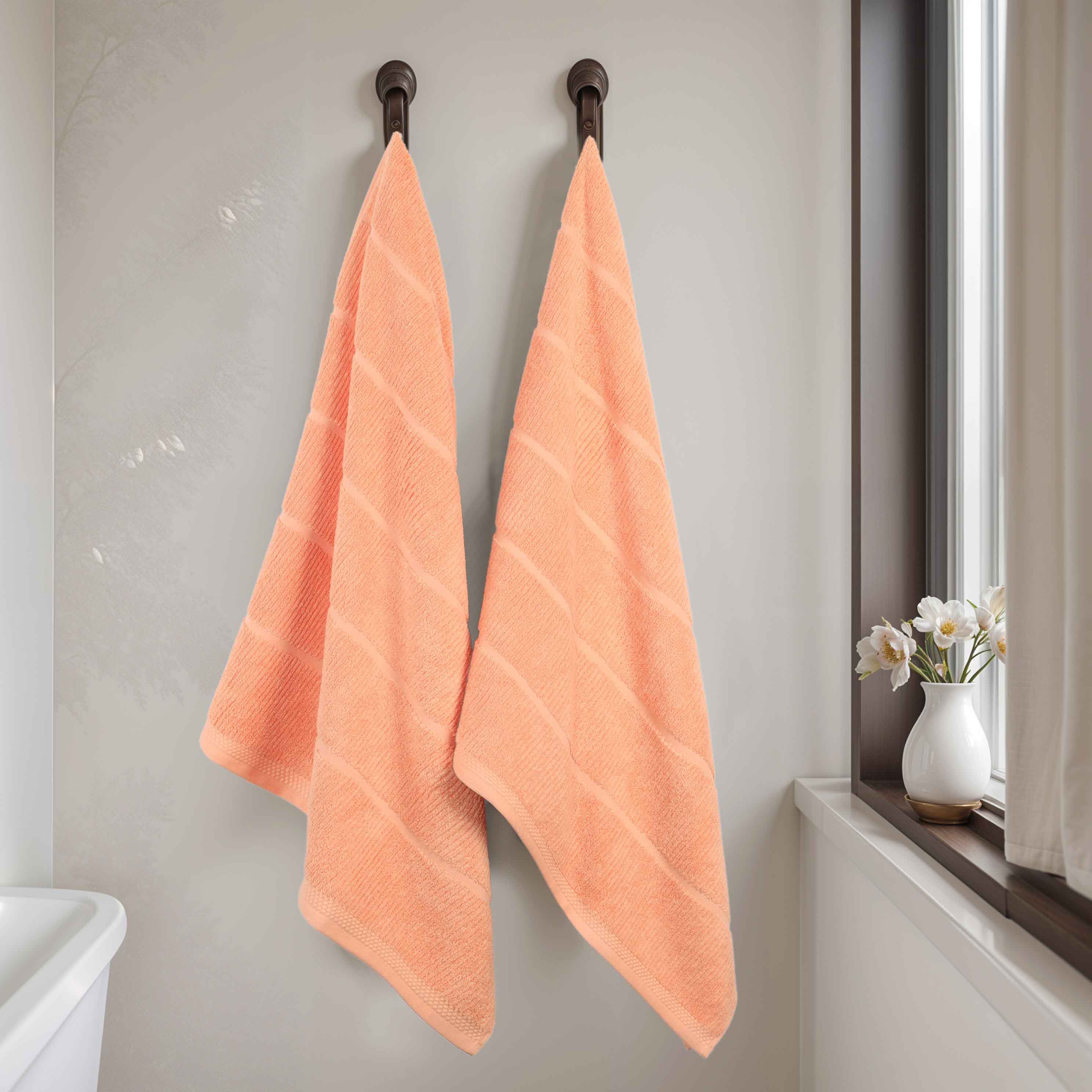 This product is a set of two bath towels crafted from a viscose and cotton blend. The towels feature a terry – cloth style with a soft, plush texture. They come in a range of solid colors and have simple, subtle striped patterns, offering a clean and refined look.