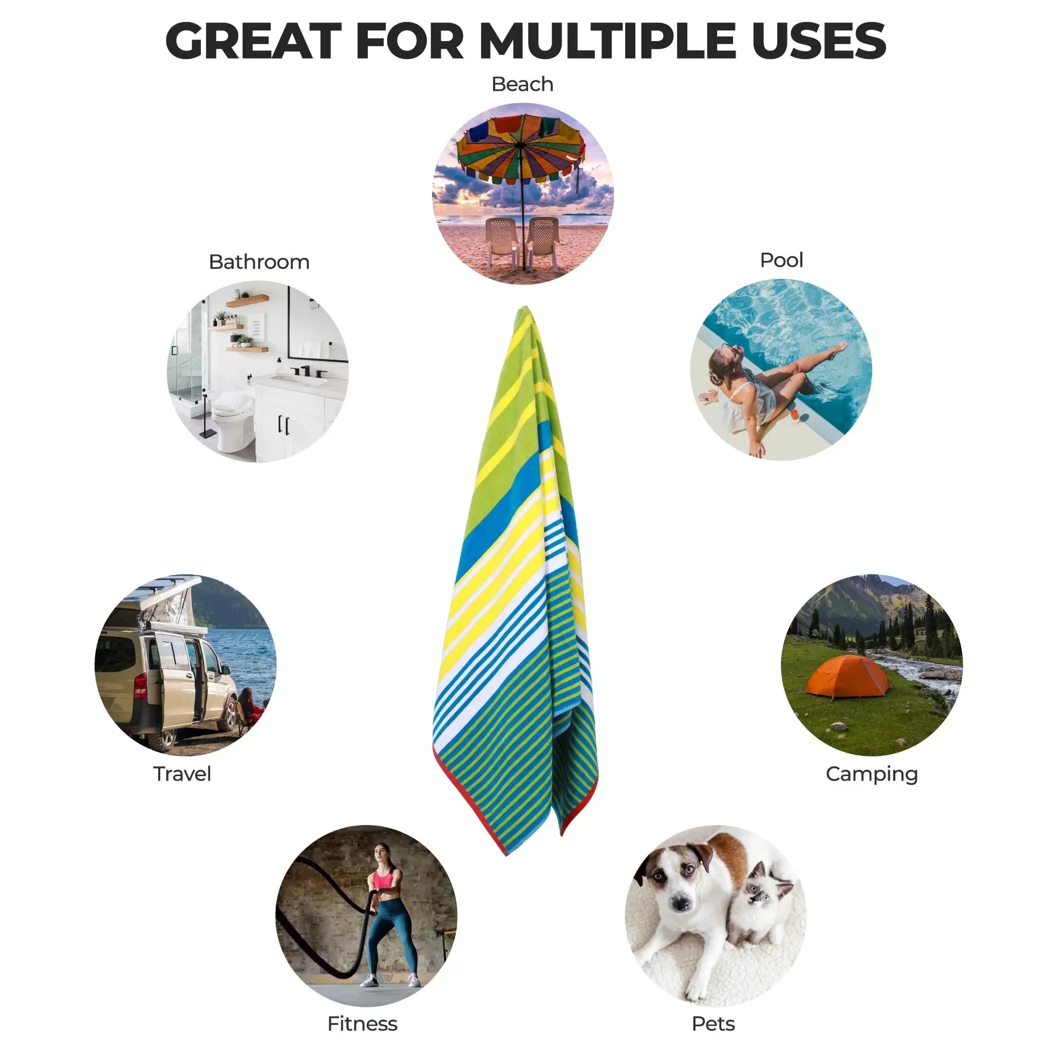 Drying off after swimming at the beach or pool, taking a shower, or as a picnic blanket. It can also serve as a decorative towel.