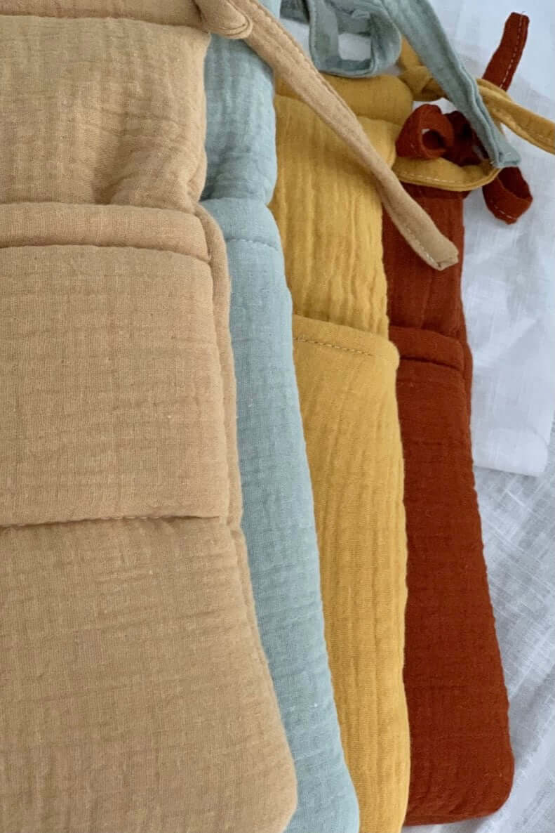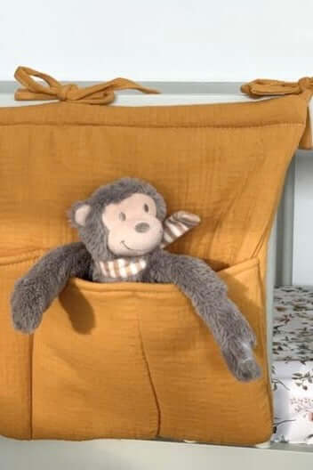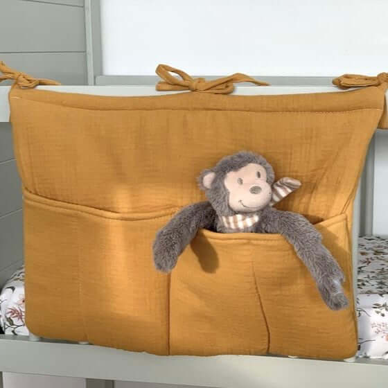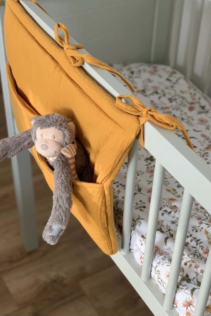 Stay organized in style with this beautiful Mustard crib organizer. Made from soft cotton muslin in a rich yellow shade, it features two spacious pockets – ideal for storing pacifiers, toys, or baby brushes. Attaches easily to any crib or playpen with fabric ties. Product features Dimensions: 50 x 25 cm Fabric: 100% cotton muslin – soft, breathable, OEKO-TEX certified Color: Mustard yellow Washing: Machine washable at 40°C Preparation time: 2–3 business days Handmade with care in the Netherlands by Roksana (Matuu)