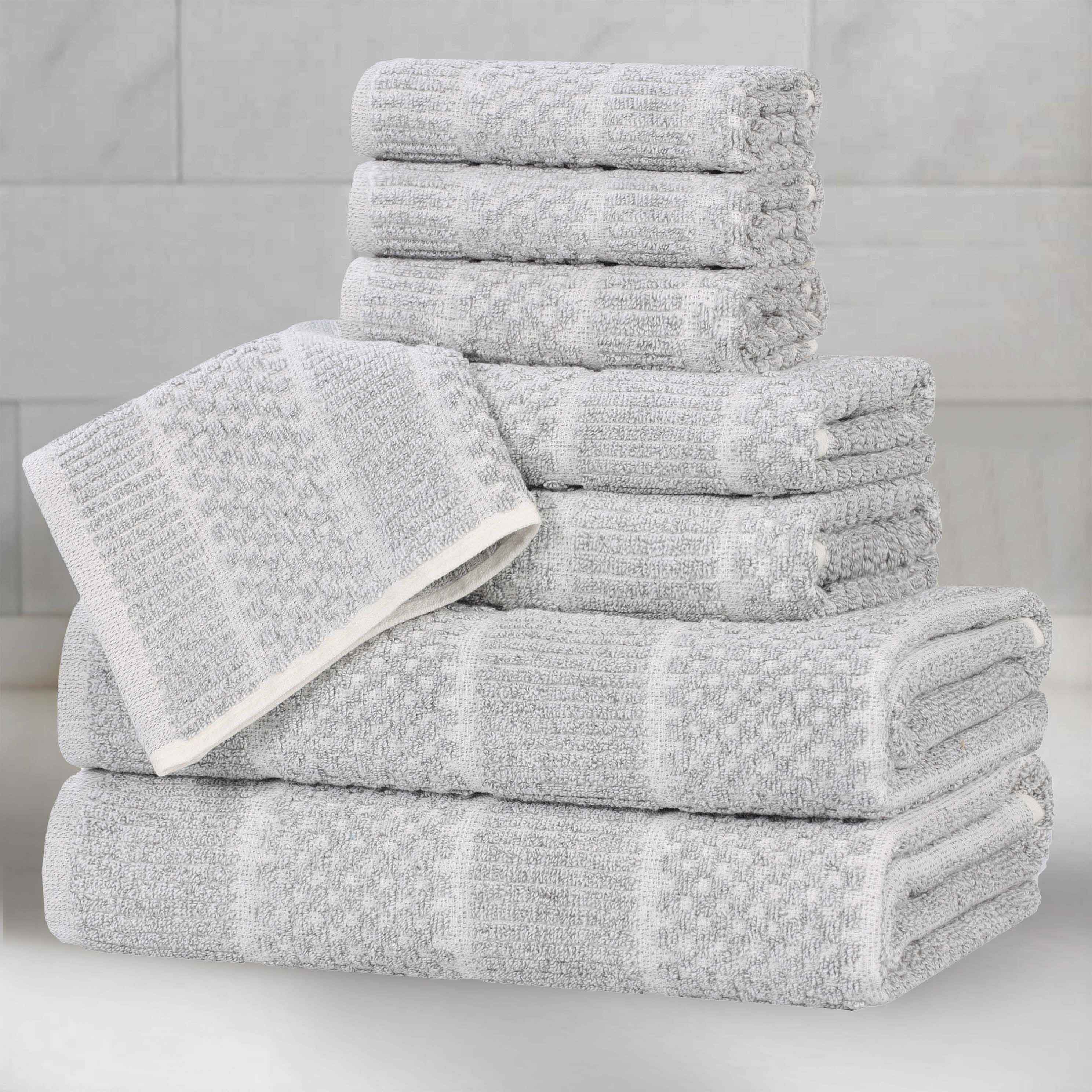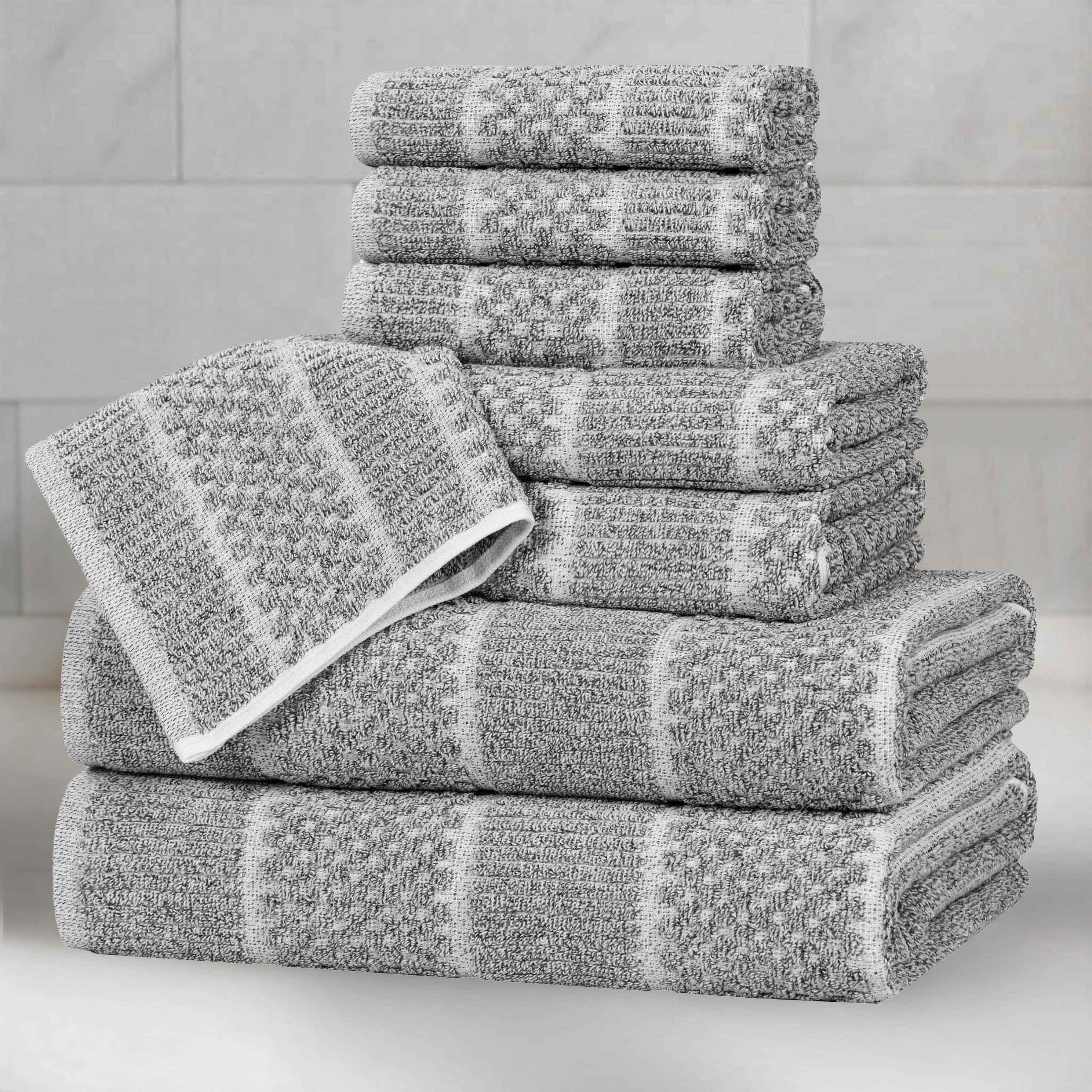 This 8-piece towel set is crafted from a cotton-viscose blend, offering a plush and absorbent feel. The towels come in a variety of neutral colors like beige, charcoal, denim blue, and platinum, making them a versatile addition to any modern bathroom. With multiple sizes in the set, they are suitable for different personal hygiene and light cleaning needs.