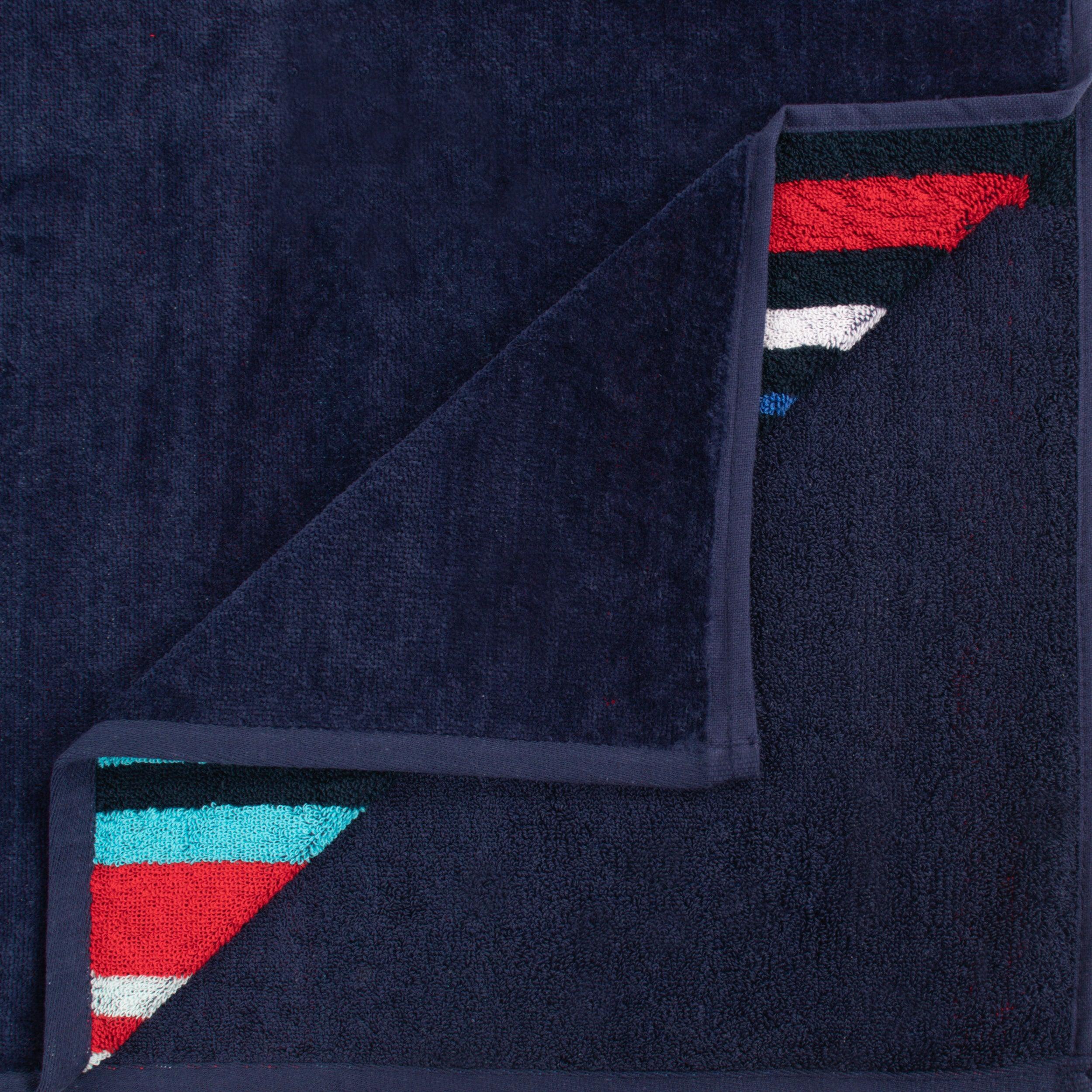 | Color & Design | Primary solid color: Dark navy blue; Striped pattern: Vibrant vertical stripes in red, bright blue, white, teal/aquamarine, and black; Dual design with one towel having solid top and striped bottom and the other vice – versa |