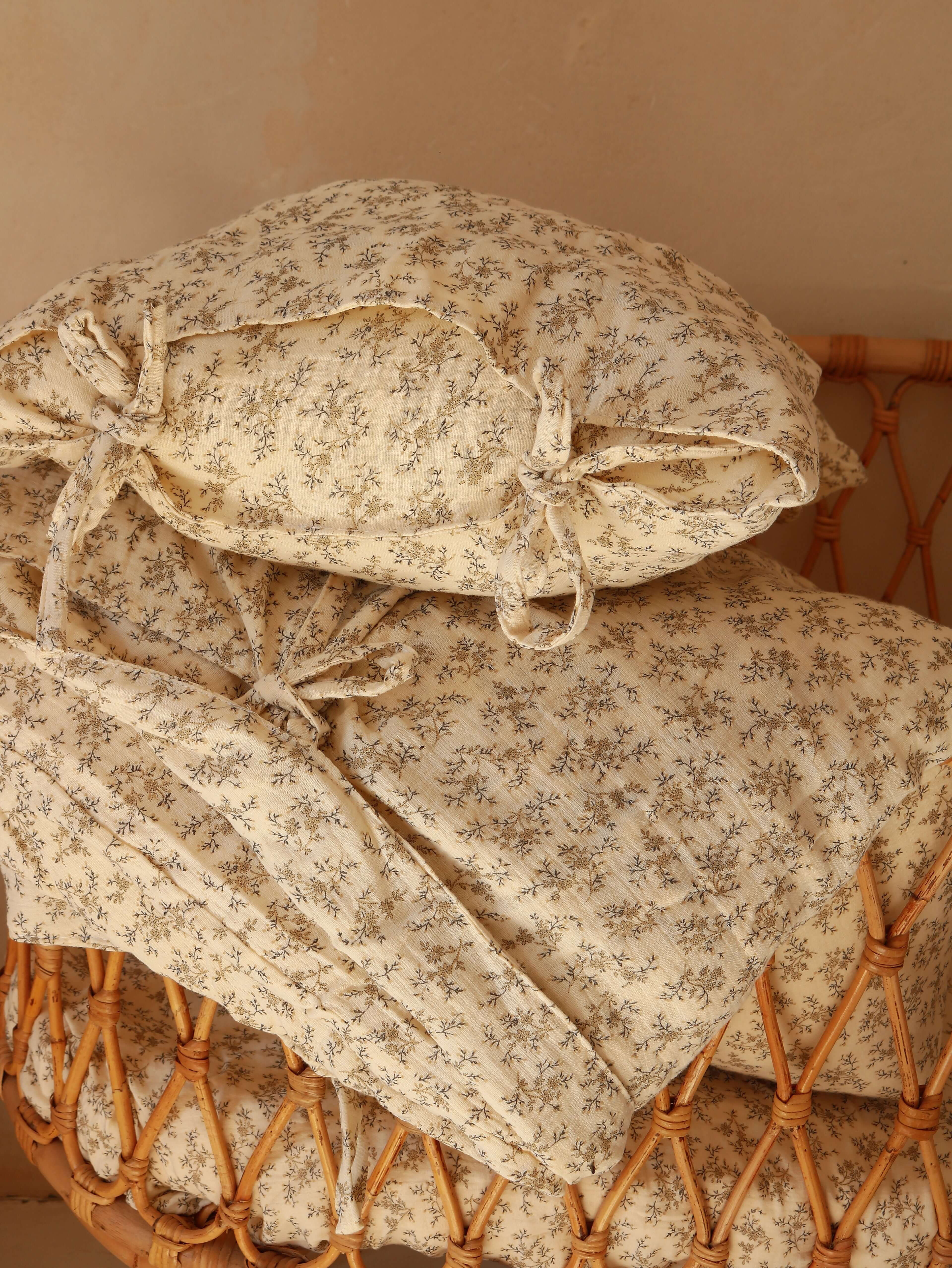 Bring a soft vintage touch into your home with the Neutral Retro Flowers bedding set. Made from breathable muslin cotton, this bedding is lightweight, gentle on sensitive skin, and beautifully decorated with a fine retro-inspired floral print in warm neutral shades. Its timeless design makes it easy to style in boho, romantic, or nature-inspired nurseries and bedrooms, creating a calm and welcoming atmosphere. Each set includes a duvet cover and pillowcase with cotton tie closures, adding a handcrafted detail while keeping everything securely in place. OEKO-TEX® certified and handmade in the Netherlands, it offers both artisanal quality and everyday comfort. Product Details Material: 100% muslin cotton – OEKO-TEX® certified Design: All-over retro floral pattern in neutral tones Closure: Cotton ties (no zippers or buttons) Set includes: 1 duvet cover + 1 pillowcase (all sizes) Sizes: Crib, toddler, junior, and single bed Care: Machine wash at 40 °C, gentle cycle; do not tumble dry; iron on low if needed Production time: 2–3 business days Handmade in the Netherlands by Matuu Perfect For Neutral and vintage-style nurseries Parents who love floral and timeless patterns Cozy toddler and kids’ beds Boho or nature-inspired interiors A thoughtful baby shower or birthday gift