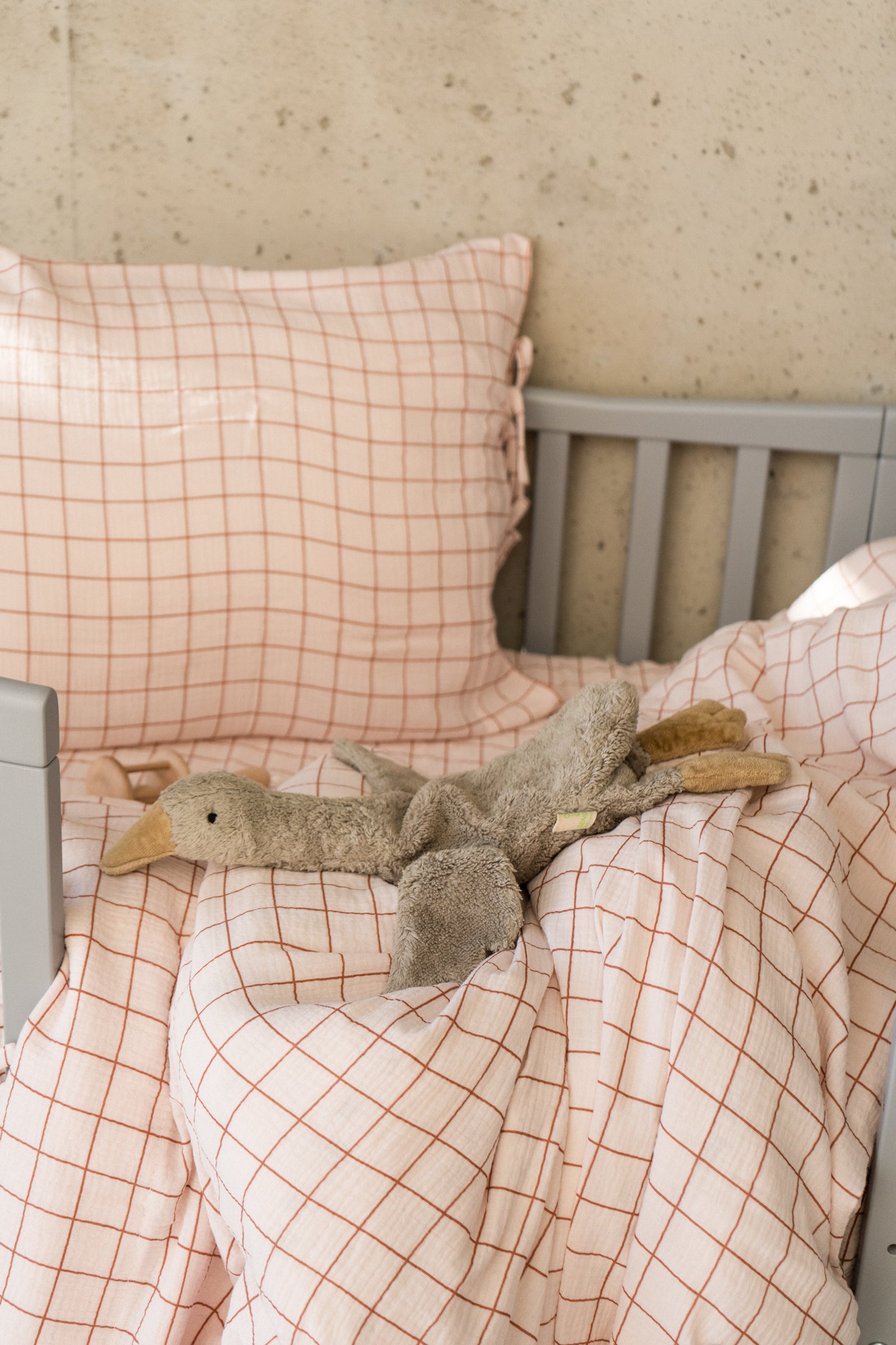 Soft yet striking – the Pink Checked bedding set with powder pink background and dark pink minimalist checkcombines subtle charm with a modern twist. Made from breathable muslin cotton, this bedding feels light and cozy, while the elegant two-tone pink design brings warmth and personality to your nursery or kids’ room. Each set includes a duvet cover and pillowcase, both finished with cotton ties instead of zippers or buttons for a clean, handcrafted look. Lightweight, durable, and OEKO-TEX® certified, this bedding is safe for sensitive baby skin and comfortable for toddlers and kids alike. Carefully handmade in the Netherlands, it offers timeless quality with a fresh, contemporary style. Product Details Material: 100% muslin cotton – OEKO-TEX® certified Design: Powder pink background with minimalist dark pink check pattern Closure: Cotton ties (no zippers or buttons) Set includes: 1 duvet cover + 1 pillowcase (all sizes) Sizes: Crib, toddler, junior, and single bed Care: Machine wash at 40 °C, gentle cycle; do not tumble dry; iron on low if needed Production time: 2–3 business days Handmade in the Netherlands by Matuu Perfect For Playful yet minimalist nurseries Parents looking for soft pink tones with a bold detail Cozy toddler and kids’ rooms Boho, modern, or Scandinavian-inspired interiors A charming birthday gift