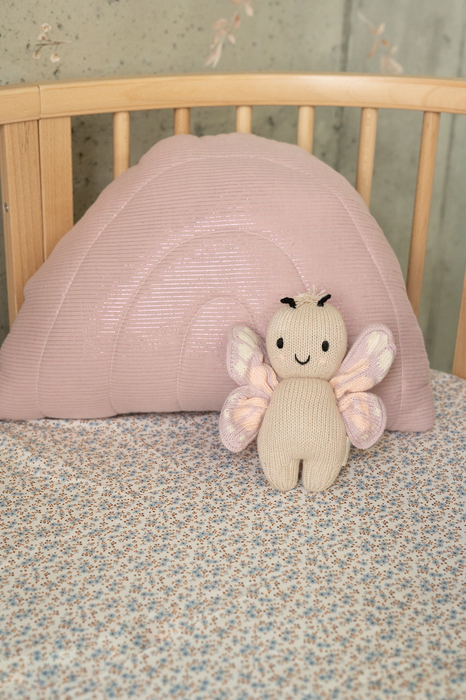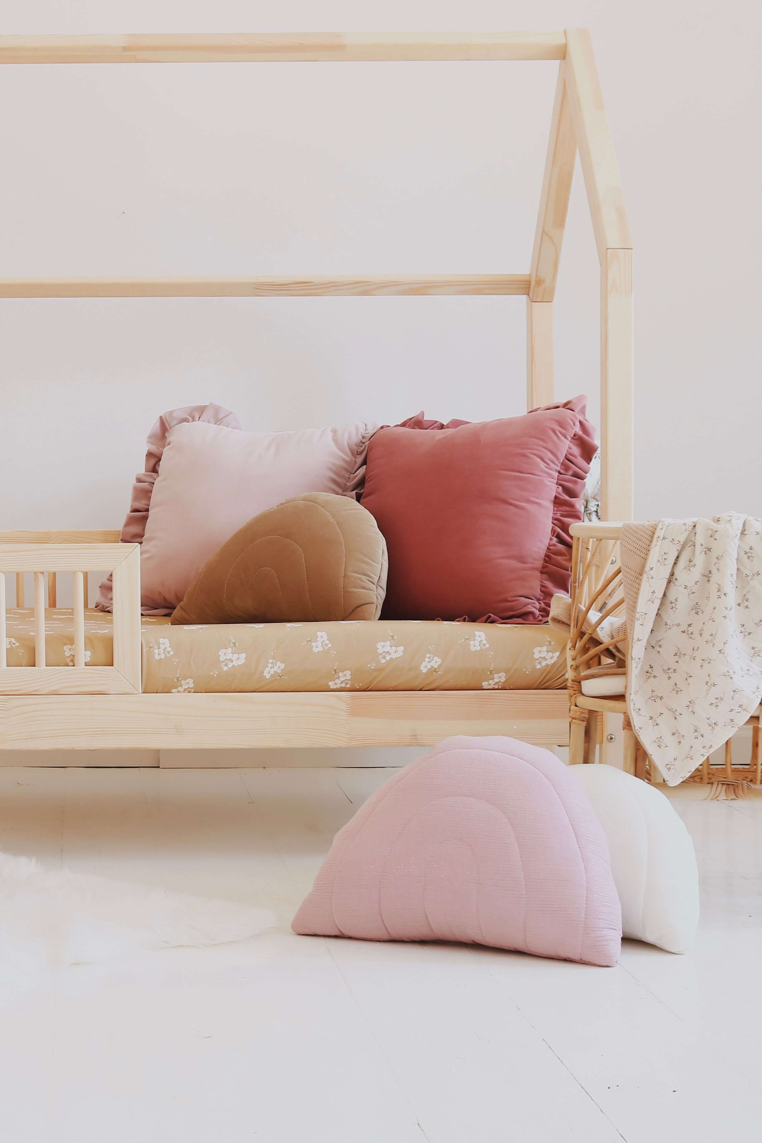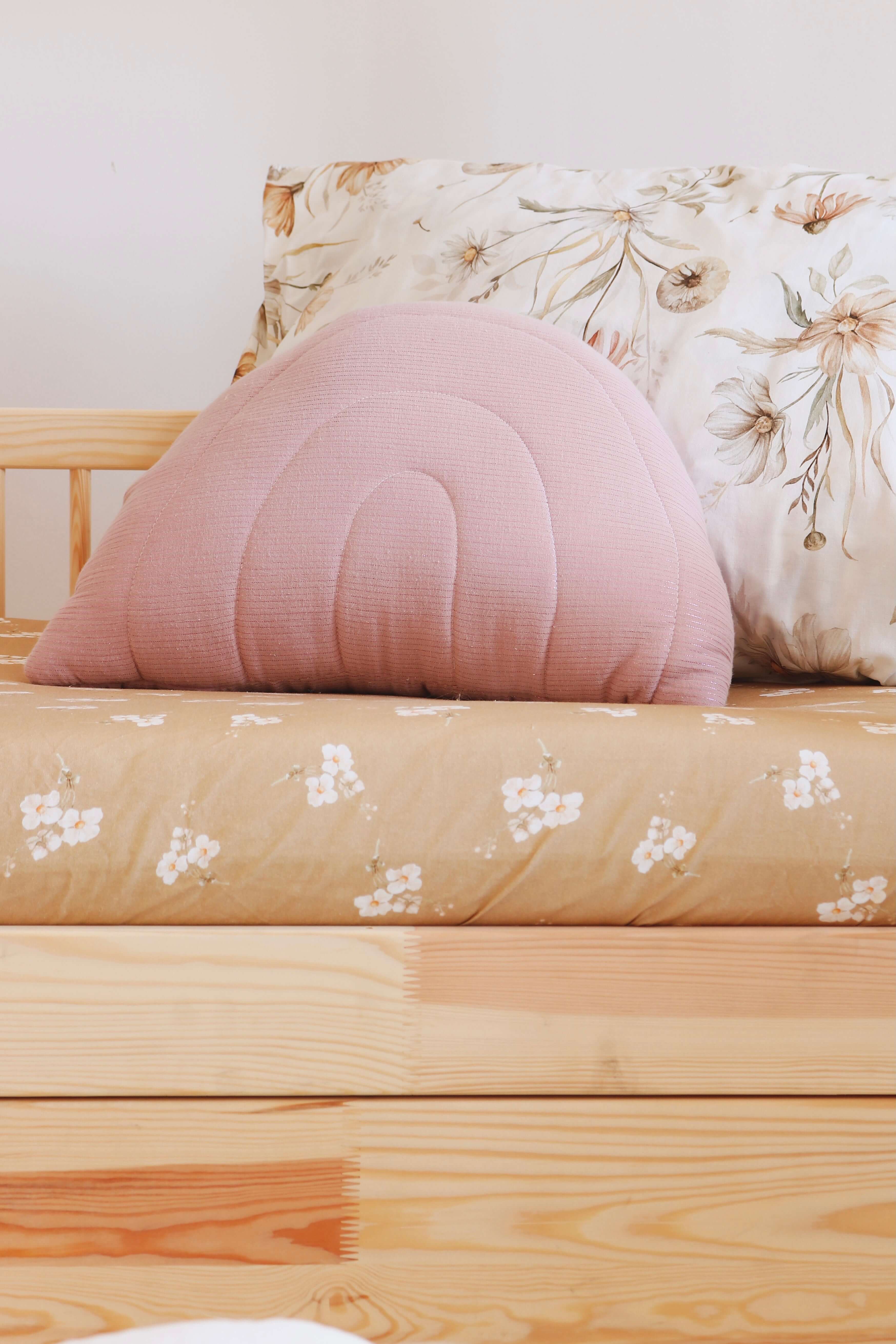 Double side lovely soft pillow in the shape of a rainbow. Perfect decoration and toy for child’s room or play corner. Pink muslin fabric on the one side, and pink muslin with golden dots in the same color on the other. Dimensions: height: 35 cm, width: 45 cm Fabric : cotton muslin fabric Filled with light and soft silicone balls Processing time: 1-3 work days Designed and made/ quilted by hand, in Amsterdam, the Netherlands